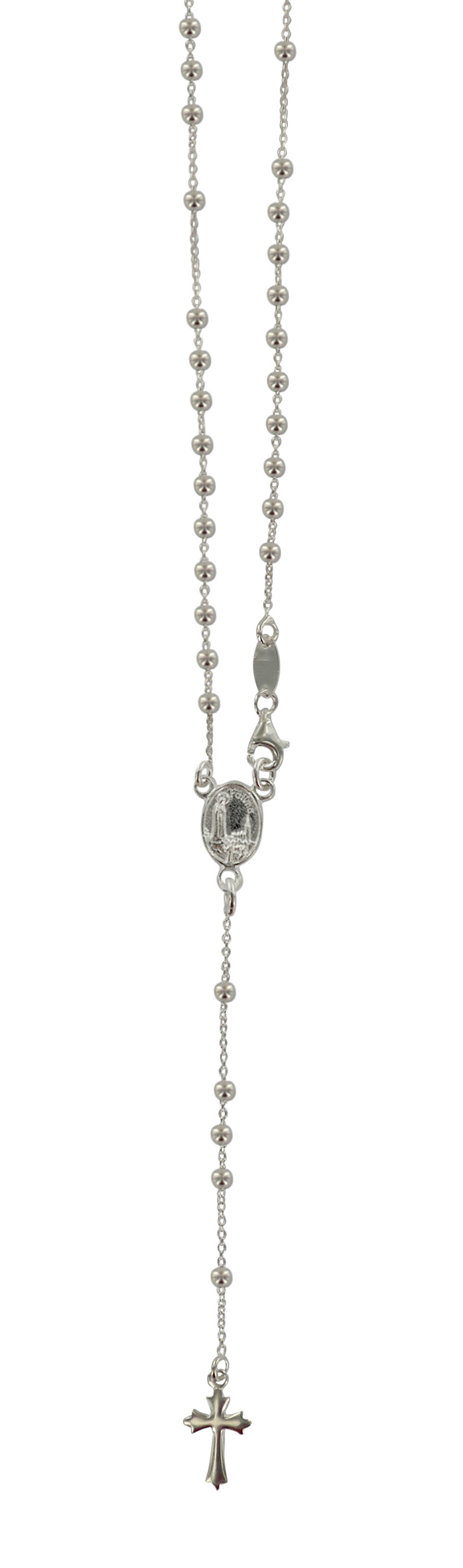 Il rosario si presenta con grani di mm 4 lucidi. La crociera ovale rappresenta la Madonna di Fatima e misura cm 1,2 mentre la croce anch'essa in argento lucido misura cm 1,5.