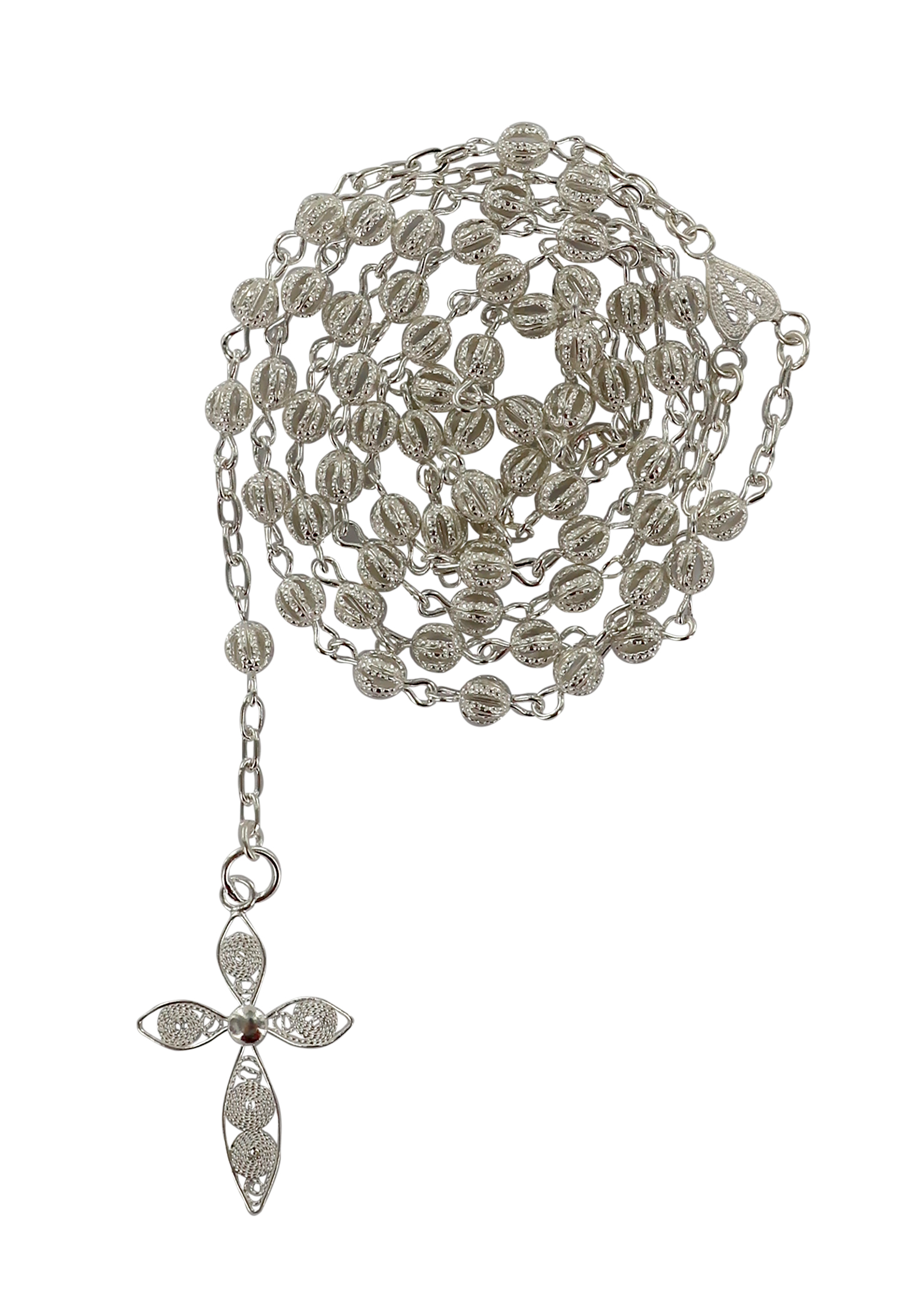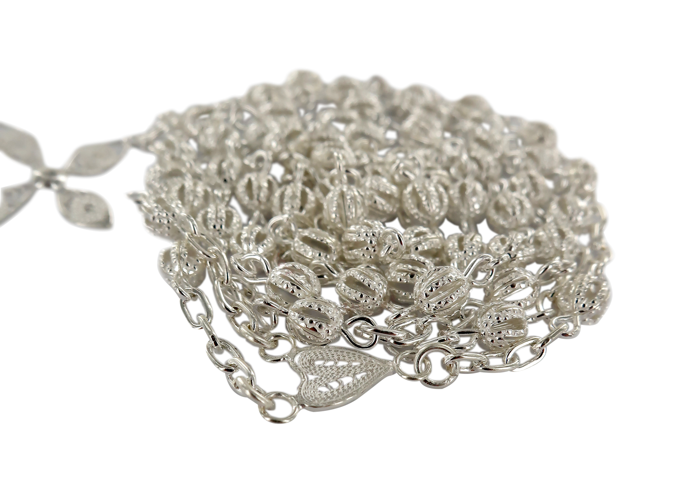 Il rosario è in preziosa filigrana, rilegato a mano e con croce e crociera anch'esse in filigrana.