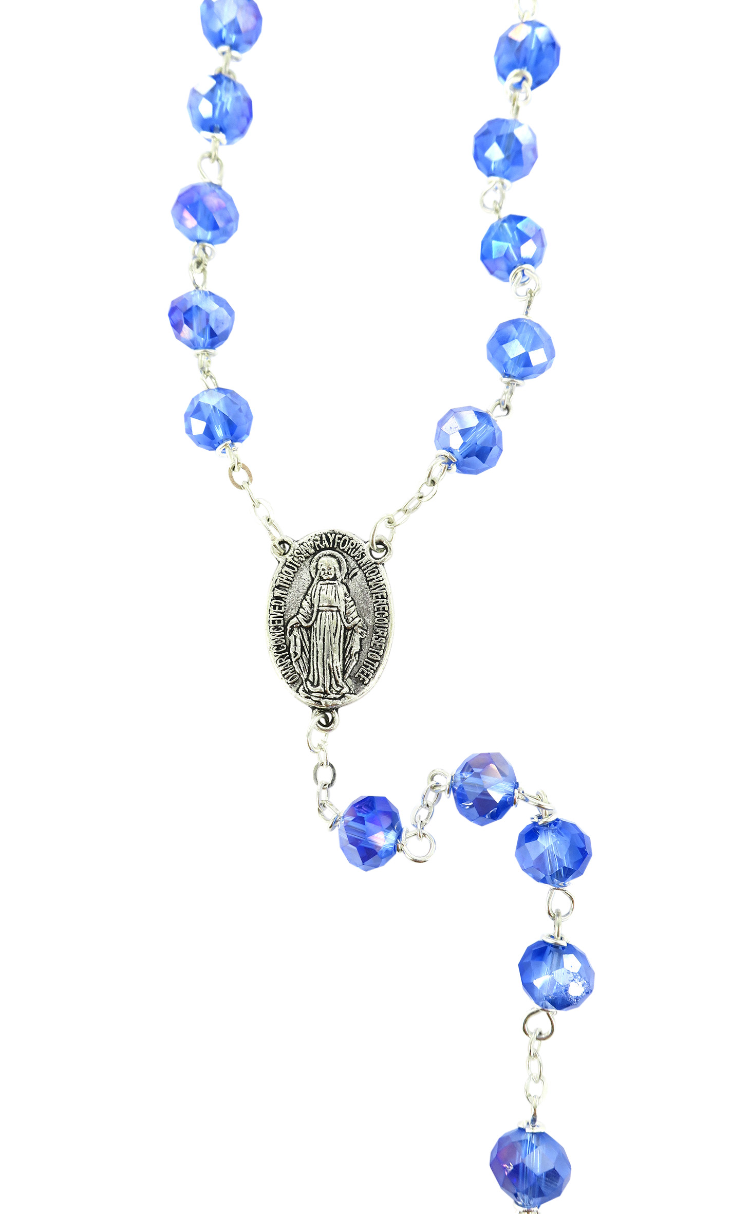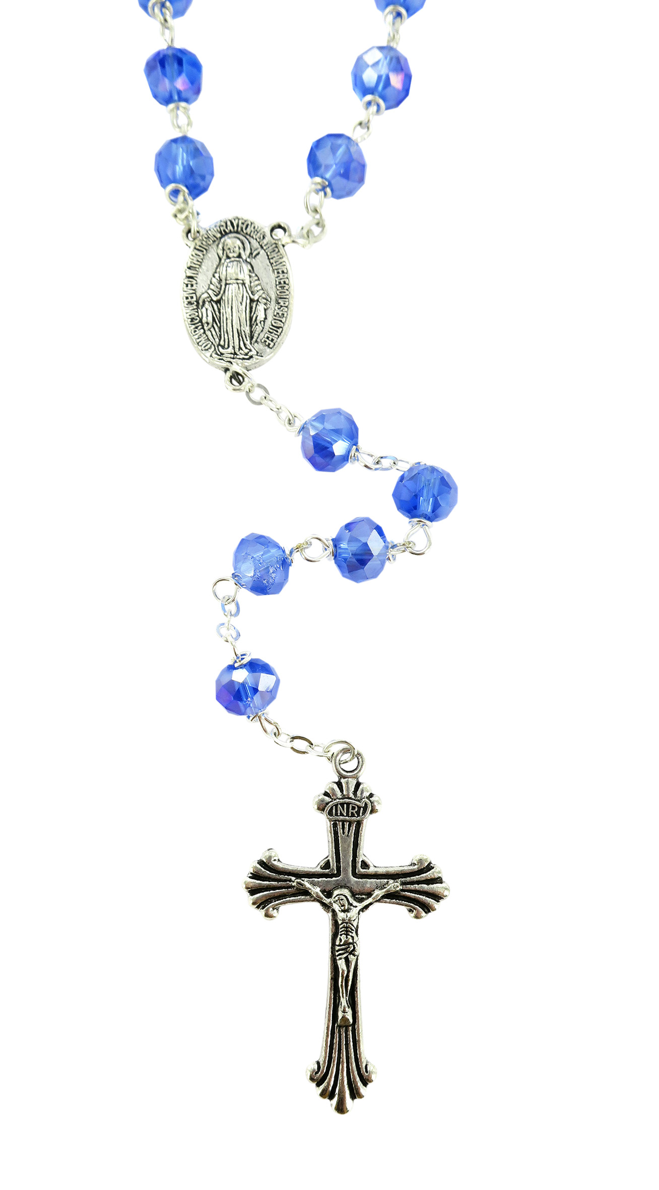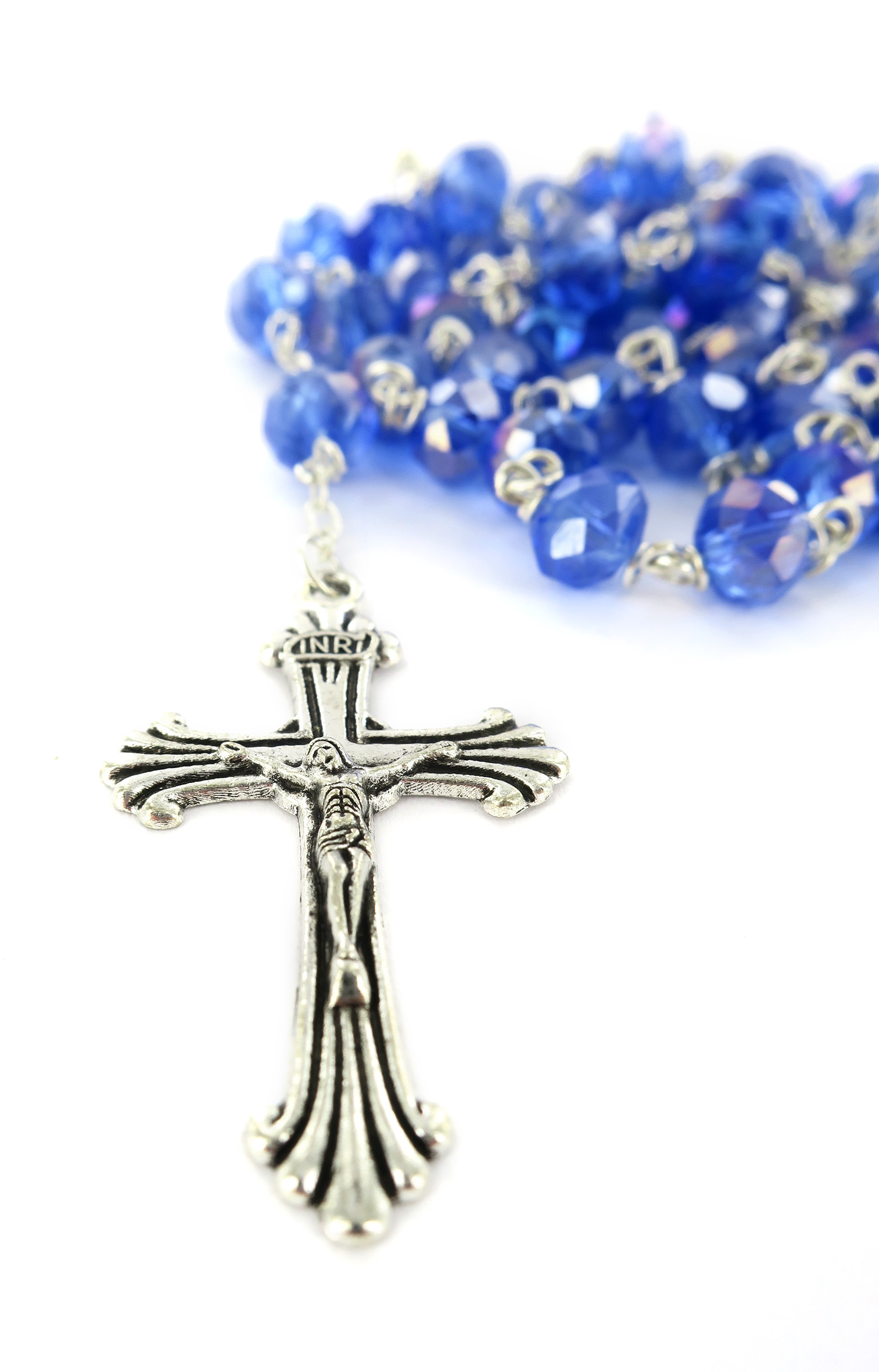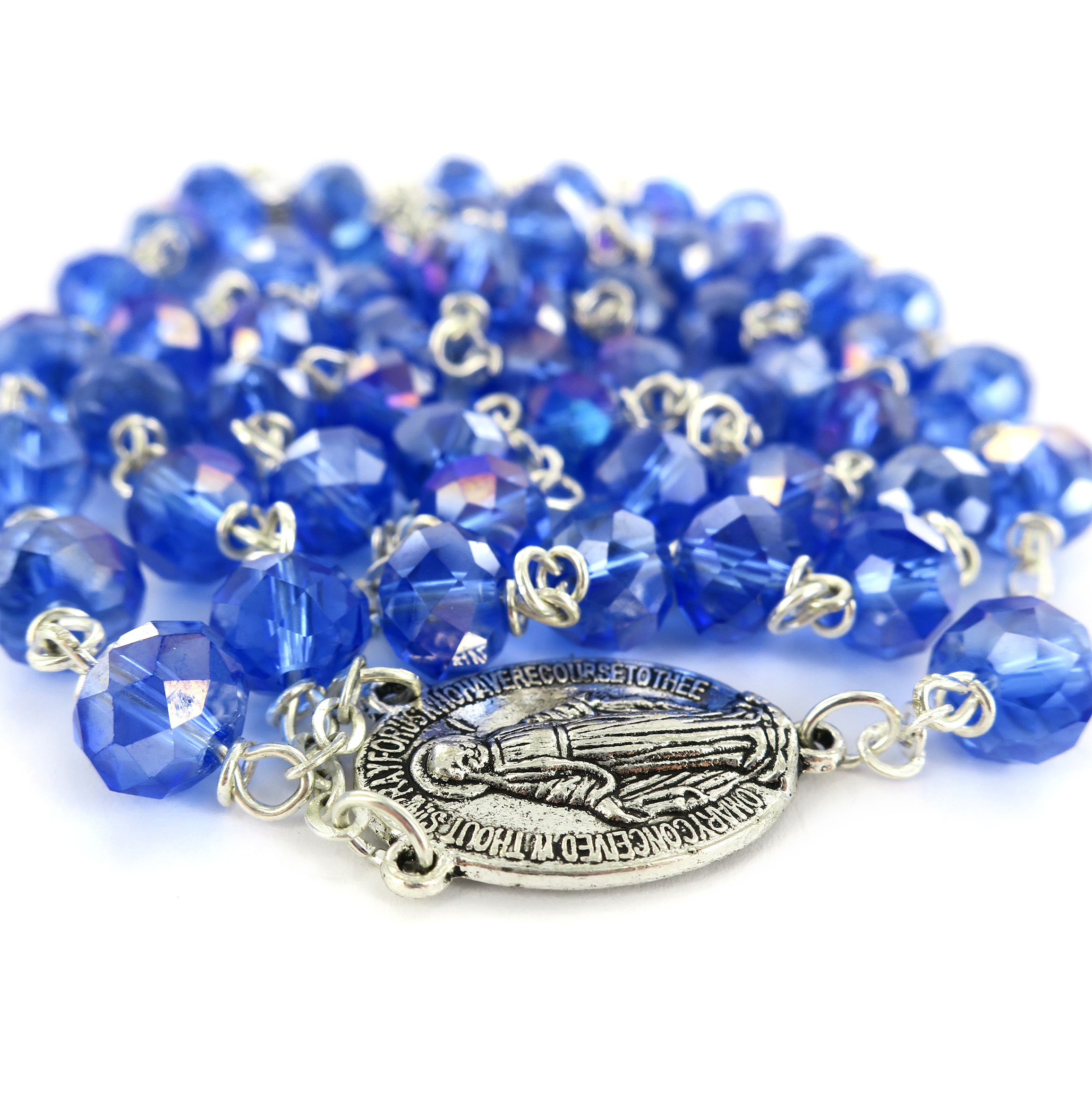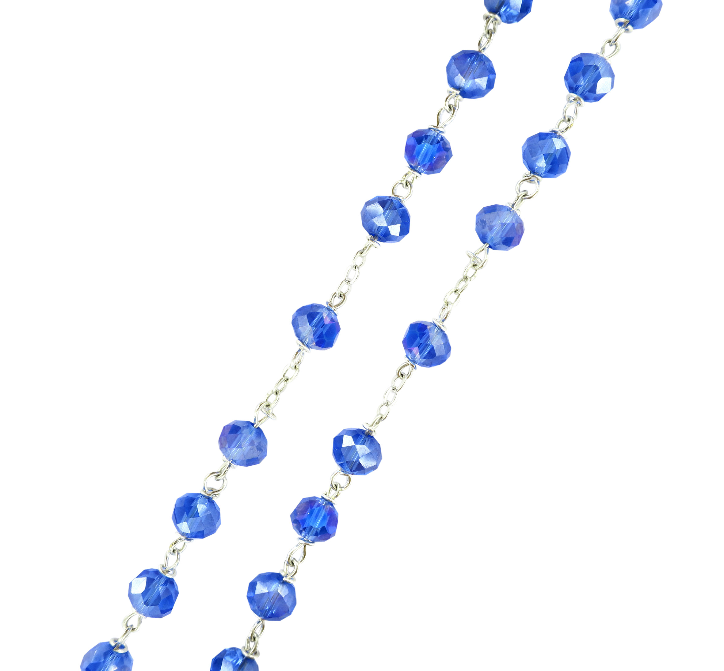 Prezioso rosario in cristallo sfaccettato blu con legatura a mano in metallo, disponibile con grani di diametro 8 mm. Il grano è pieno, brillante e luminoso. La legatura è particolarmente robusta: detta eterna, è una legatura speciale, in cui i grani sono incatenati tra loro con un anello chiuso che li unisce saldamente tra di loro.
