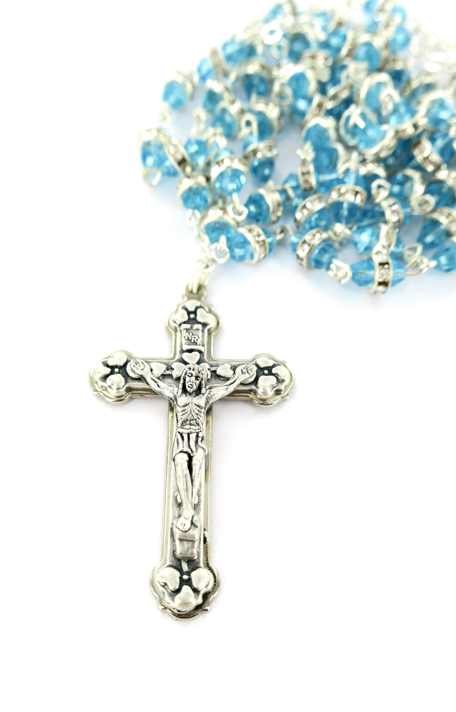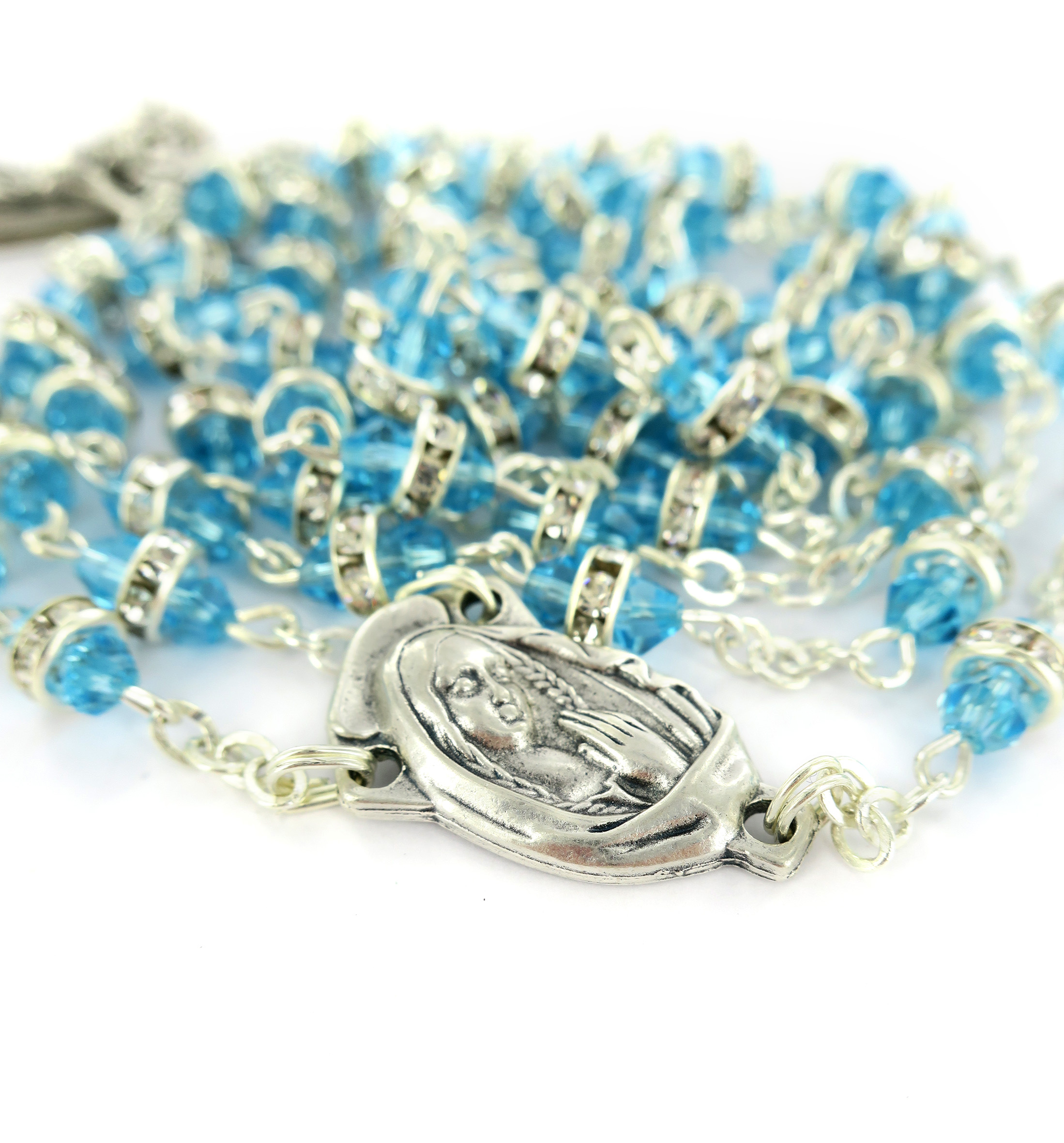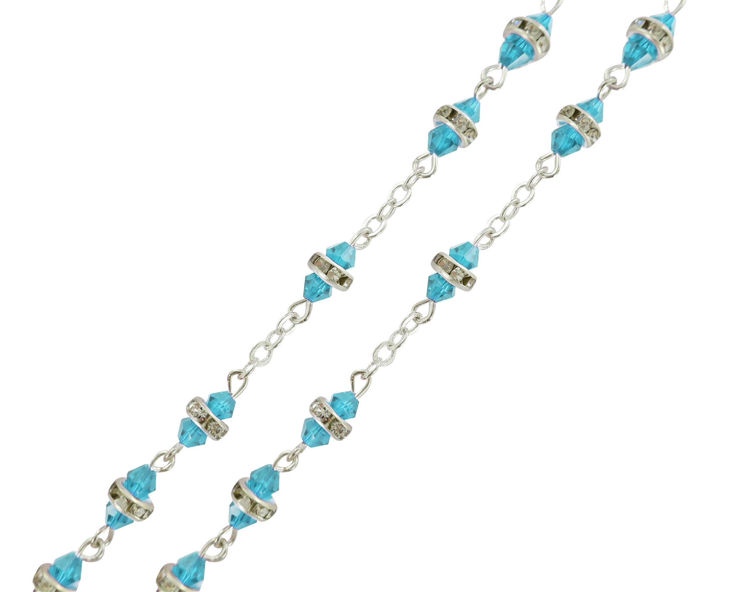 La luminosità di questo rosario,rilegato a mano in metallo argentato, è dovuta ai grani in semicristallo trasparente acqua marina impreziositi da un piccolo anello in strass bianchi.