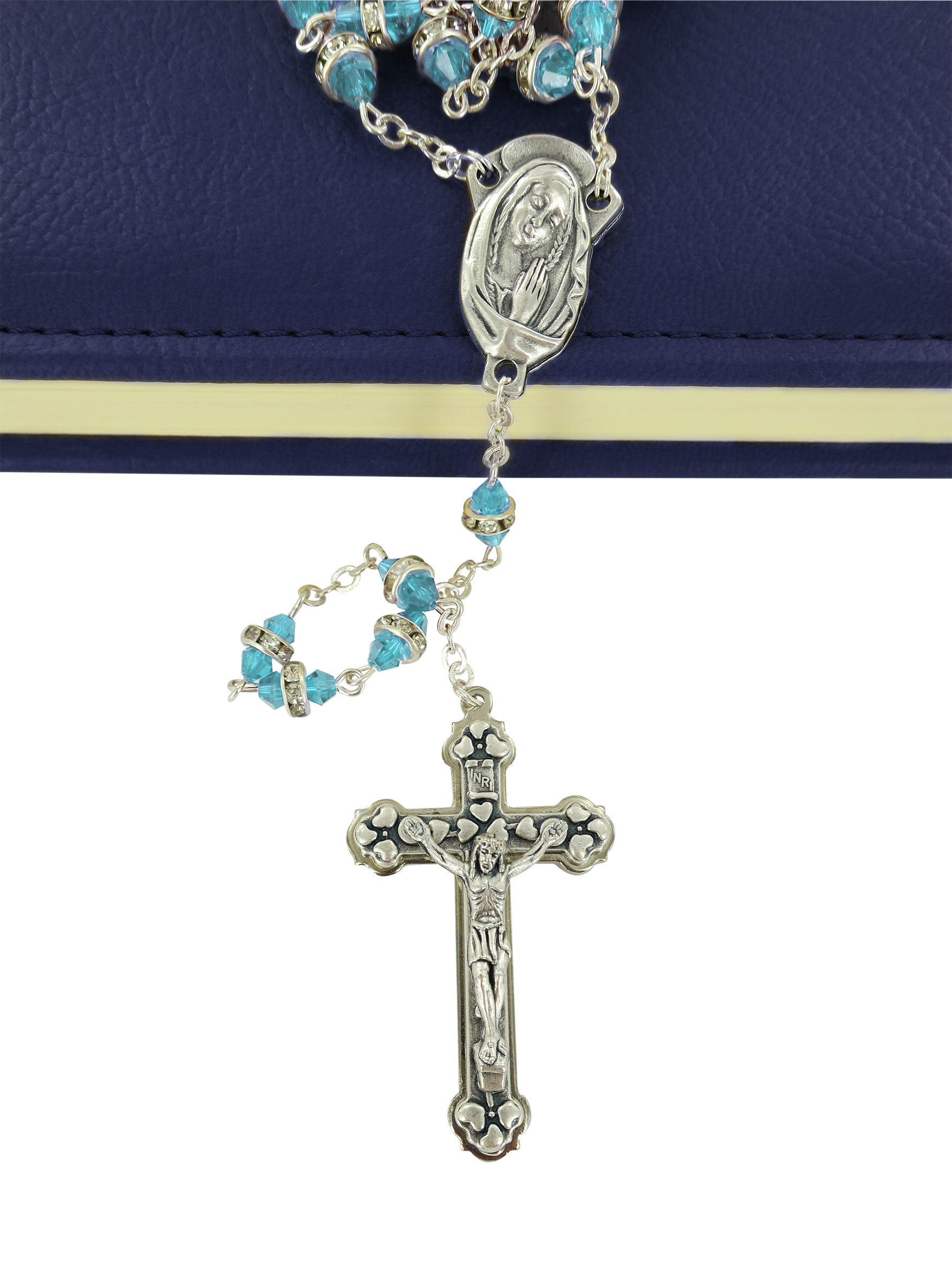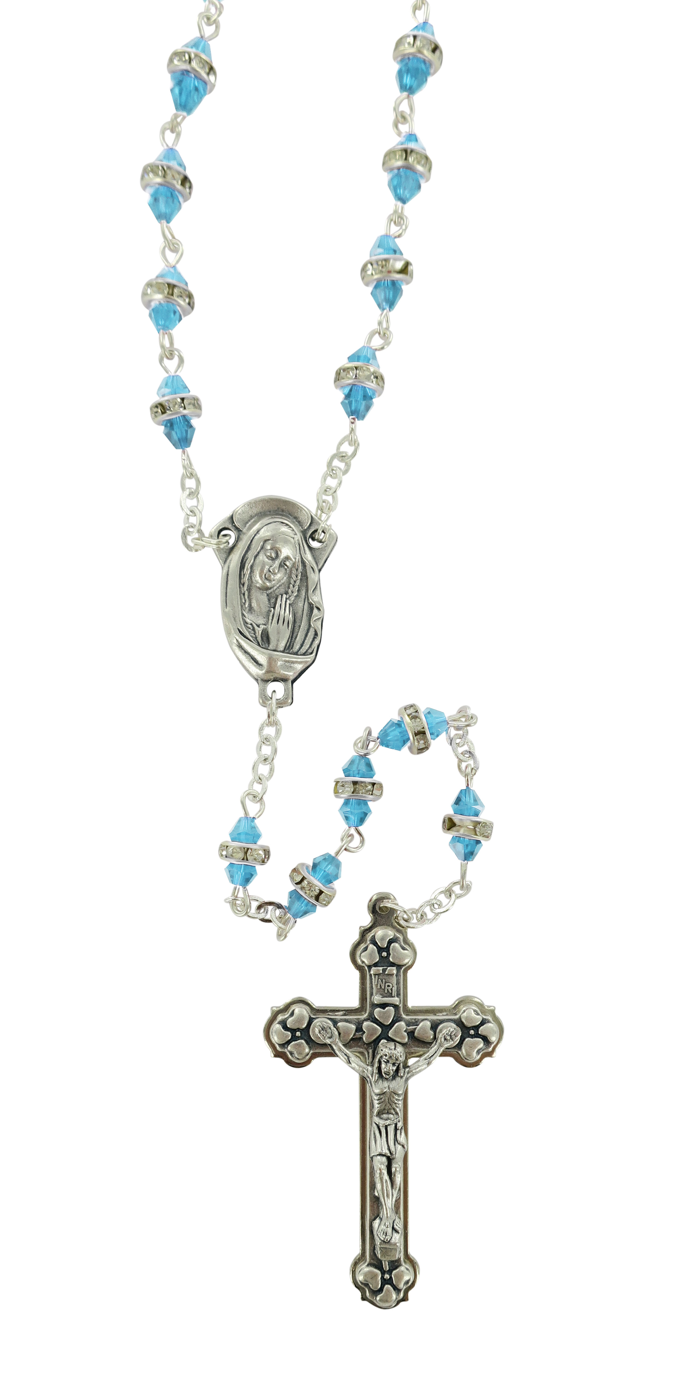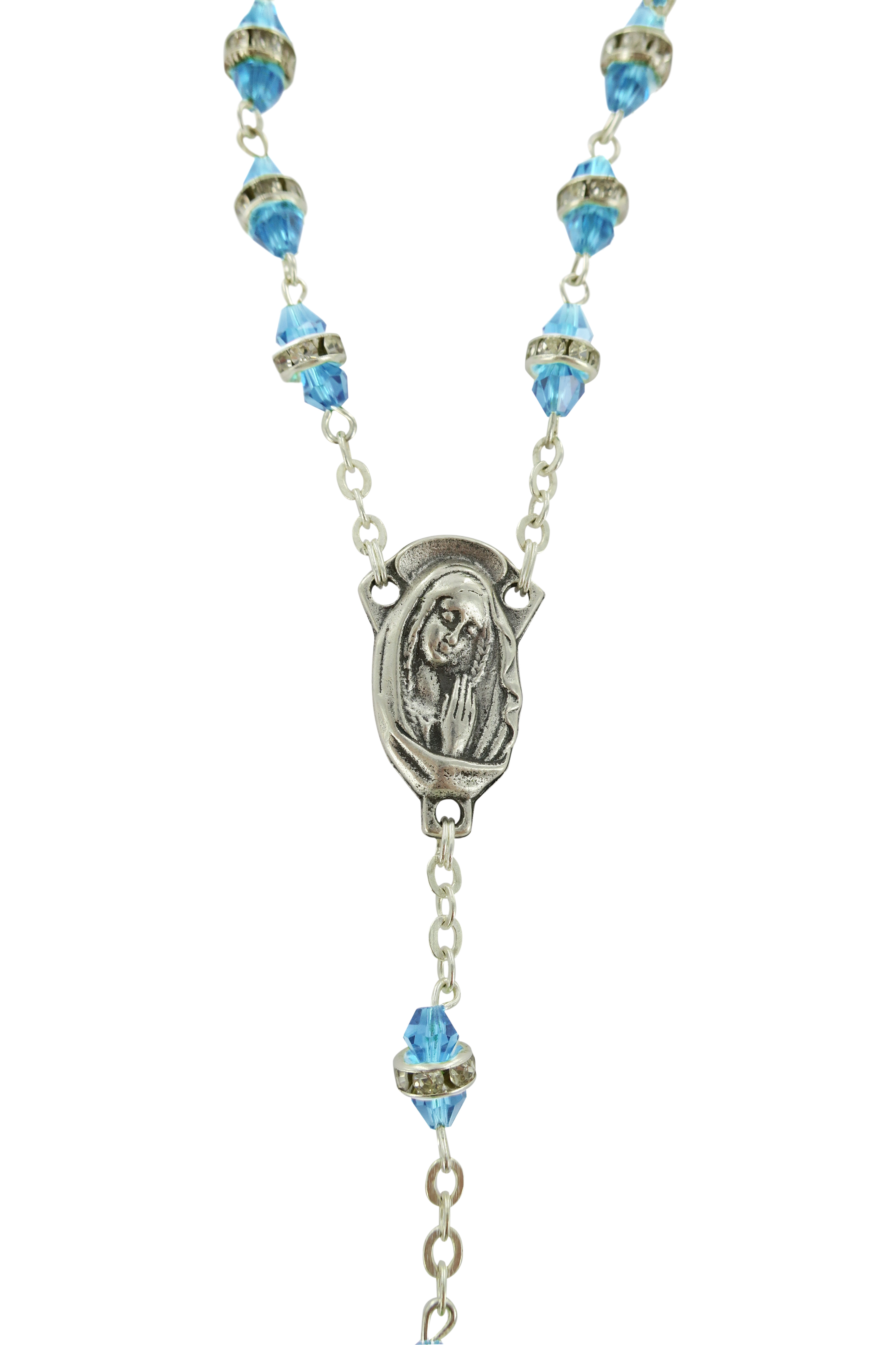 La luminosità di questo rosario,rilegato a mano in metallo argentato, è dovuta ai grani in semicristallo trasparente acqua marina impreziositi da un piccolo anello in strass bianchi.