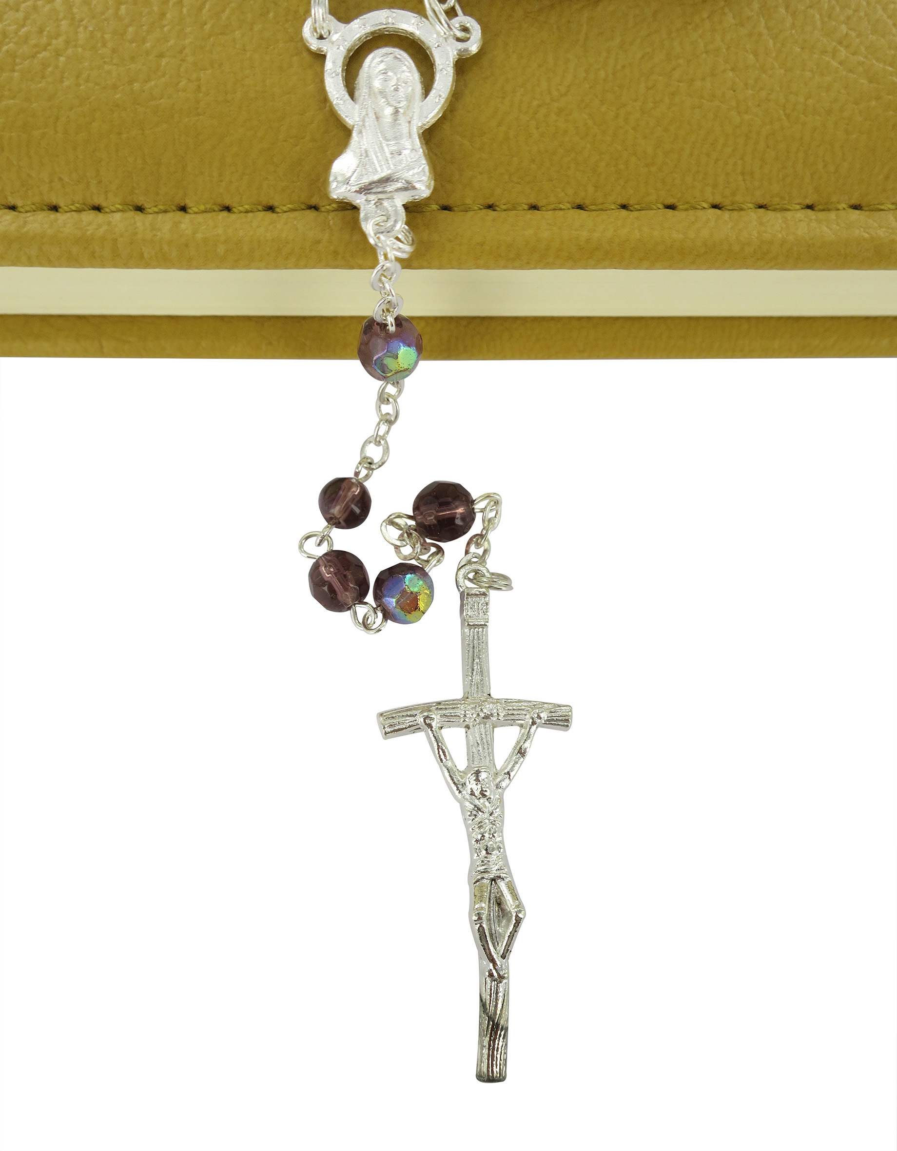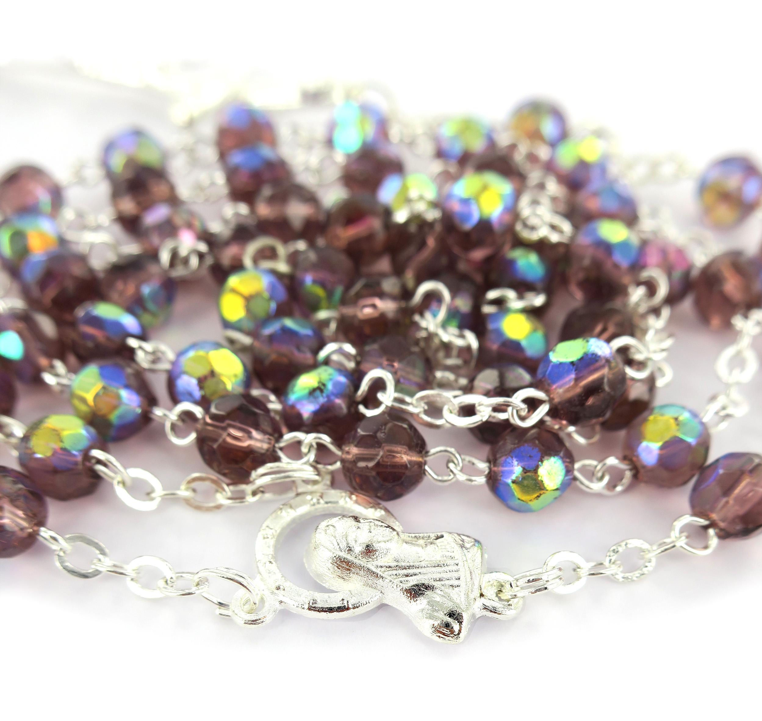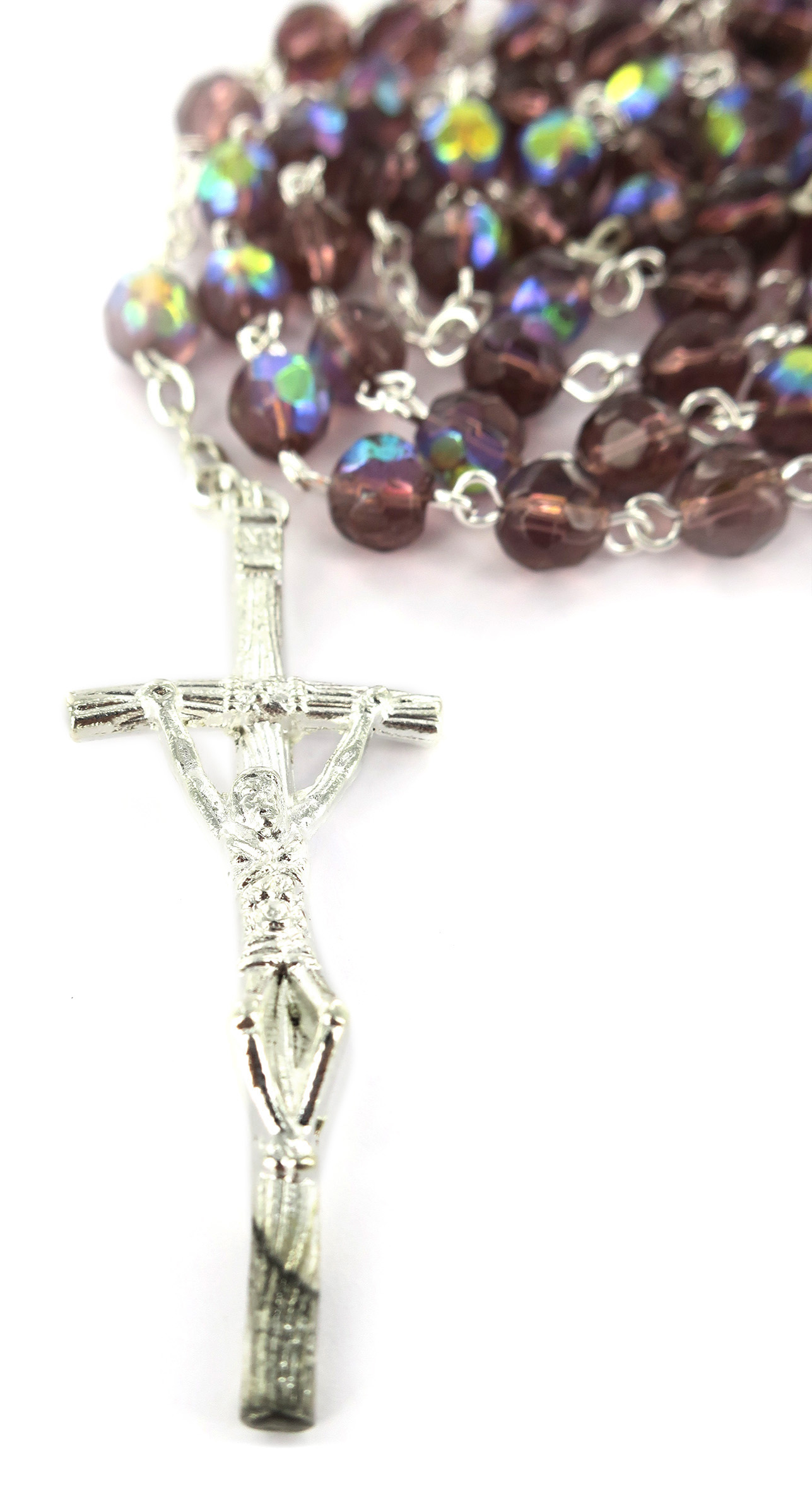 Rosario con grani in semicristallo di colore ametista la cui misura è 6 millimetri.