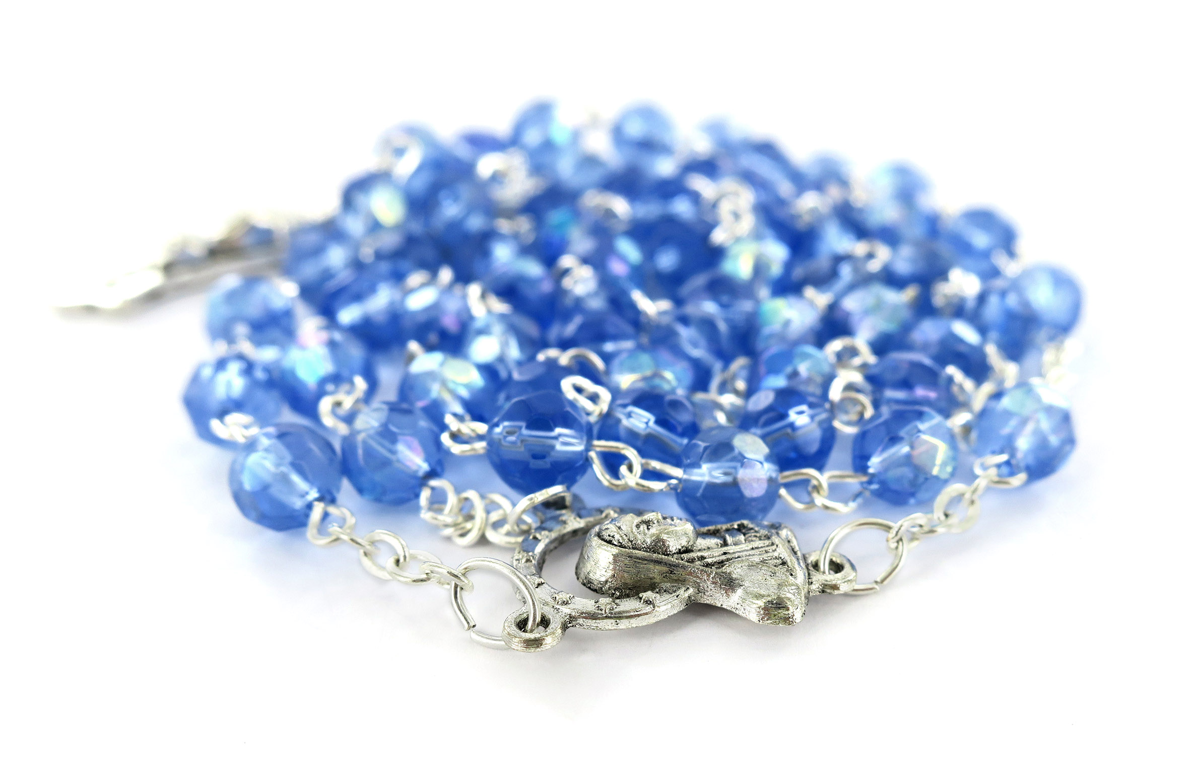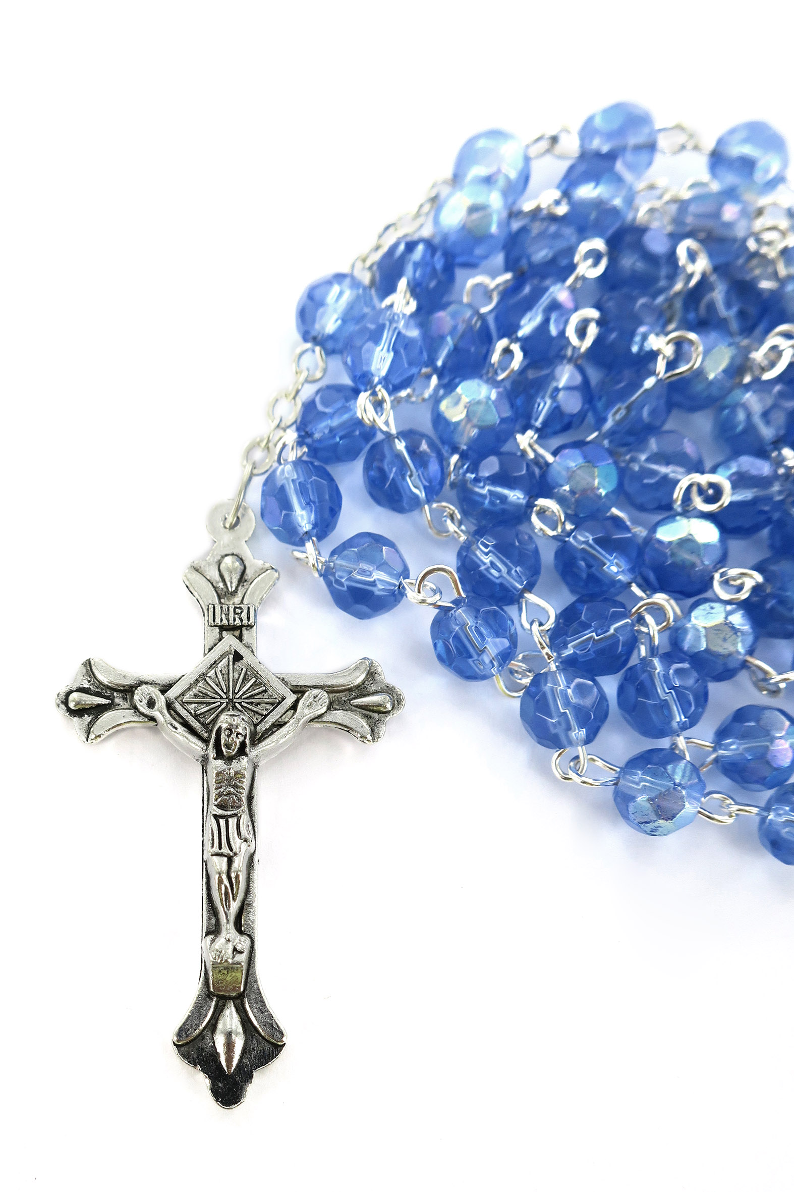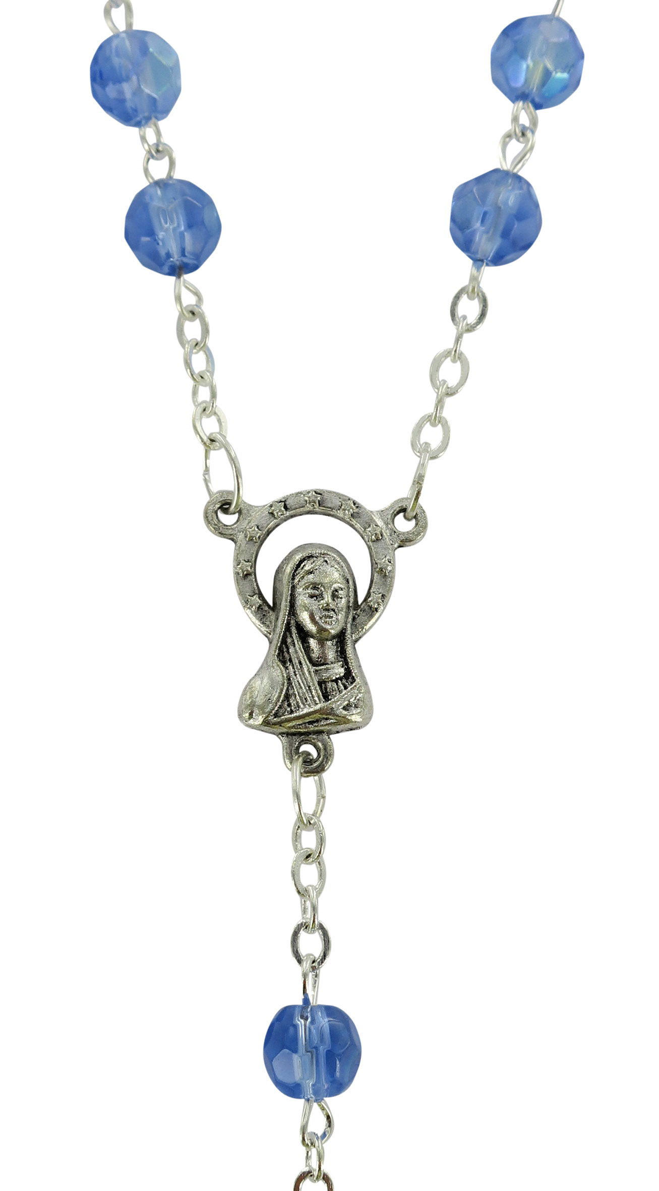 Rosario con grani in semicristallo di colore azzurro la cui misura è 6 millimetri.