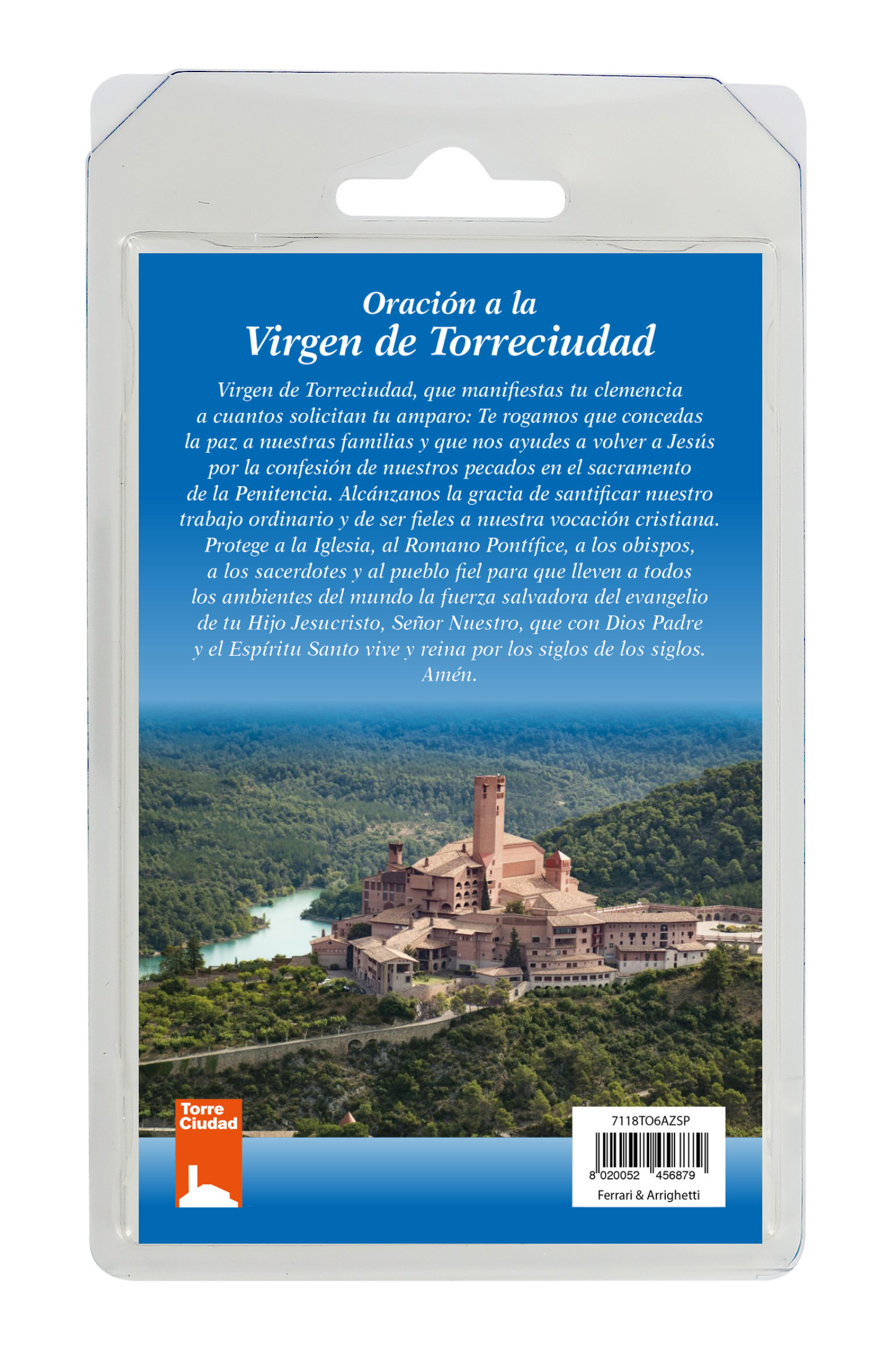 Si presenta confezionato in una scatolina in plastica rigida trasparente al cui interno troviamo un cartoncino con l'immagine della Vergine di Torreciudad sul cui retro è stampata una preghiera.