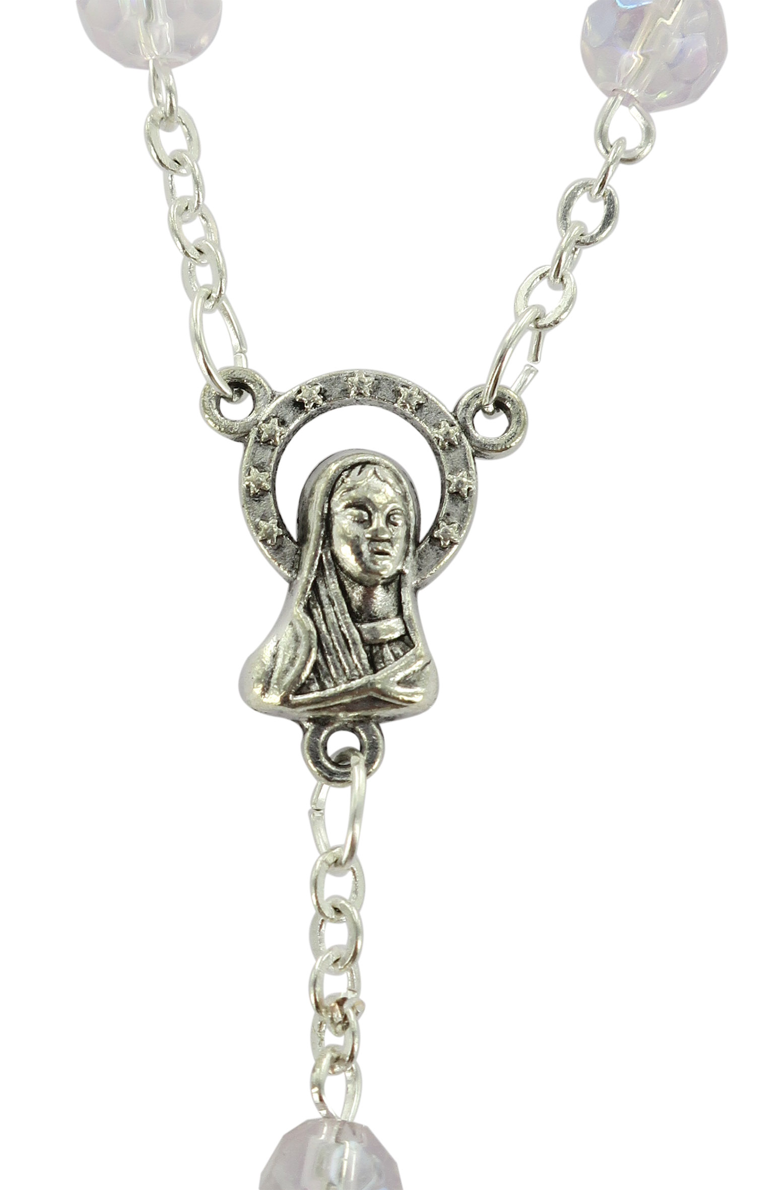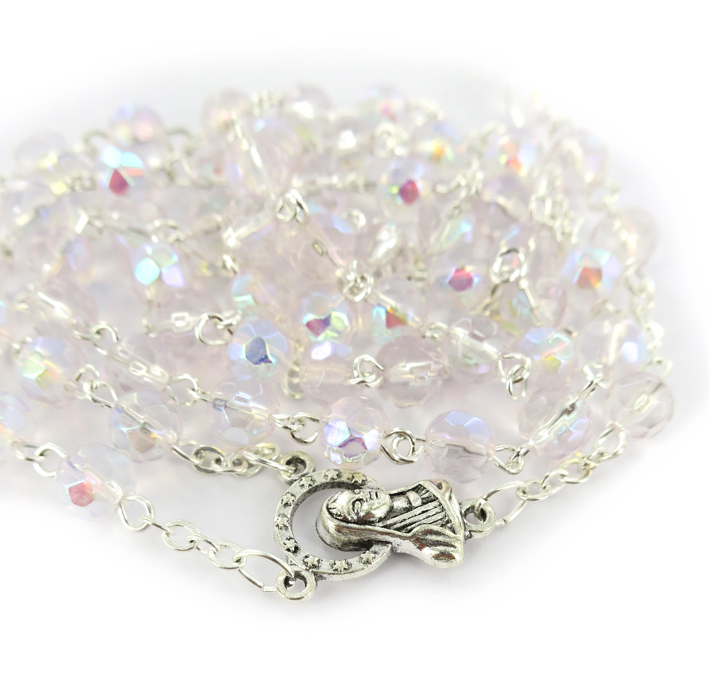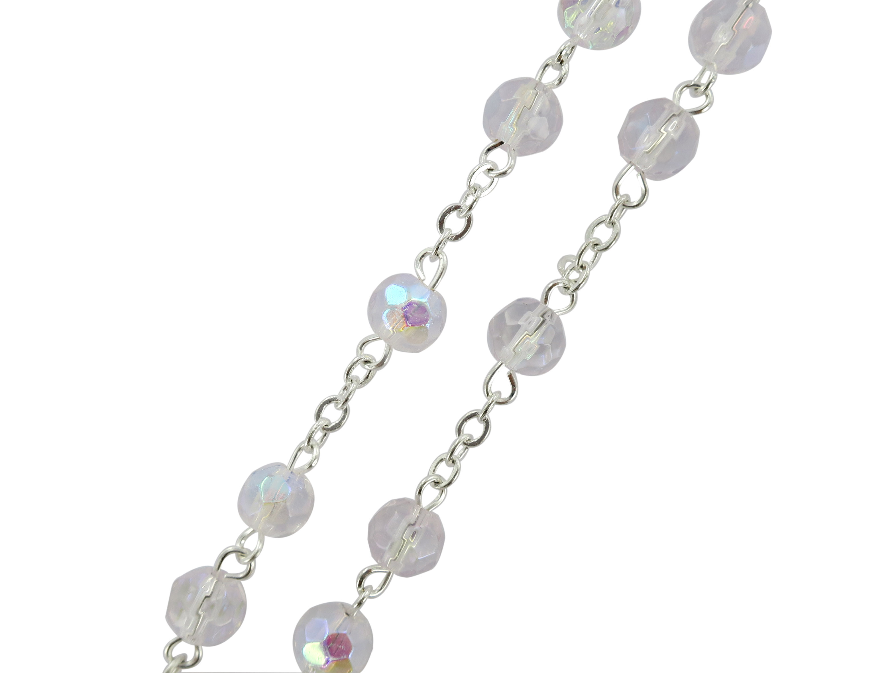 Rosario con grani in semicristallo di colore bianco la cui misura è 6 millimetri.