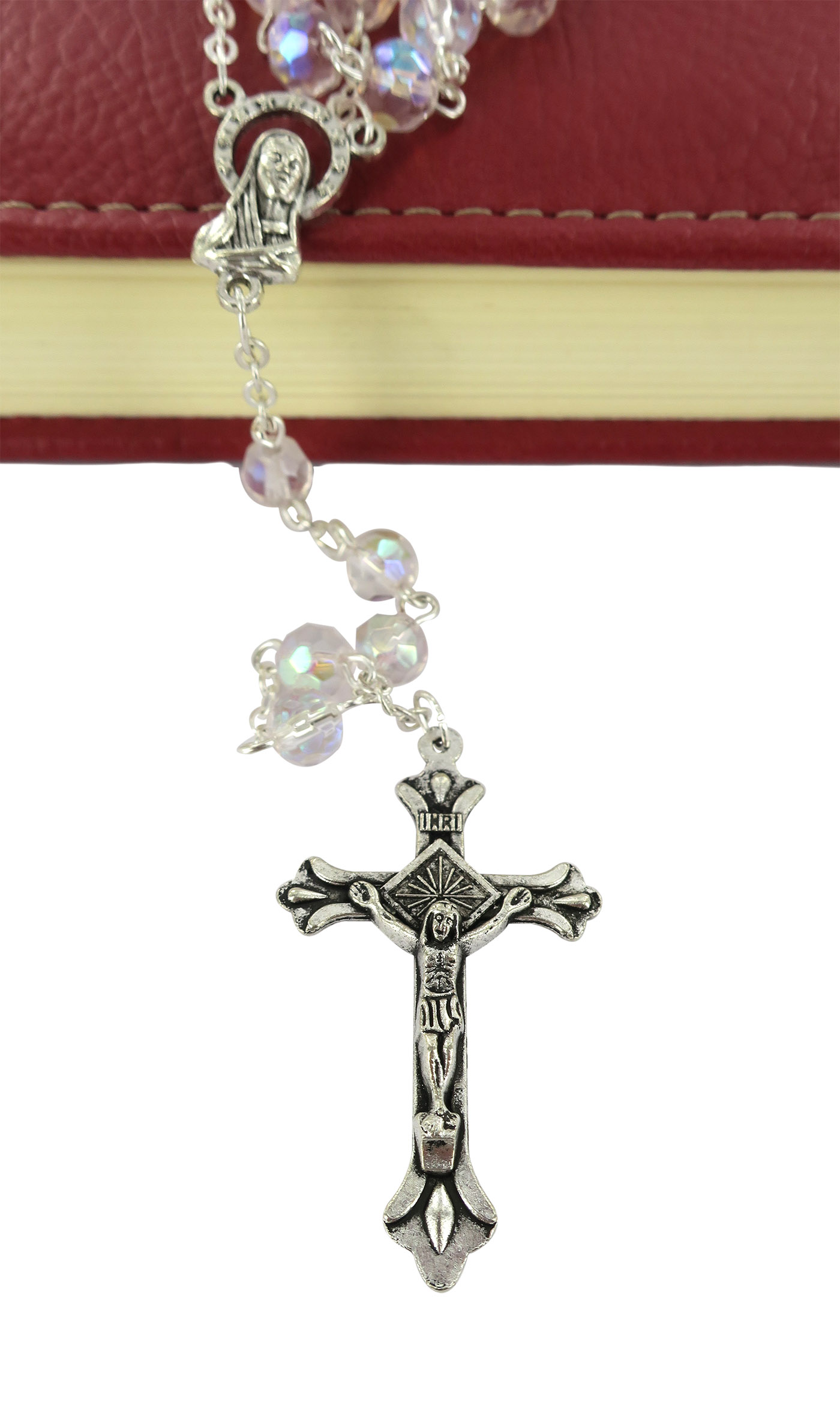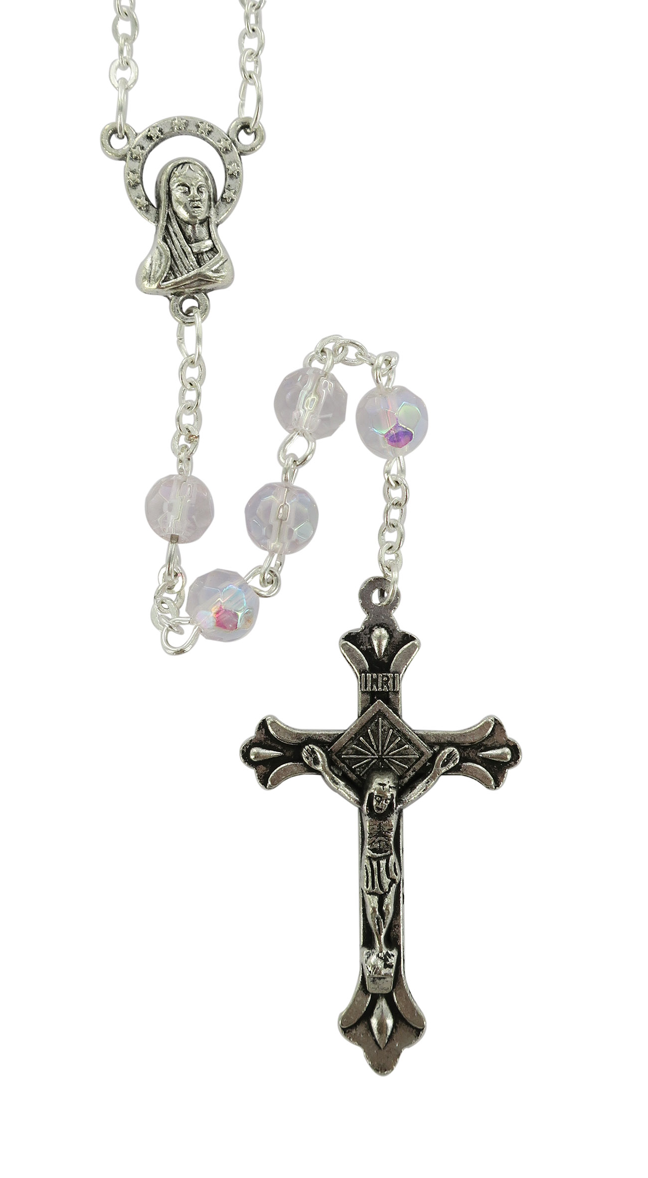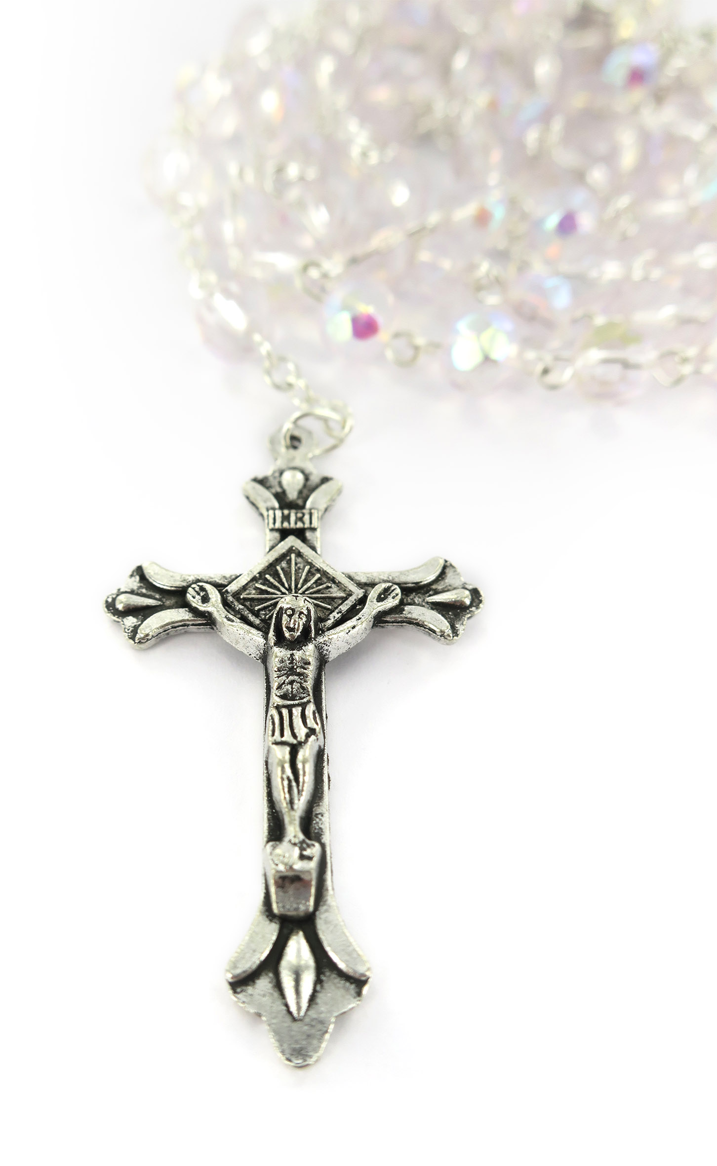Rosario con grani in semicristallo di colore bianco la cui misura è 6 millimetri.