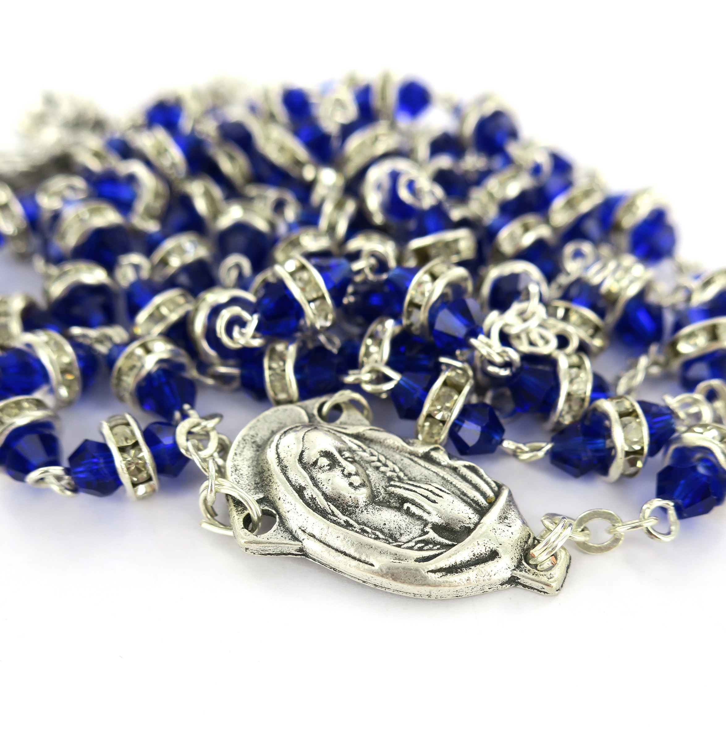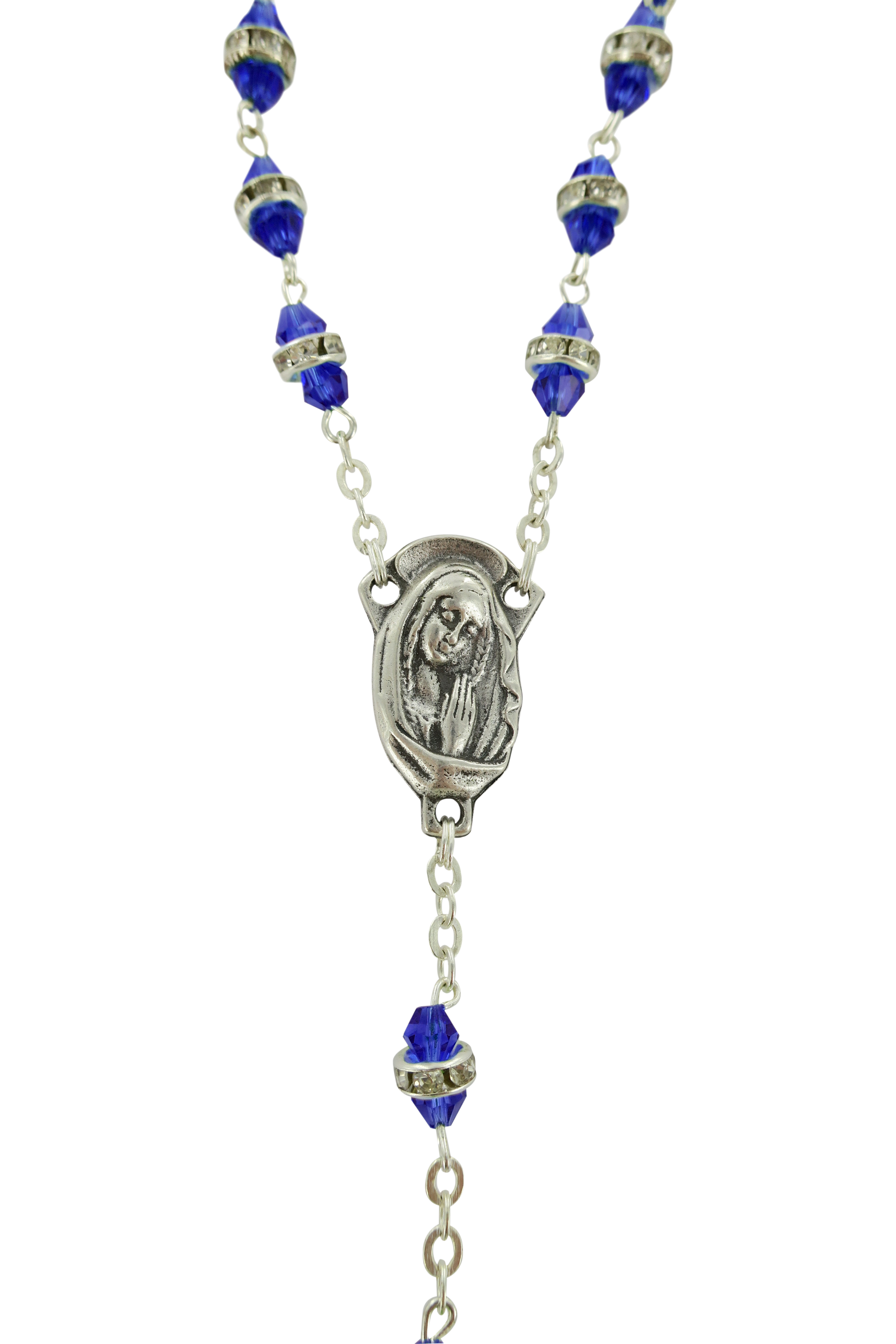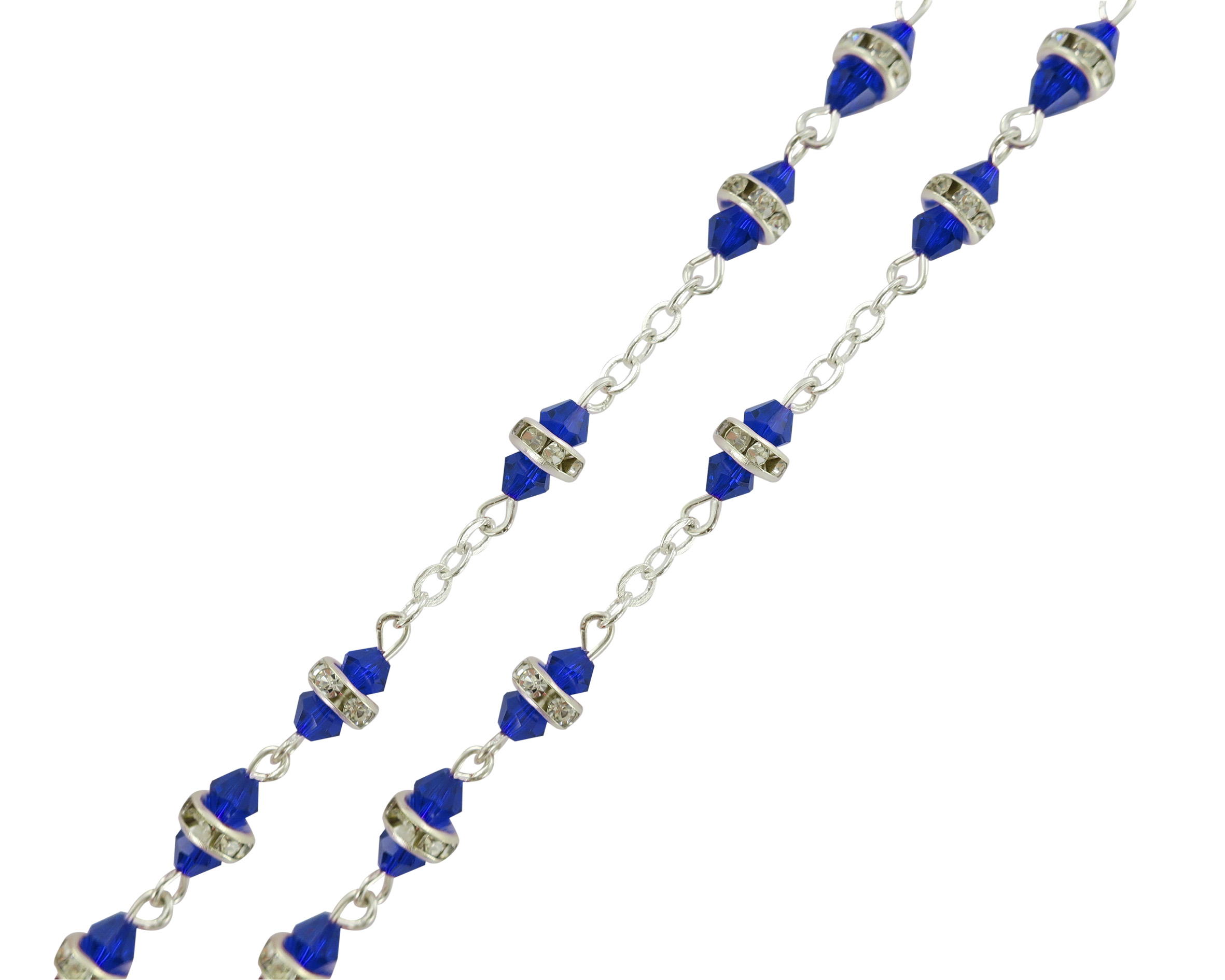 La luminosità di questo rosario,rilegato a mano in metallo argentato, è dovuta ai grani in semicristallo trasparente blu impreziositi da un piccolo anello in strass bianchi.