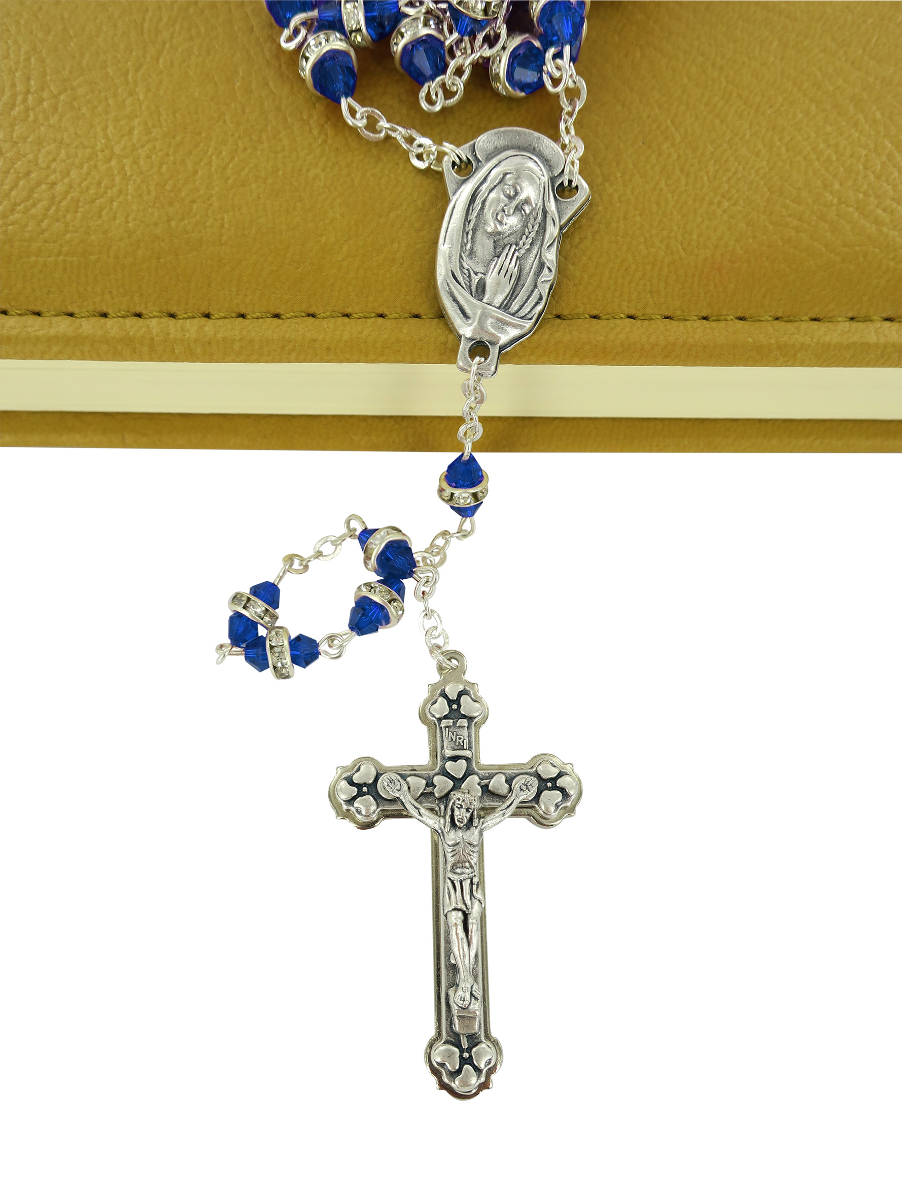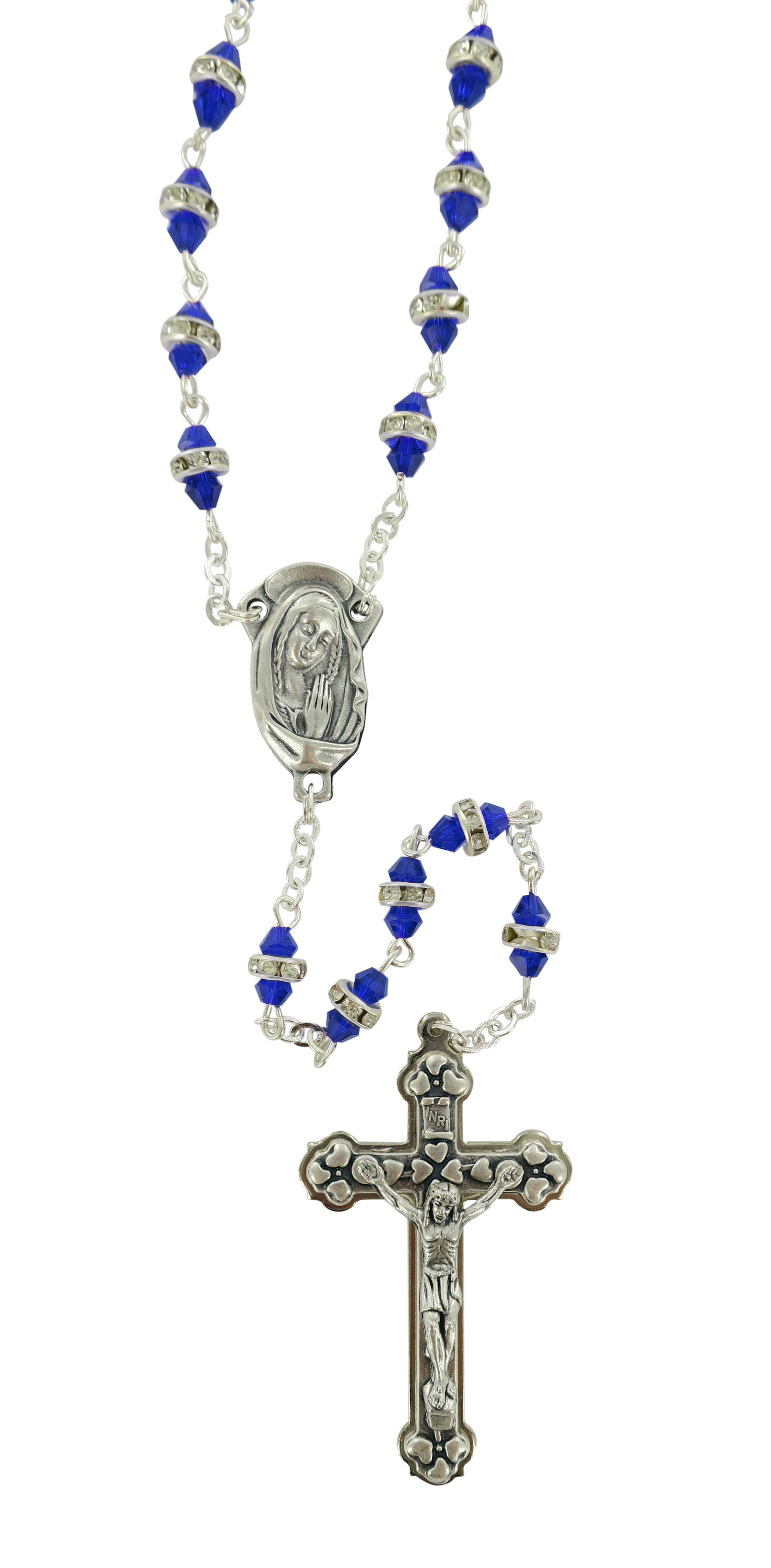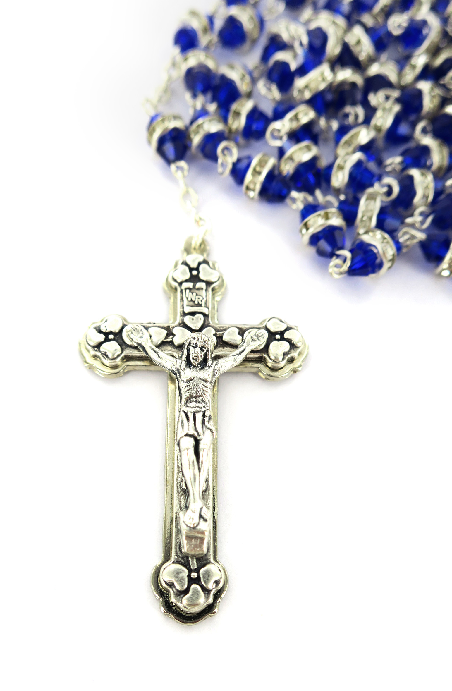 La luminosità di questo rosario,rilegato a mano in metallo argentato, è dovuta ai grani in semicristallo trasparente blu impreziositi da un piccolo anello in strass bianchi.