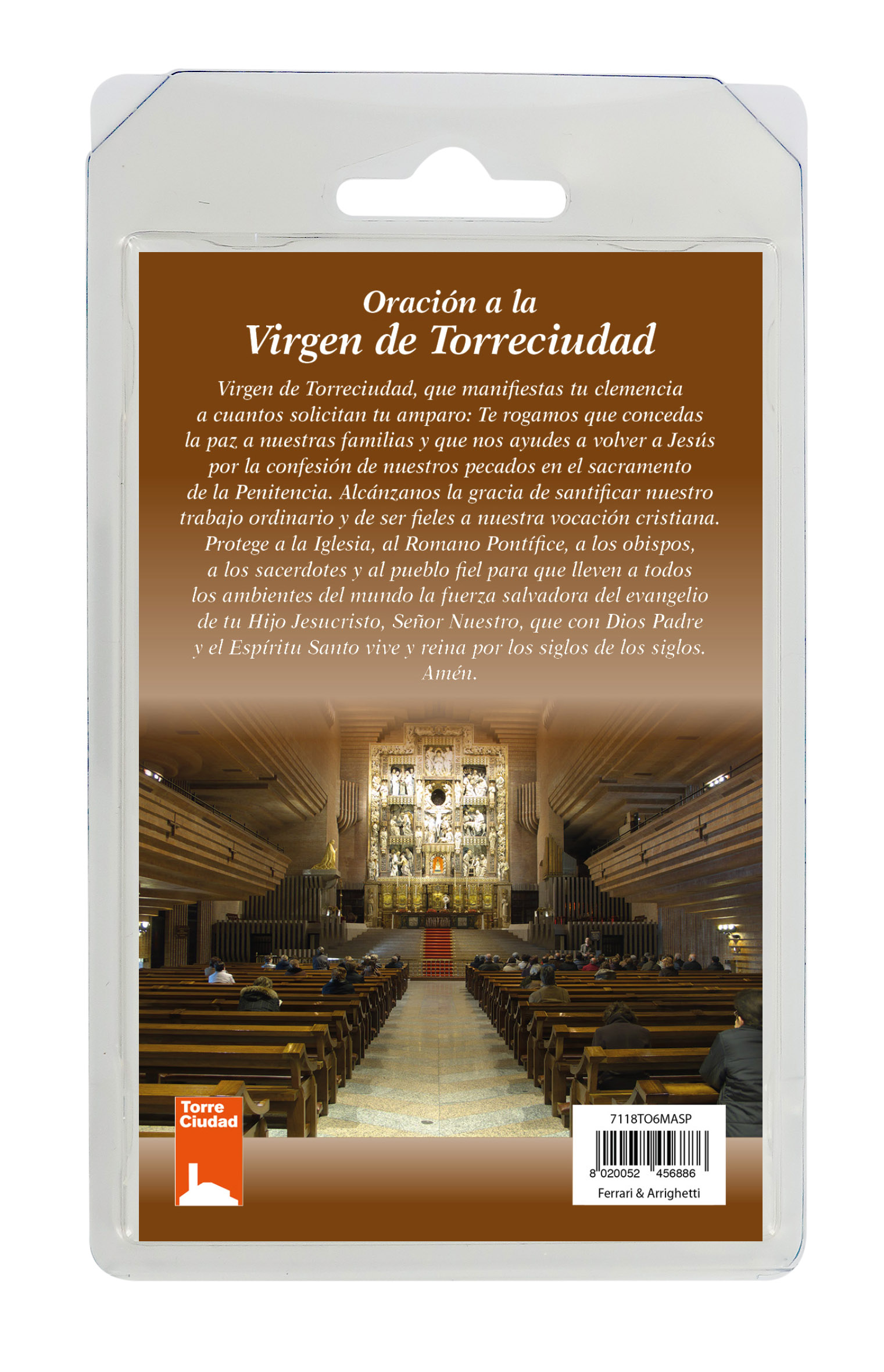 Si presenta confezionato in una scatolina in plastica rigida trasparente al cui interno troviamo un cartoncino con l'immagine della Vergine di Torreciudad sul cui retro è stampata una preghiera.