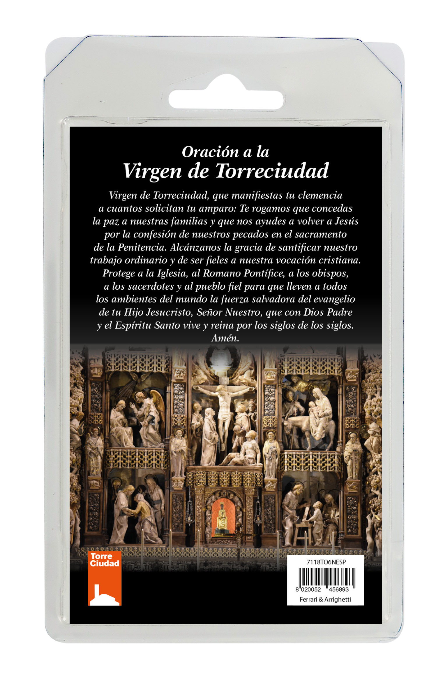 Si presenta confezionato in una scatolina in plastica rigida trasparente al cui interno troviamo un cartoncino con l'immagine della Vergine di Torreciudad sul cui retro è stampata una preghiera.