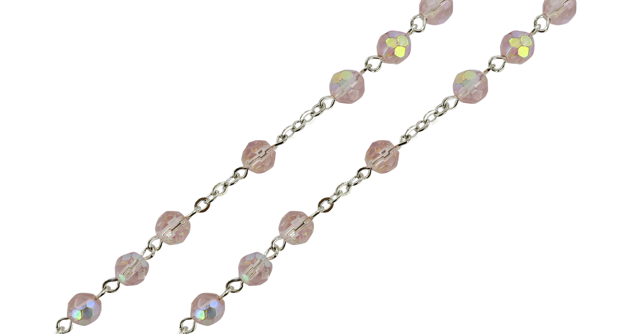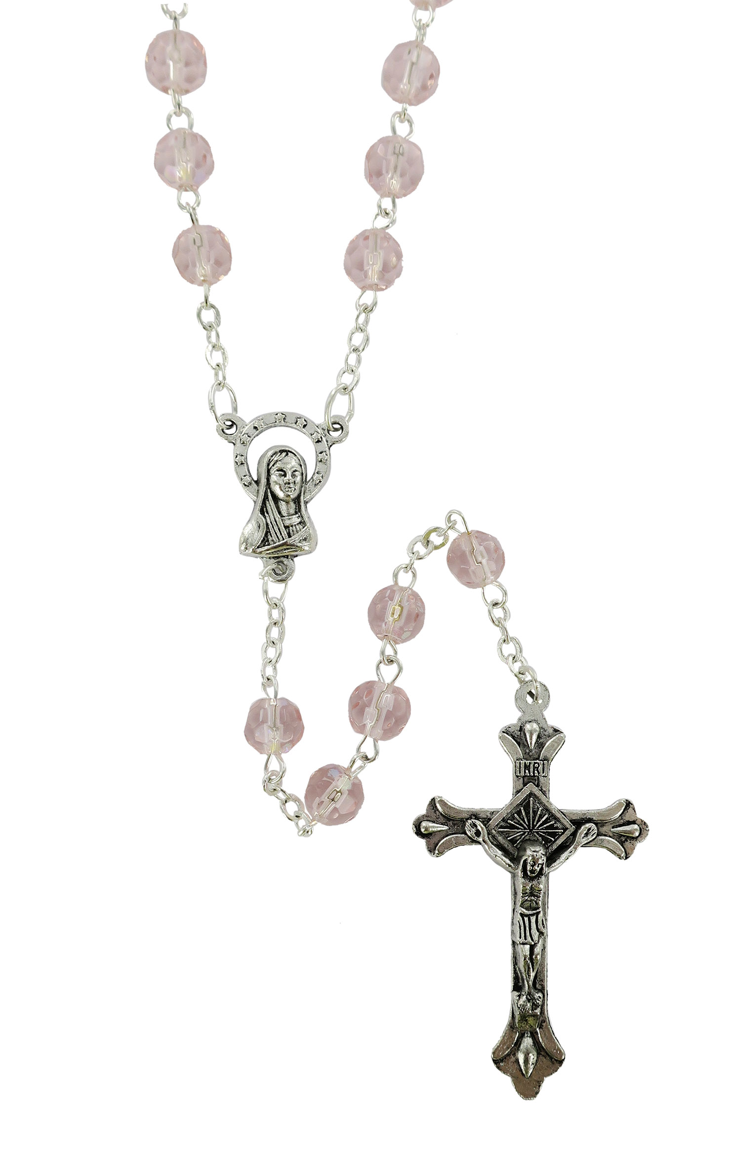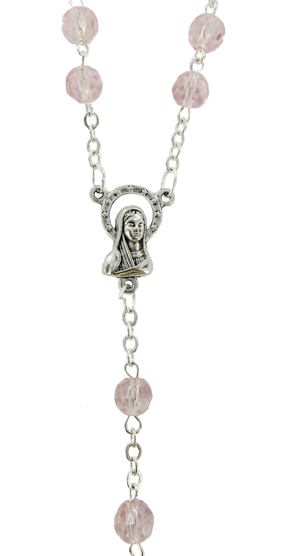 Rosario con grani in semicristallo di colore rosa la cui misura è 6 millimetri.