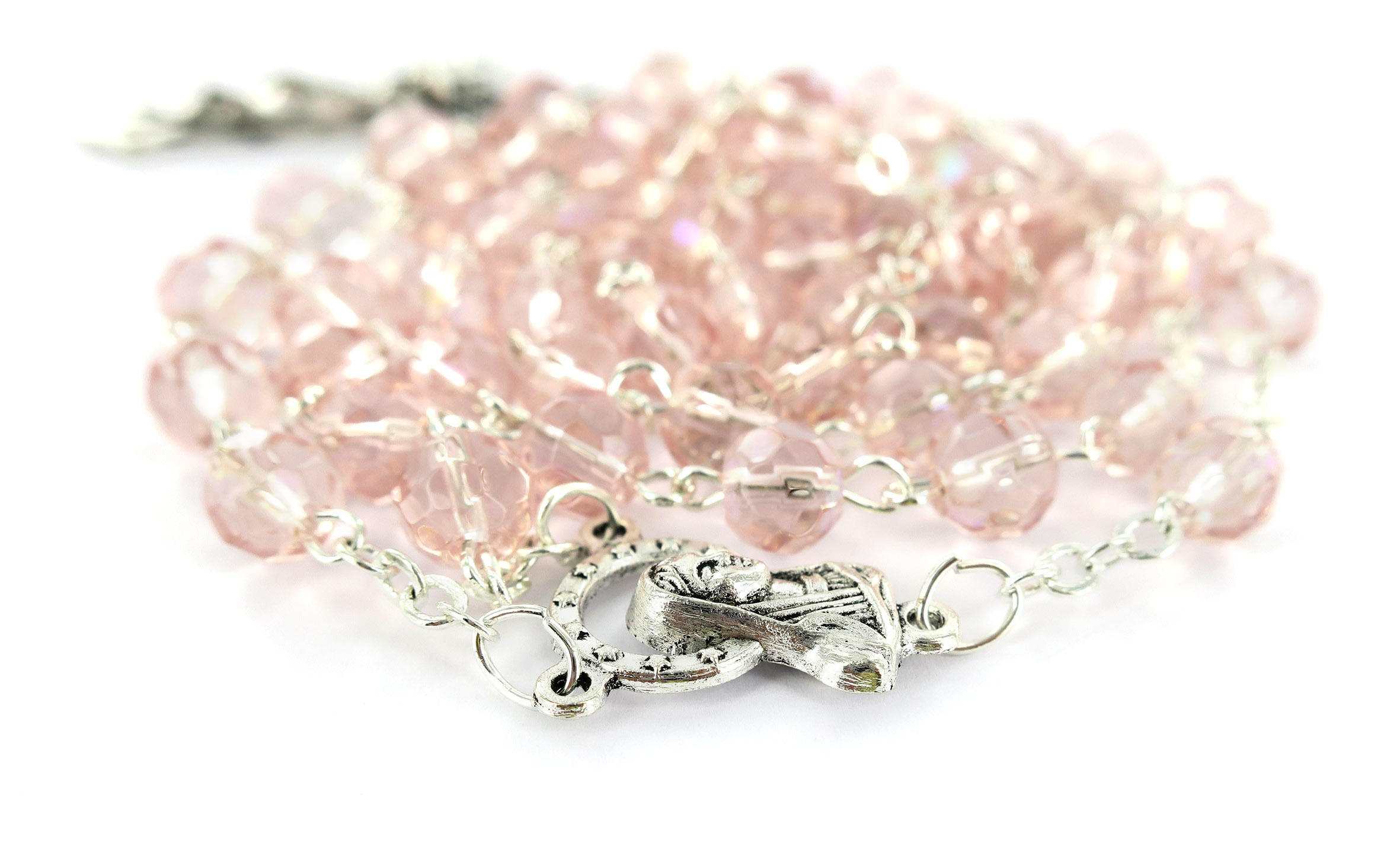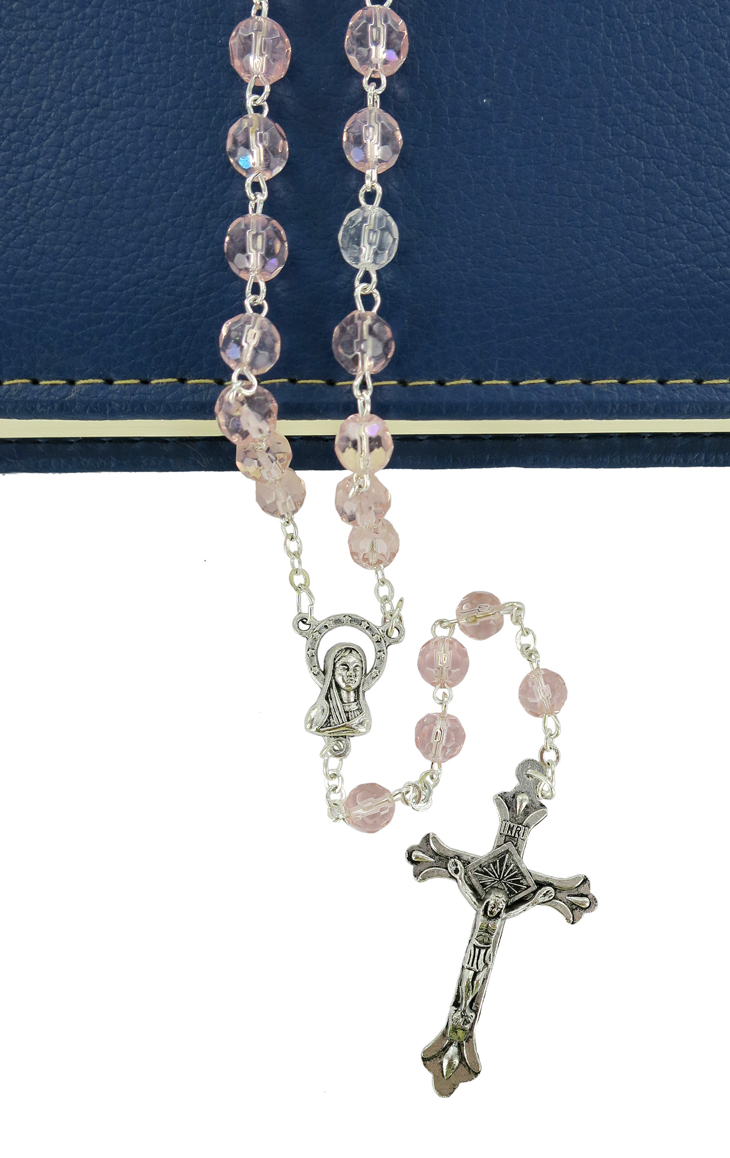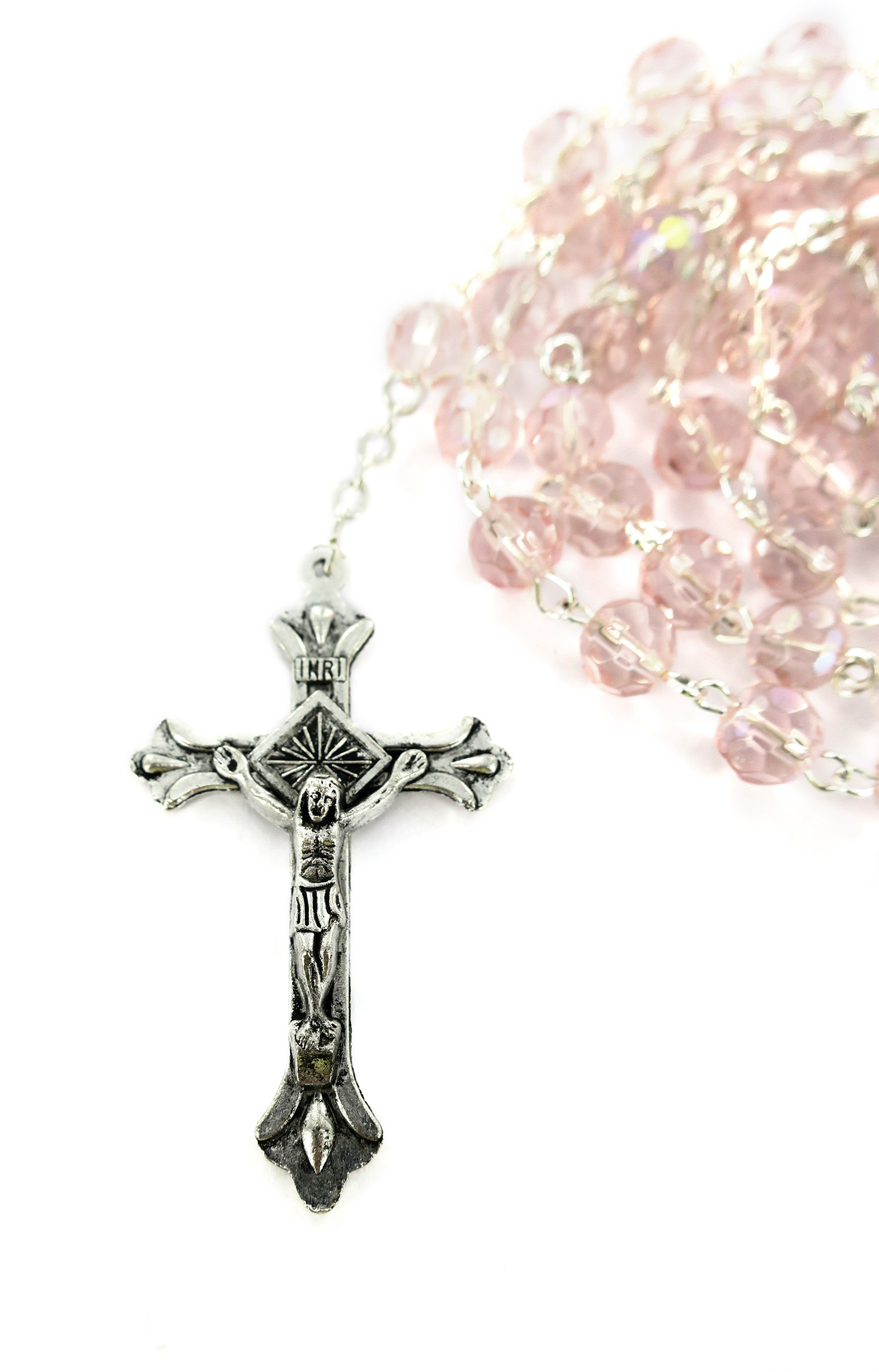 Rosario con grani in semicristallo di colore rosa la cui misura è 6 millimetri.