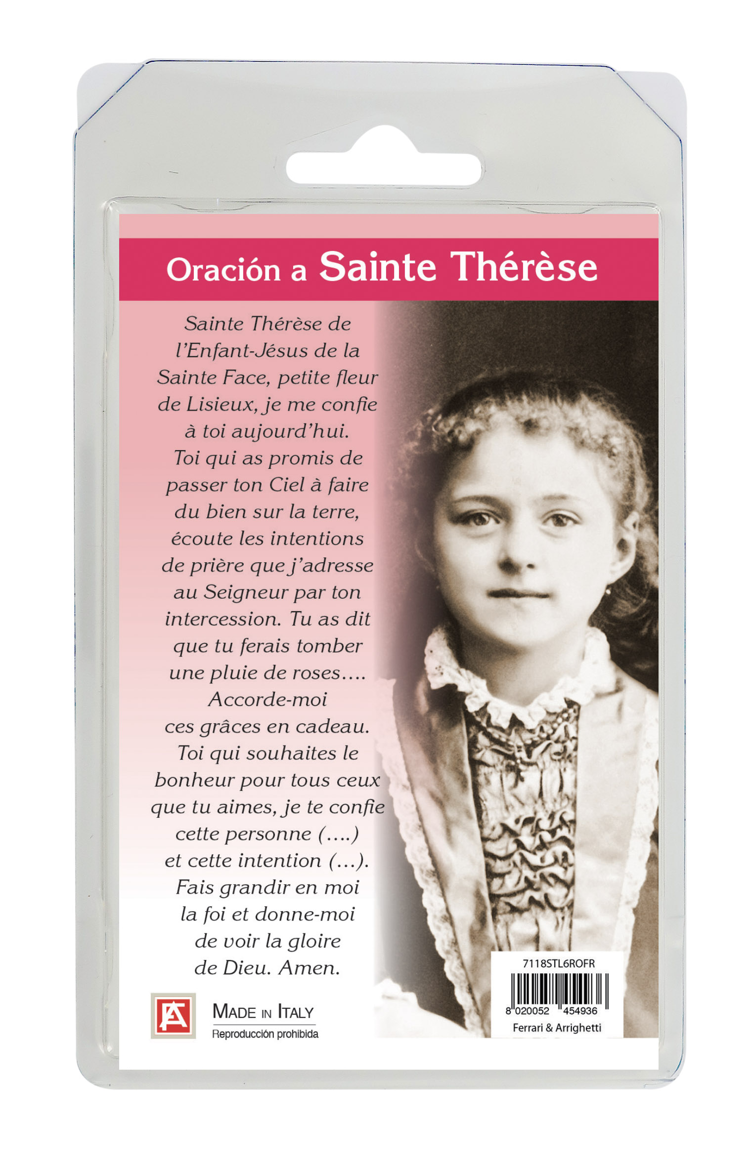 Si presenta confezionato in una scatolina in plastica rigida trasparente al cui interno troviamo un cartoncino con l'immagine di Santa Teresa di Lisieux sul cui retro è stampata una preghiera a lei dedicata.
