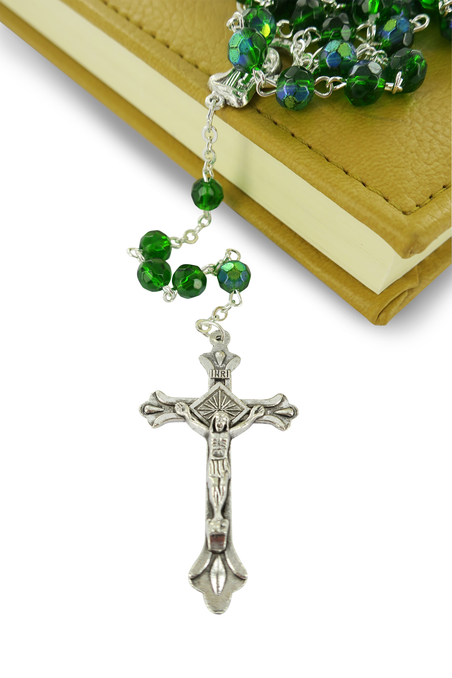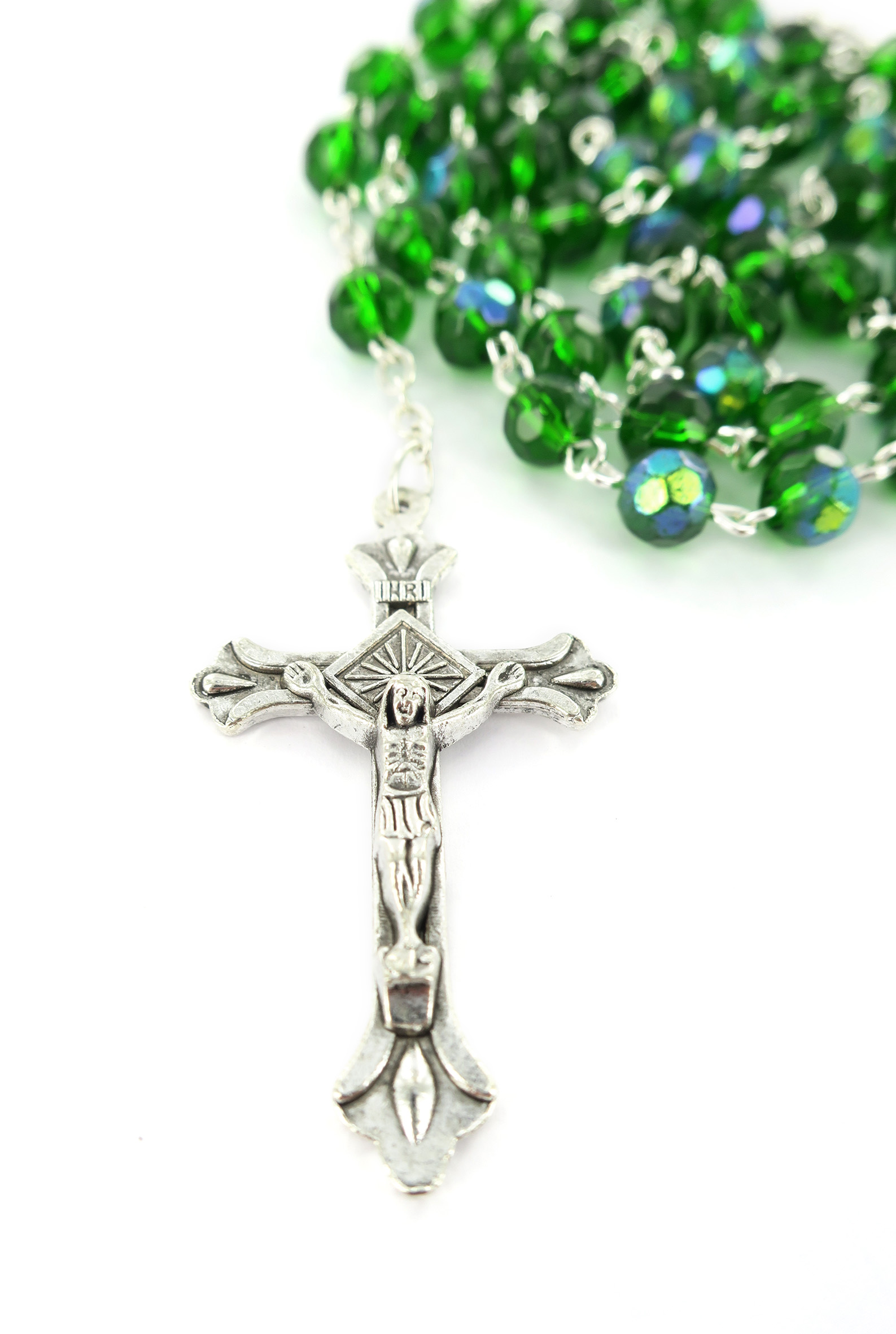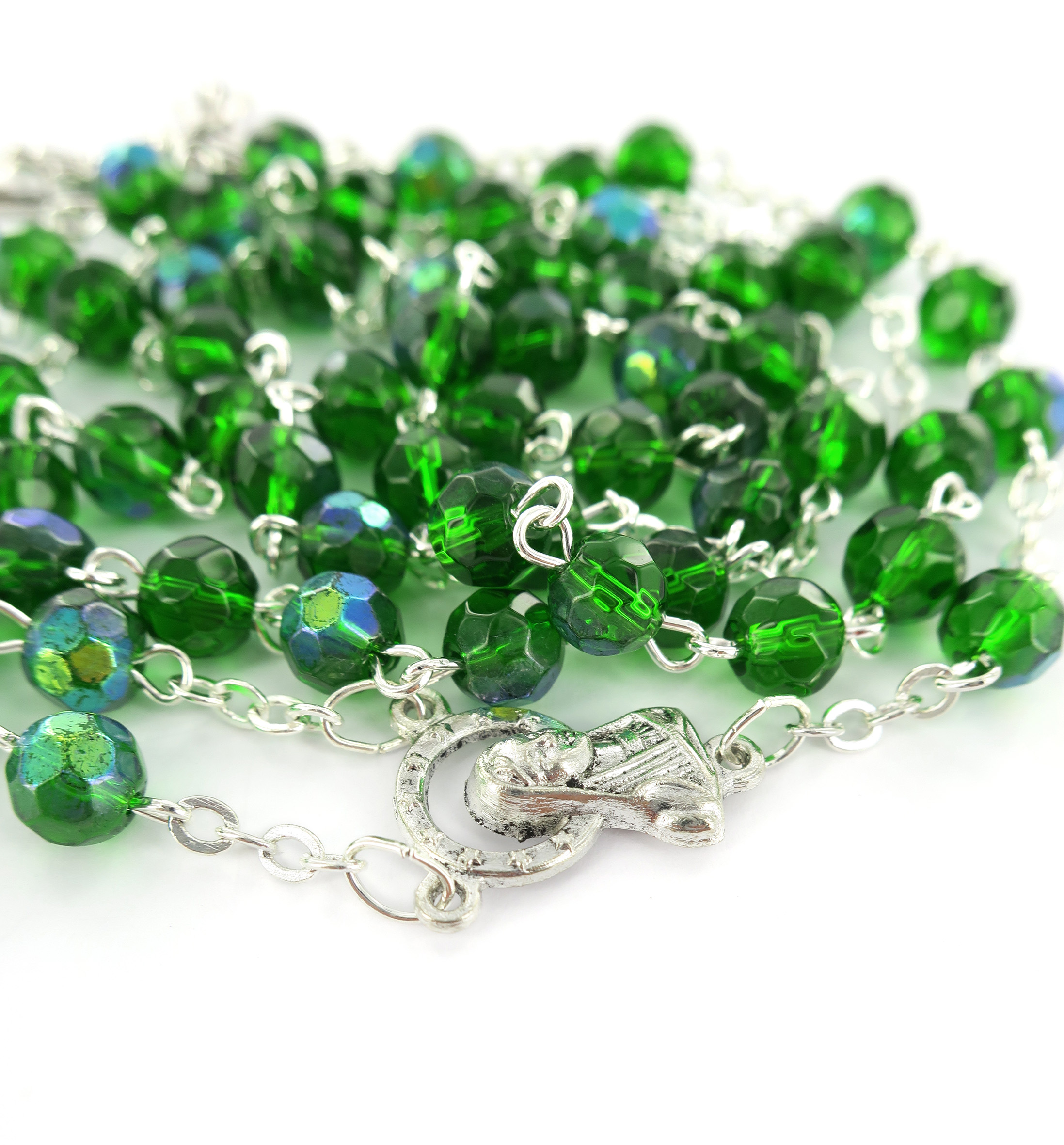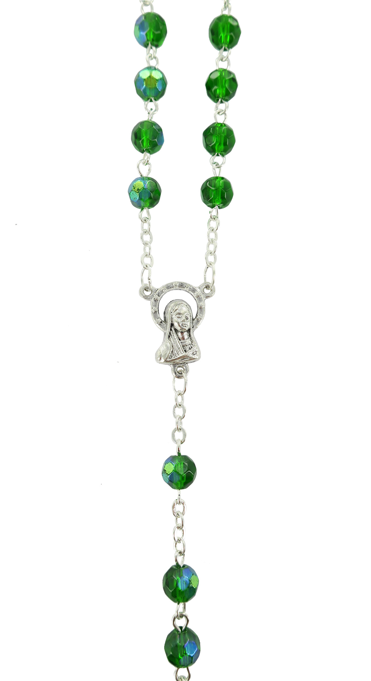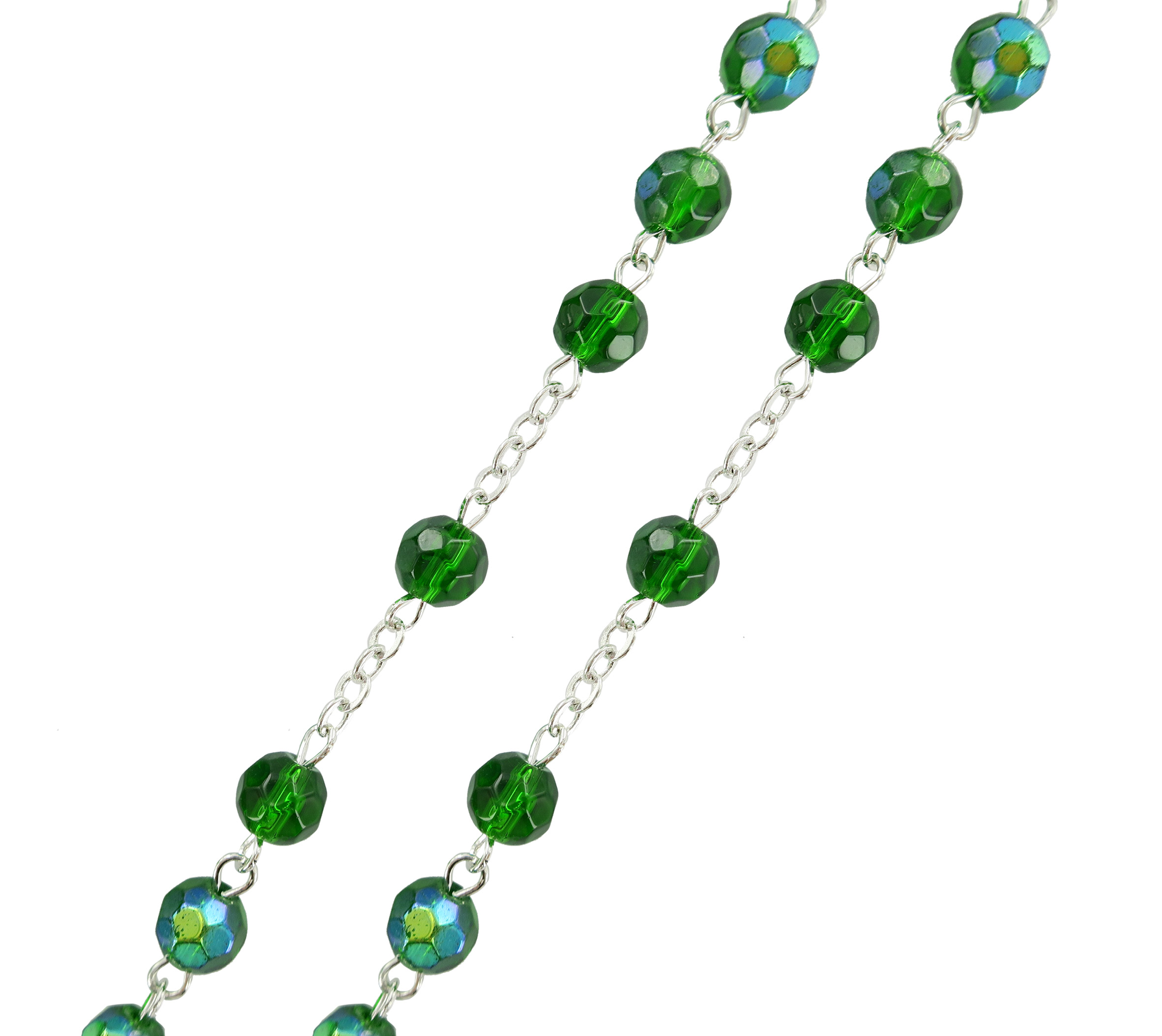 Rosario con grani in semicristallo di colore verde la cui misura è 6 millimetri.