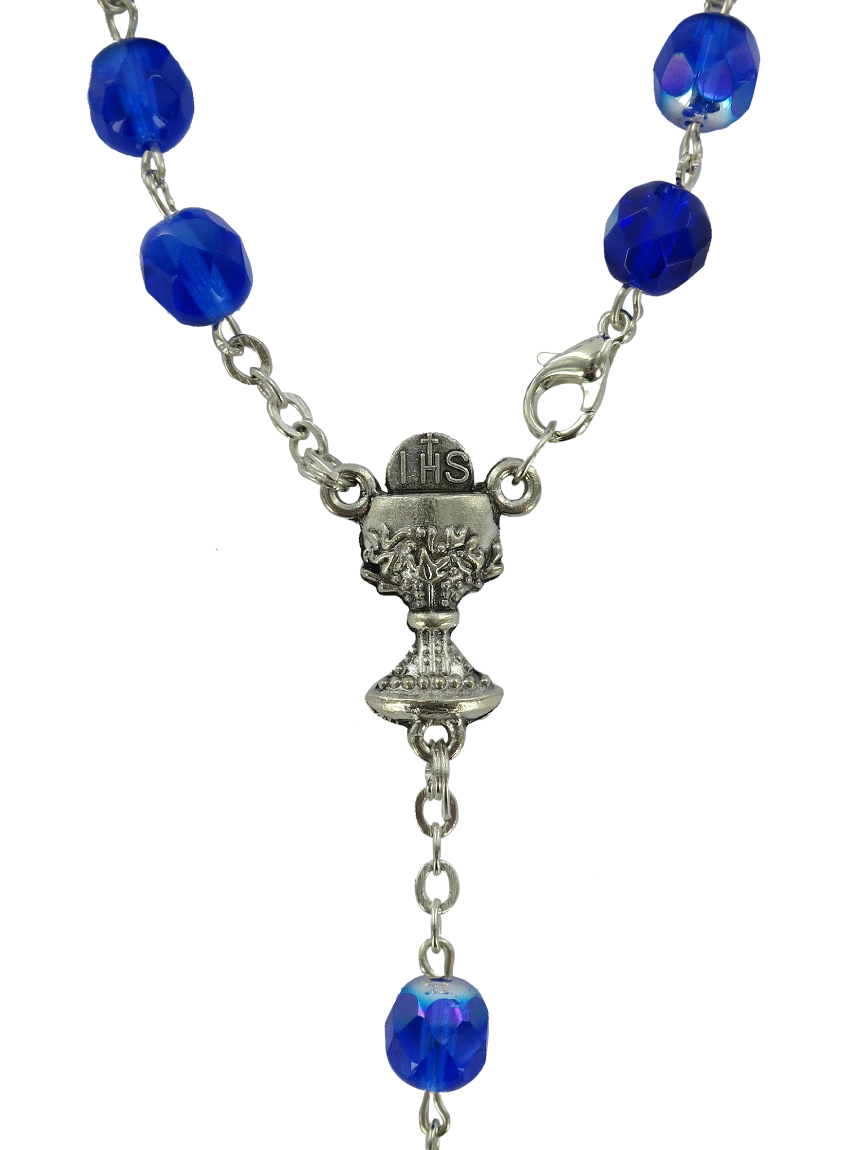 I grani sono di mm 7 ed hanno un moschettone che ci permette di aprirlo: la croce e la crociera, a forma di calice, ci ricorda la prima comunione.