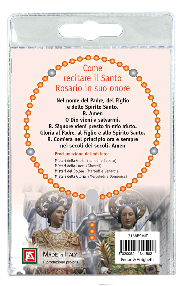 Il blister si presenta con all'interno un cartoncino, rappresentante la foto dei Santi Medici di Bitonto ed una decina con grani tondi in legno di mm 4 che, con gancetto si può applicare come ciondolo.