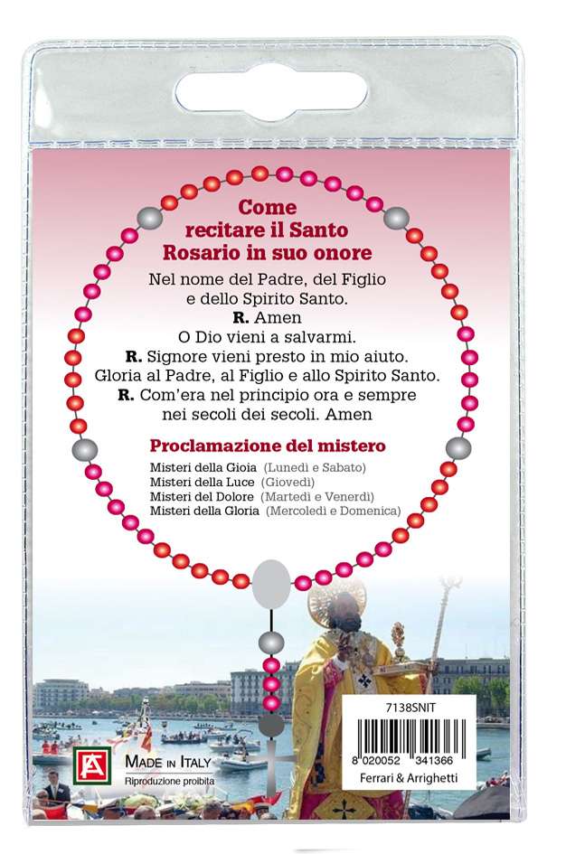 Il blister si presenta con all'interno un cartoncino, rappresentante la foto di San Nicola di Bari ed una decina con grani tondi in legno di mm 4 che, con gancetto si può applicare come ciondolo.