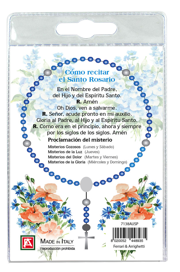 Si presenta in un blister in plastica trasparente al cui interno troviamo un cartoncino raffigurante la Madonna Ausiliatrice sul cui retro è spiegato,in spagnolo, come si recita il rosario.