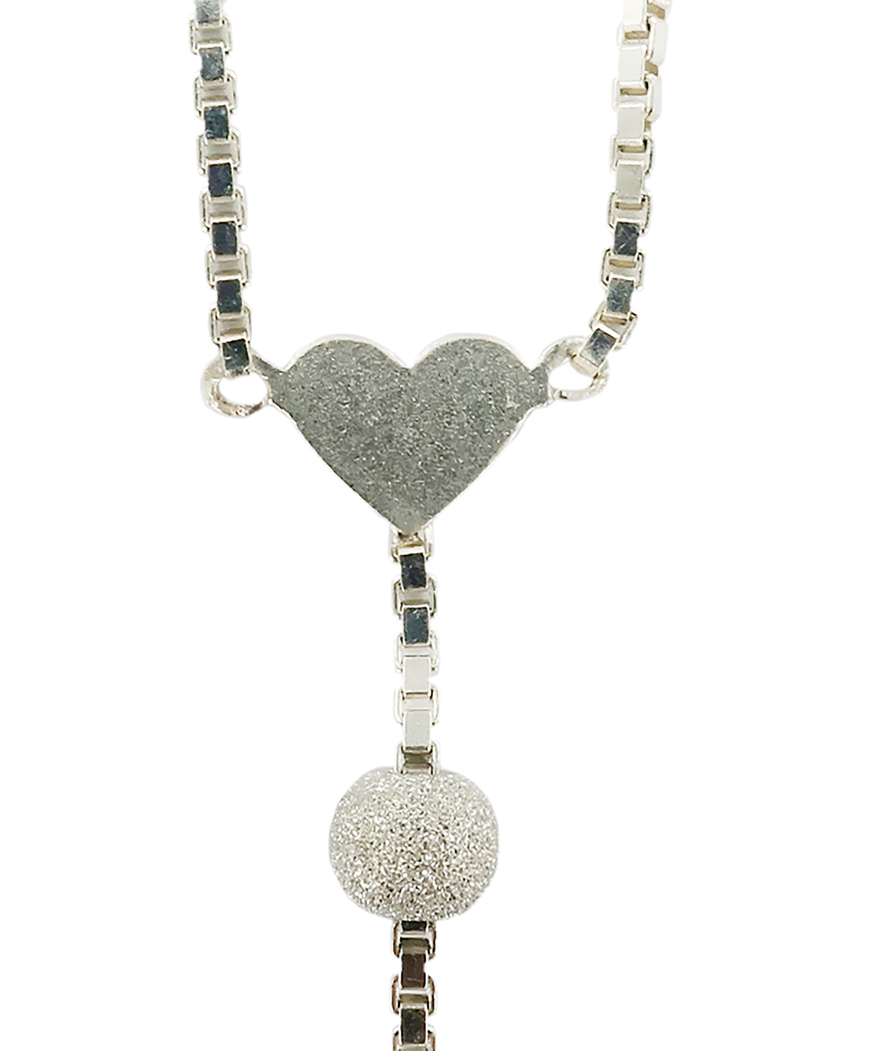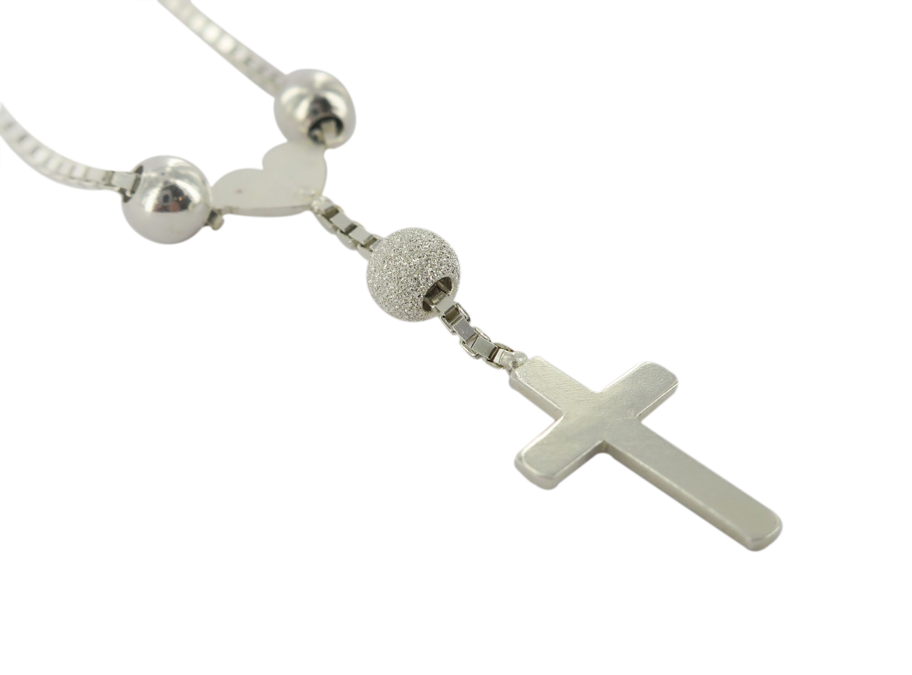 Questo rosario decina ha 10 grani da 3,5 mm di diametro, una piccola crociera a forma di cuore e una crocetta liscia di 1,3 cm: tutto realizzato in argento 925.