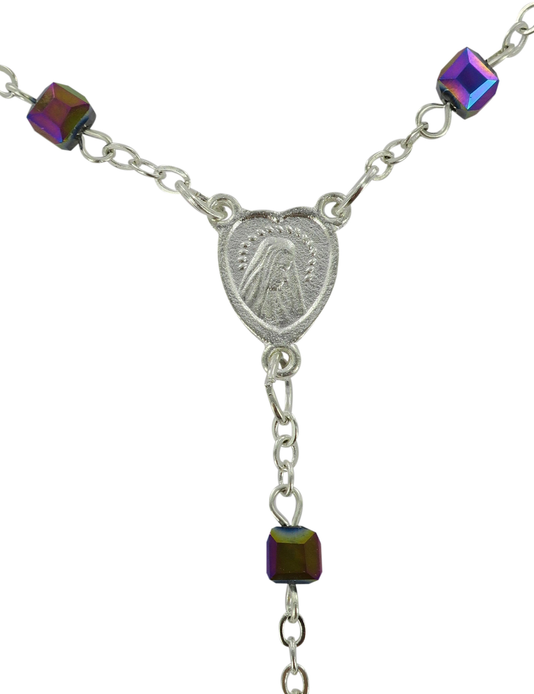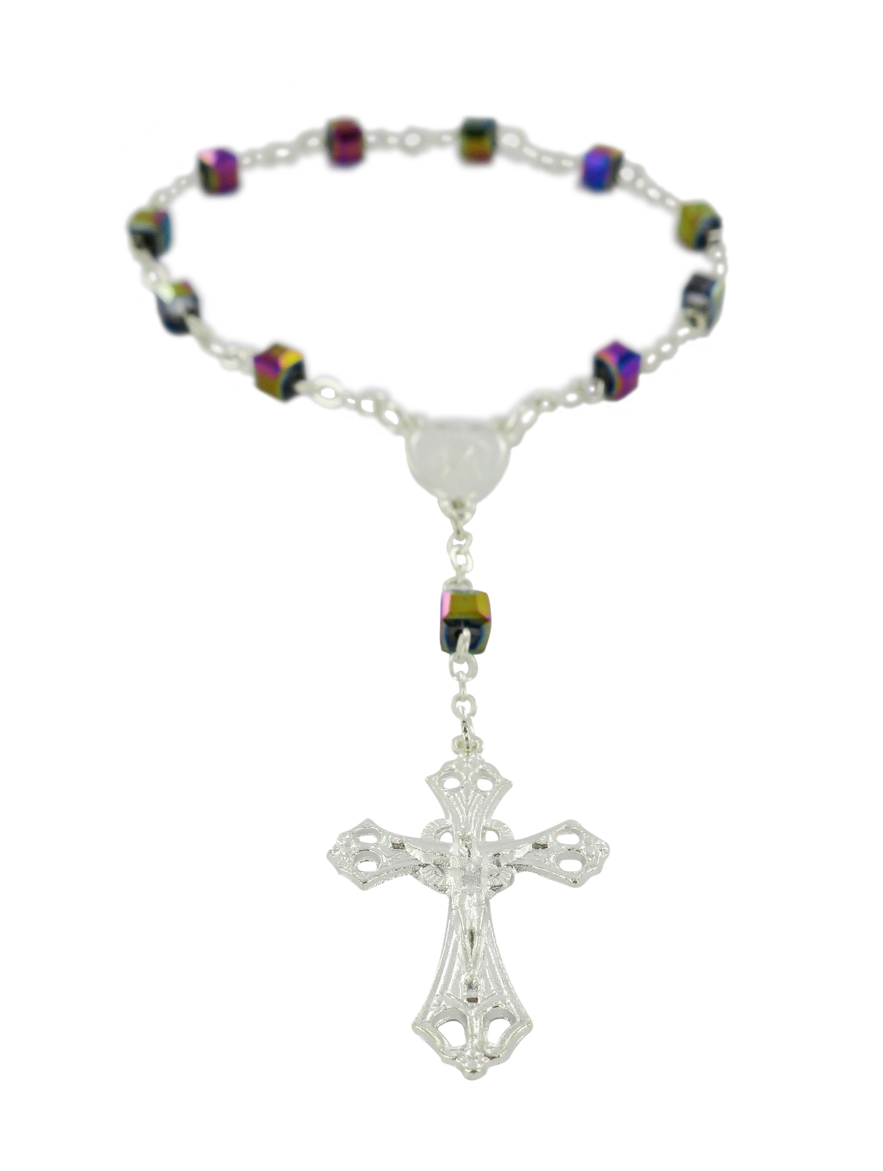 Il rosario decina è rilegato a mano con filo in metallo argentato e grani a forma di cubetto di colore scarabeo.