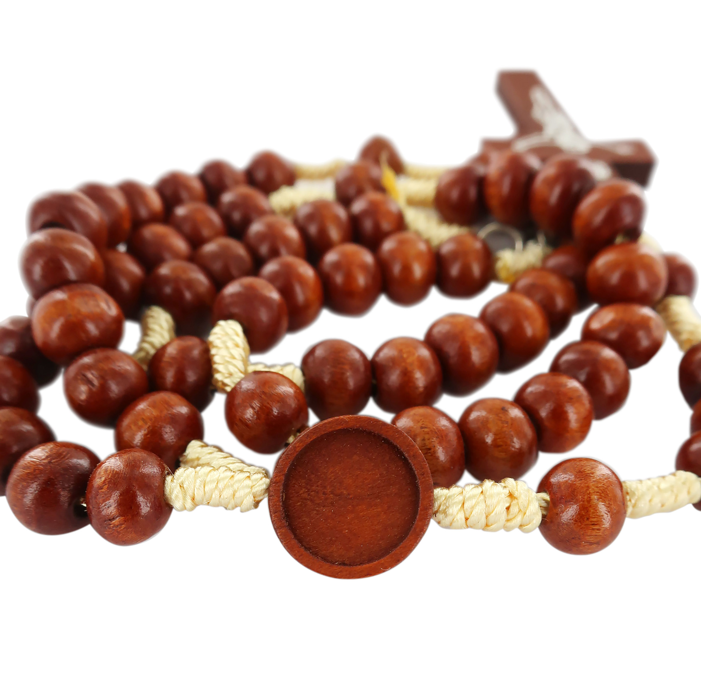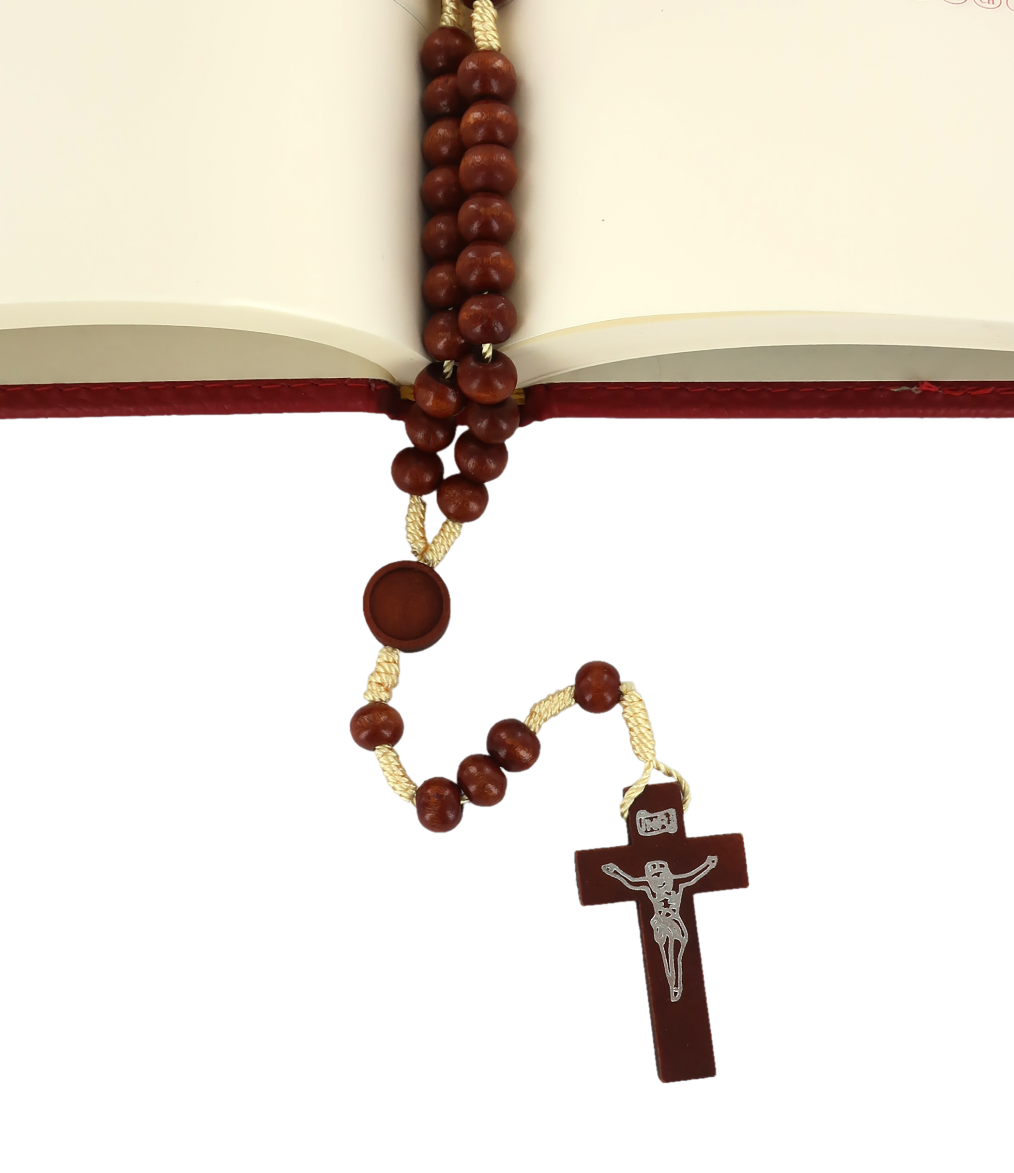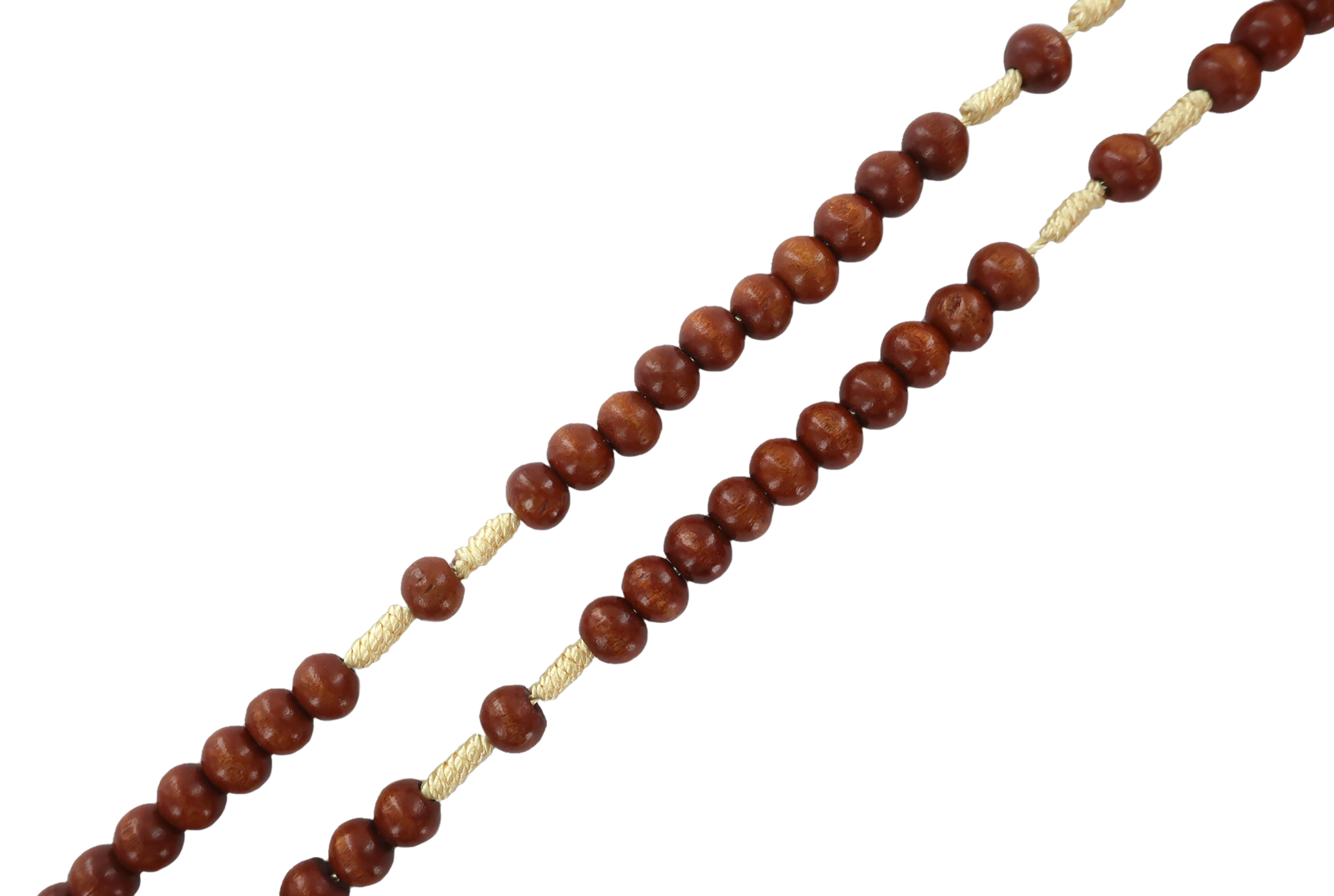 Il rosario con grani in legno tondo di colore naturale è rilegato a mano con seta di colore grezzo.