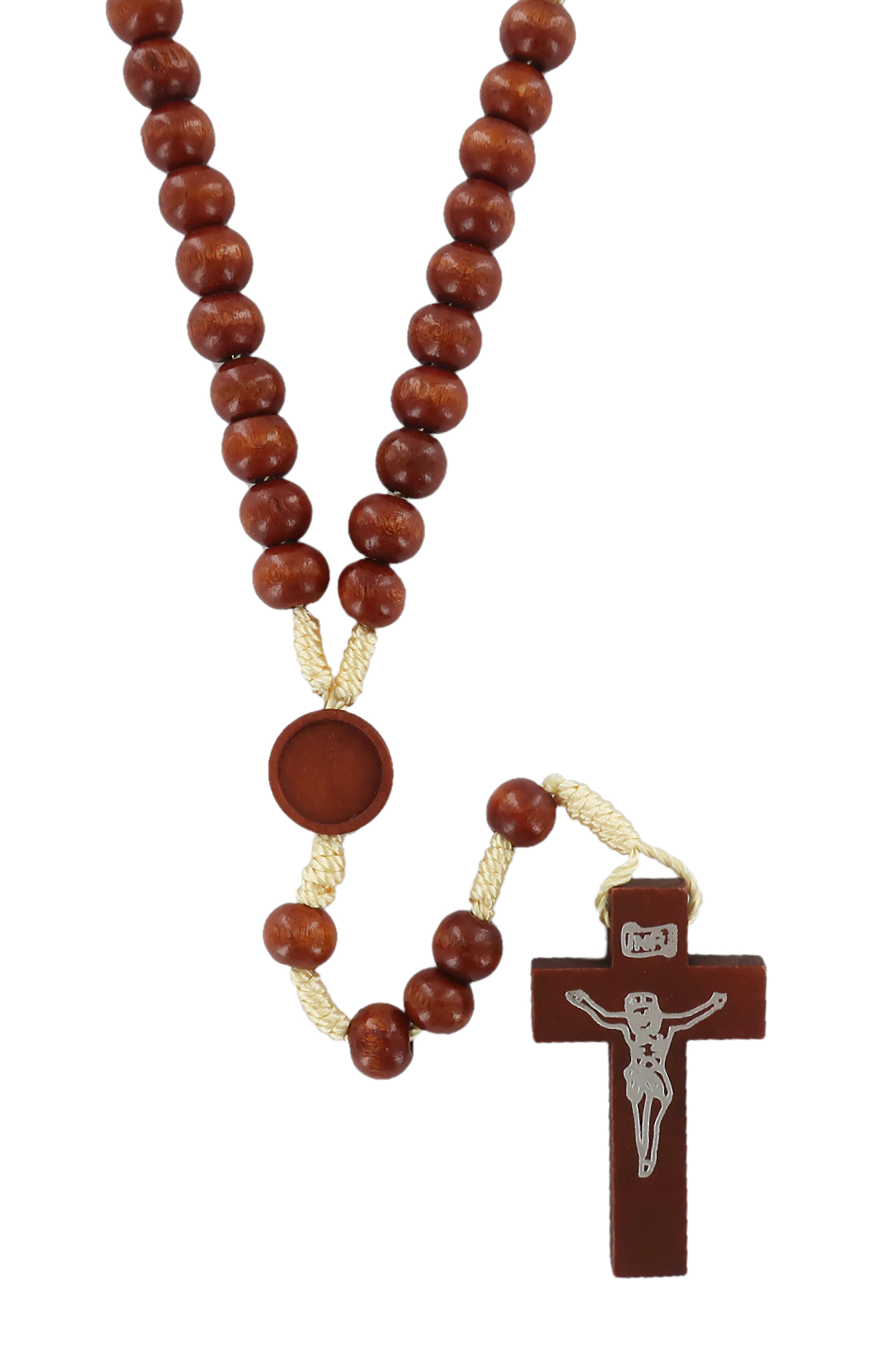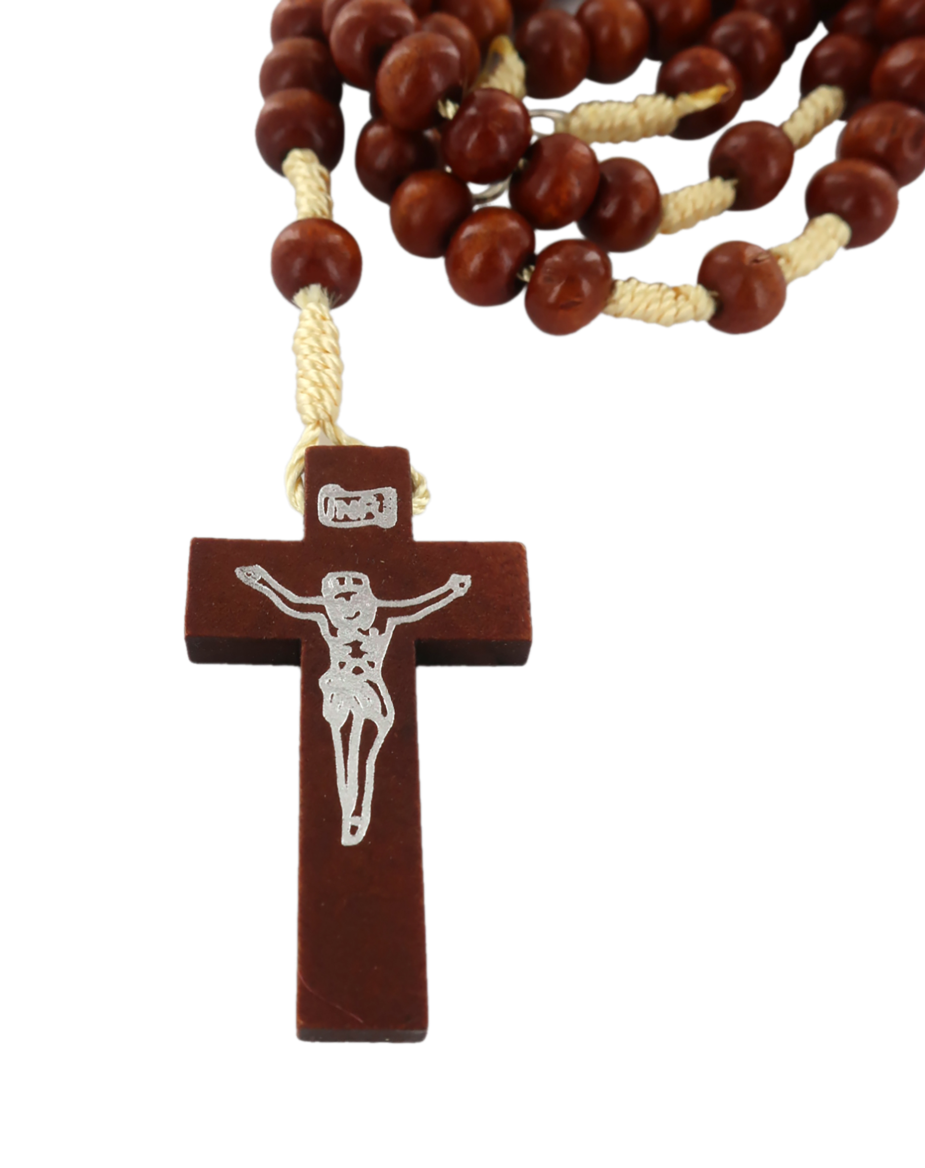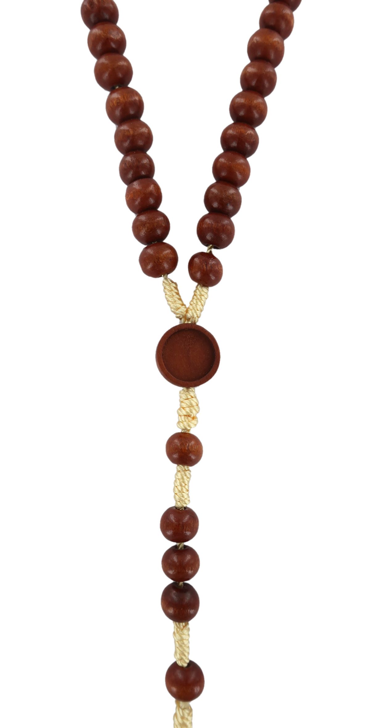 Il rosario con grani in legno tondo di colore naturale è rilegato a mano con seta di colore grezzo.