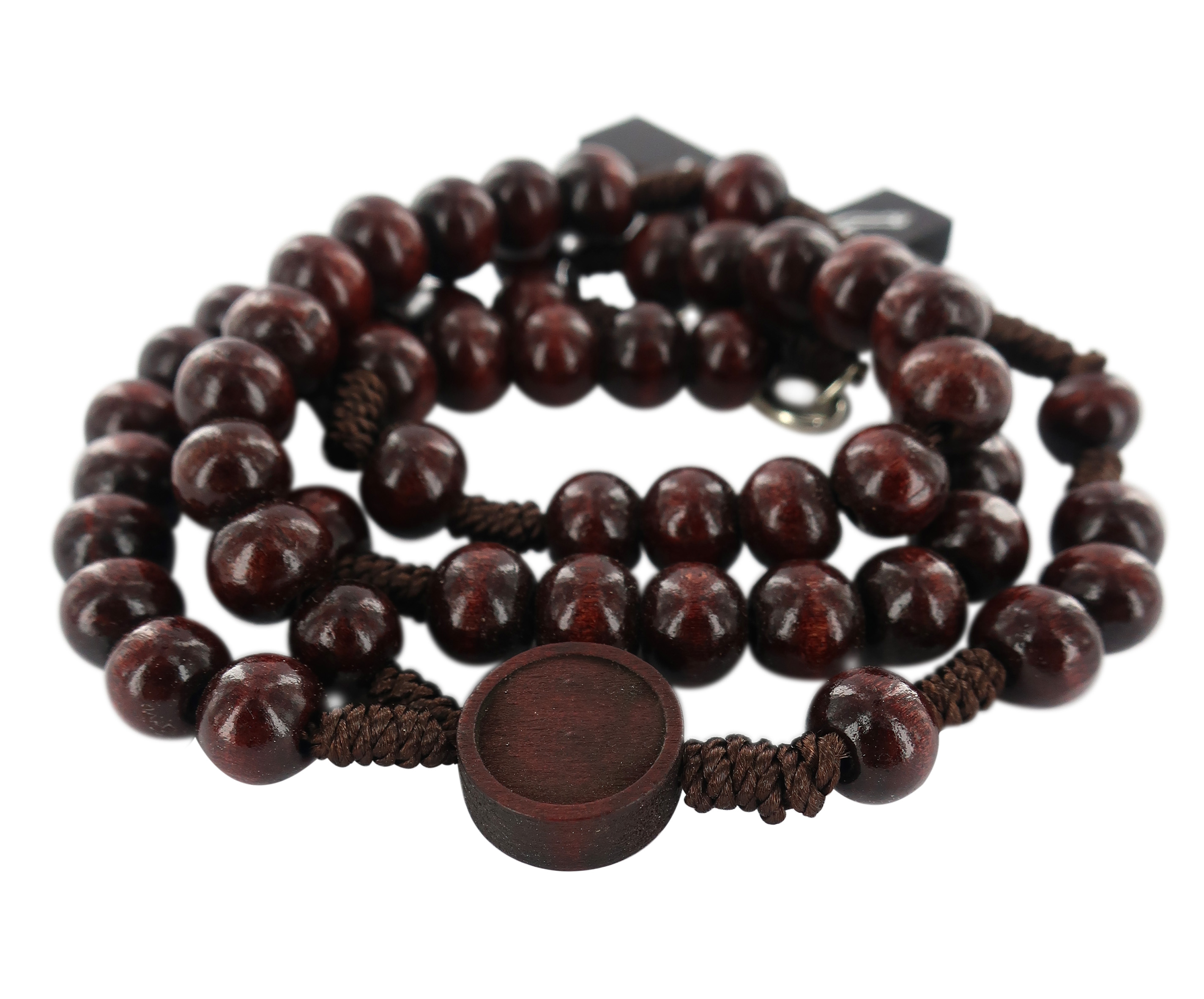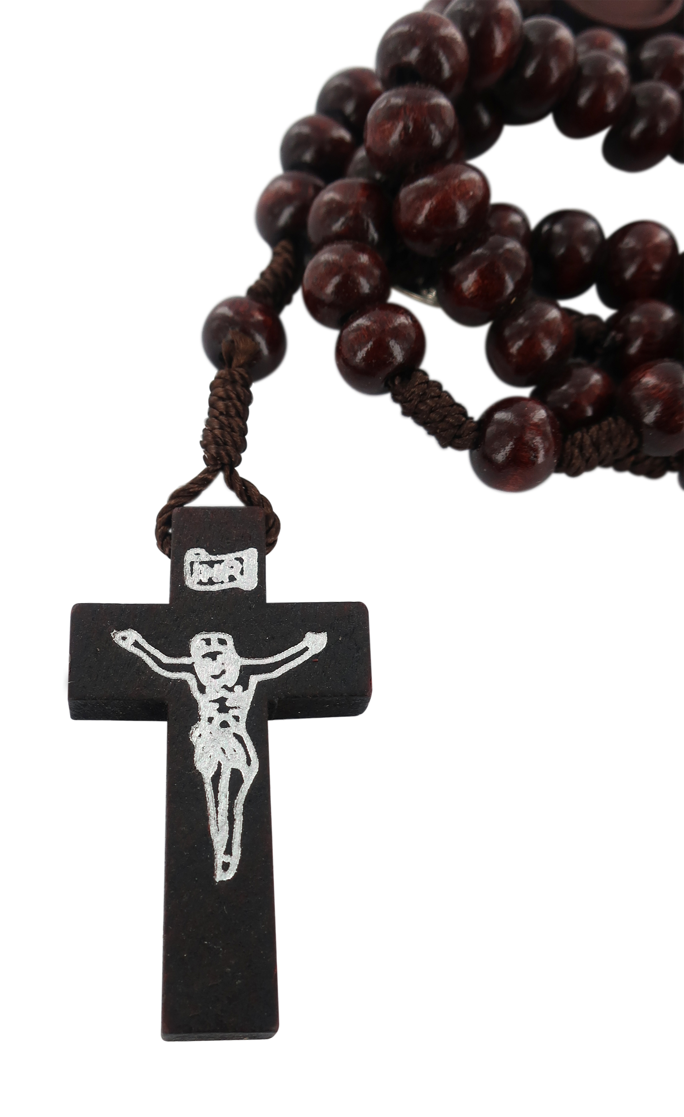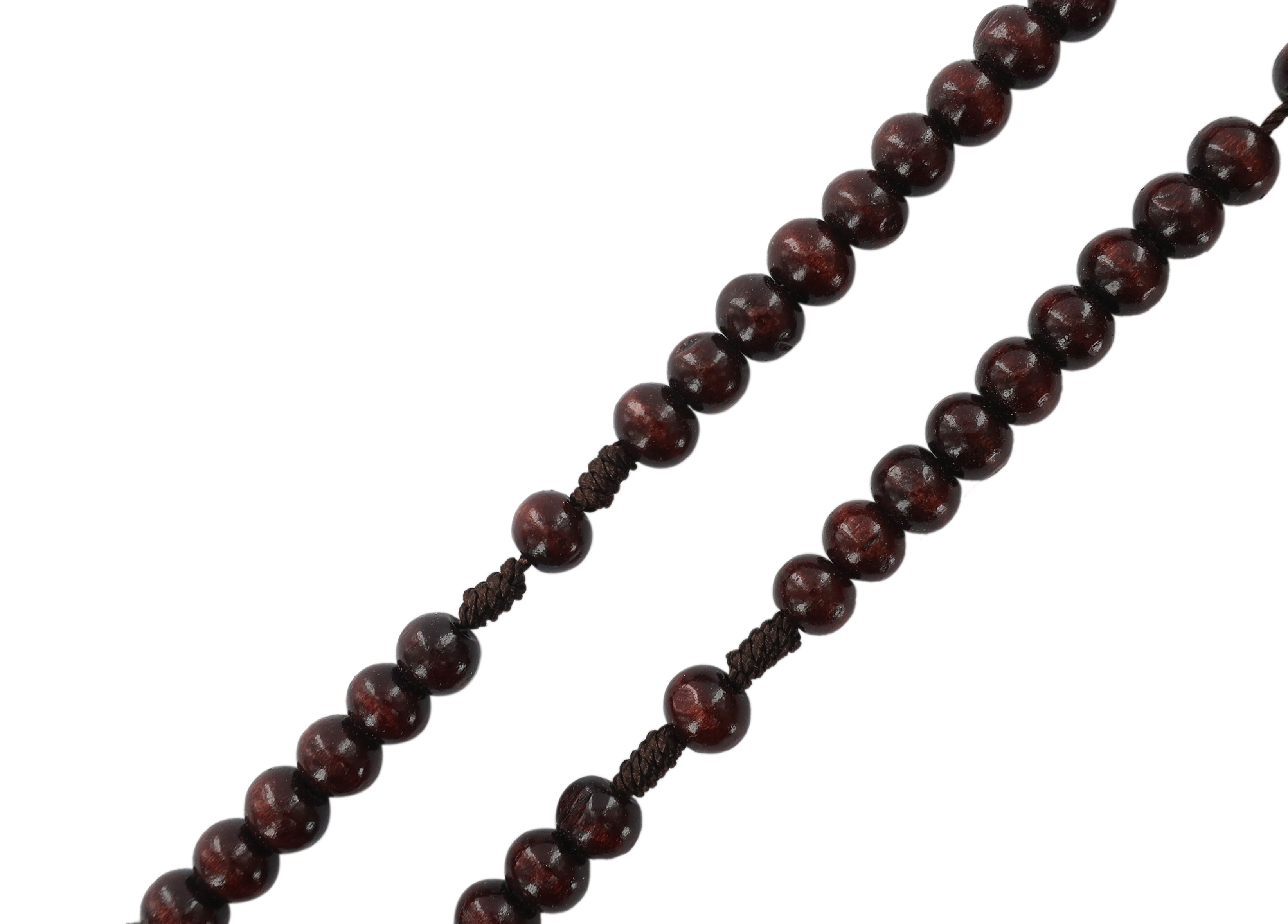 Il rosario con grani in legno tondo di colore palissandro è rilegato a mano con seta di colore grezzo.