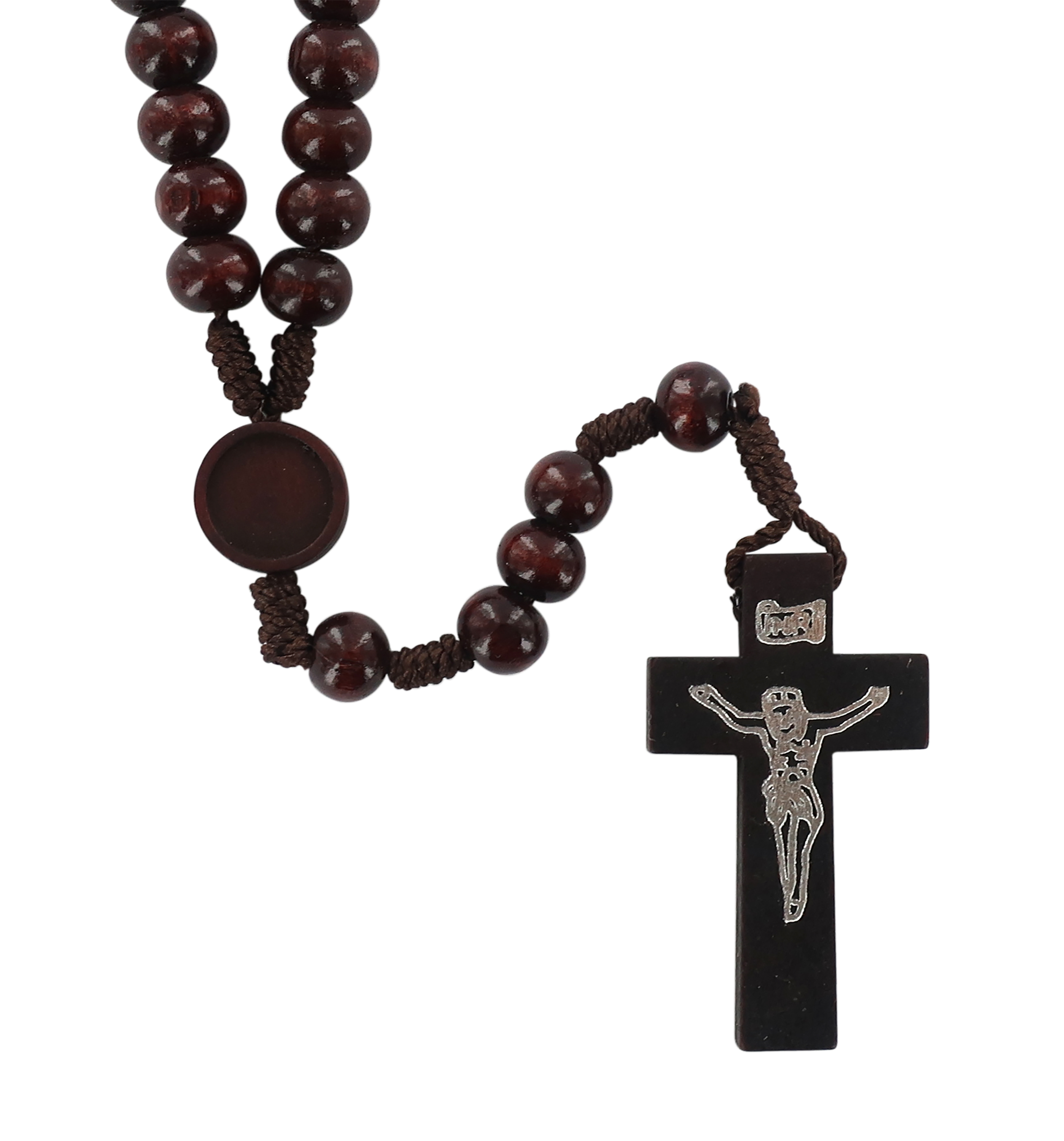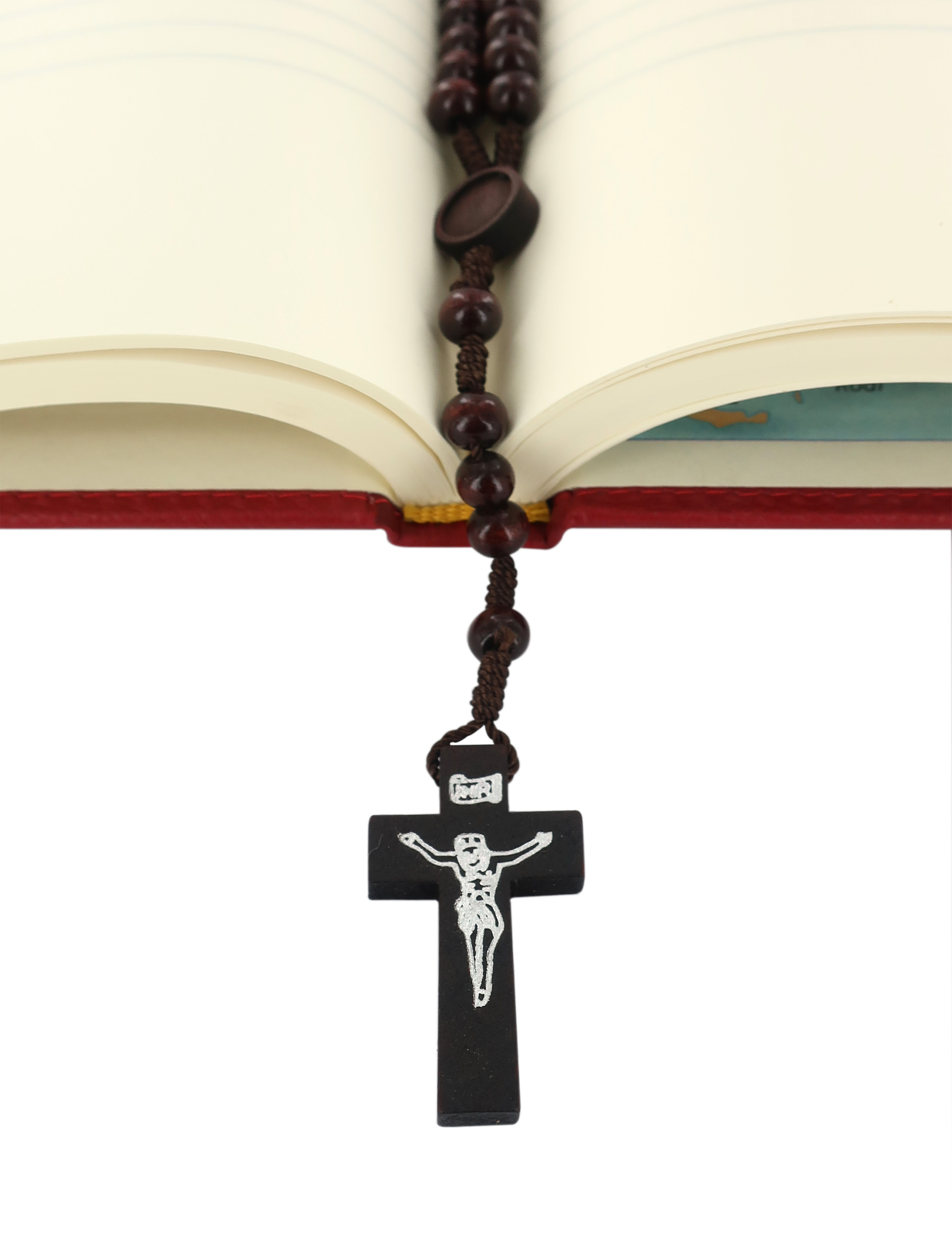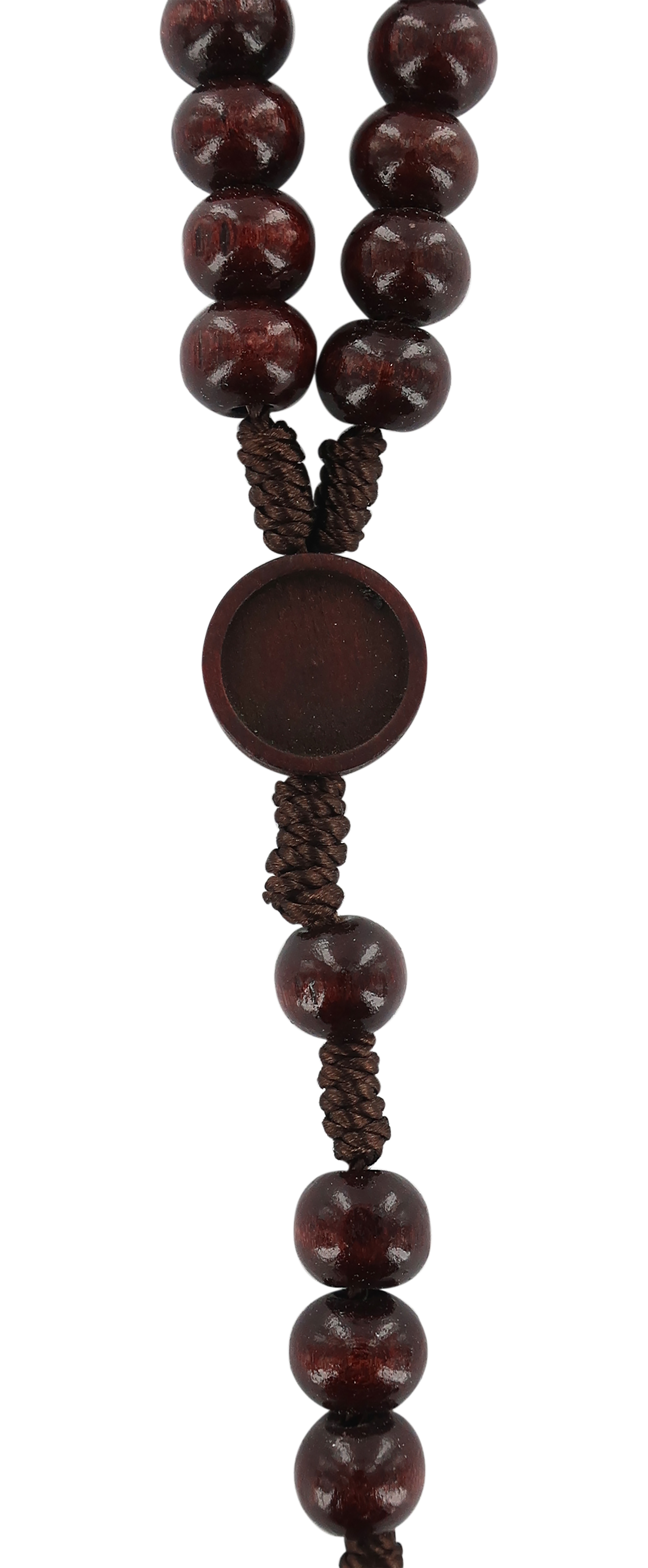 Il rosario con grani in legno tondo di colore palissandro è rilegato a mano con seta di colore grezzo.