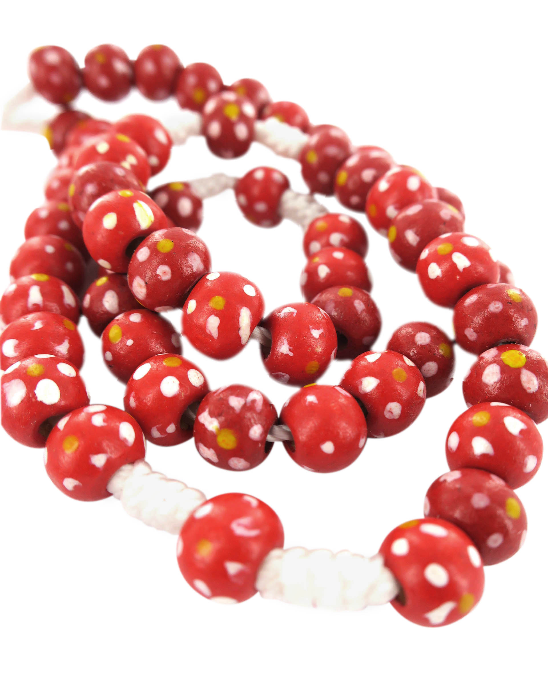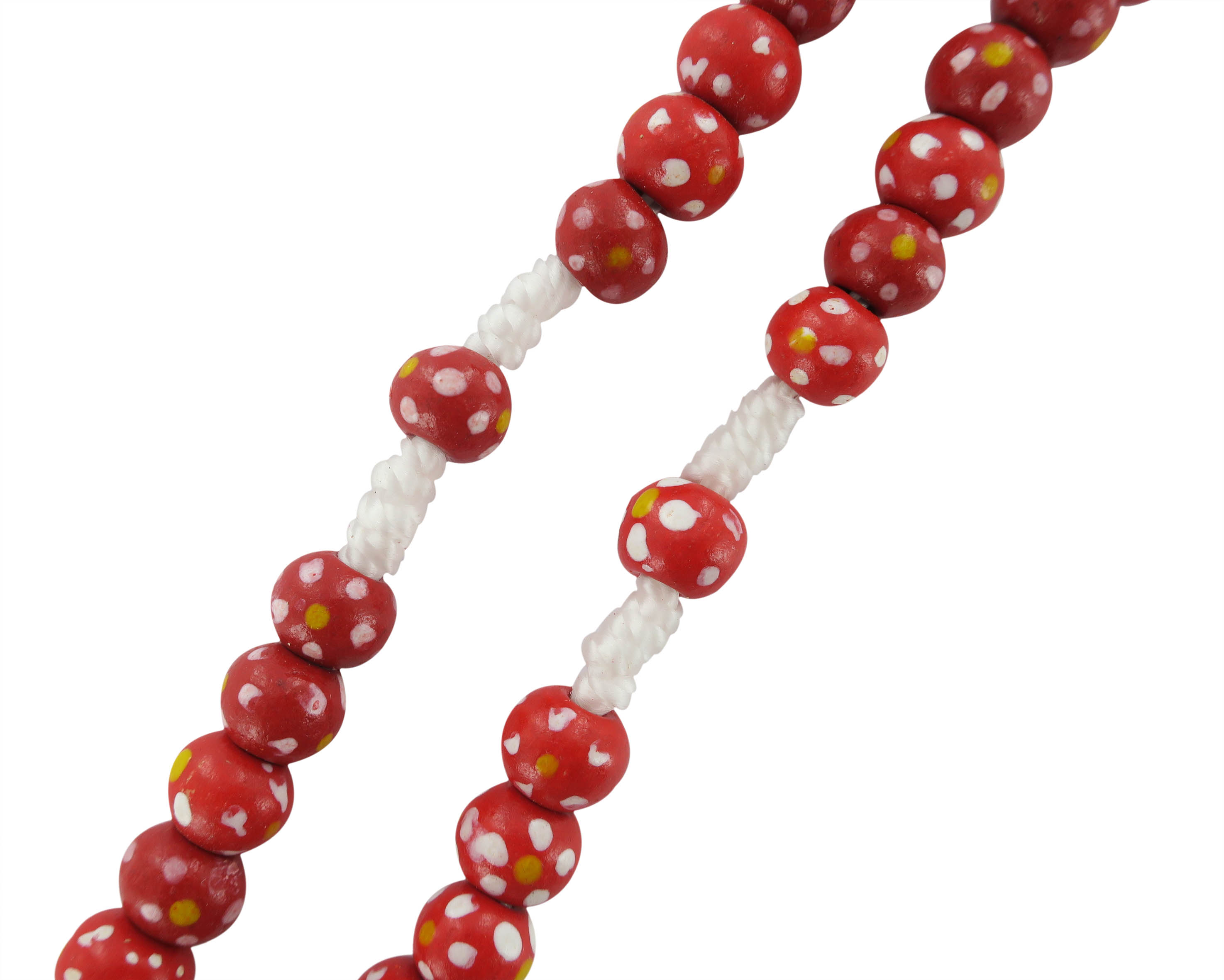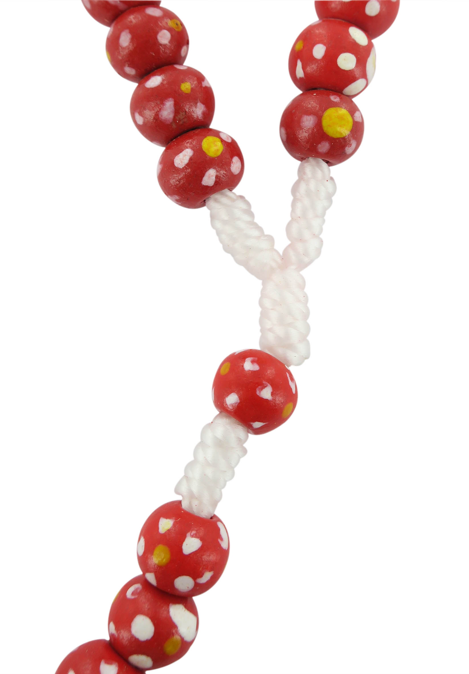 Rosario con grani tondi in legno rosso con fiore bianco e giallo e legatura a mano con filo bianco.