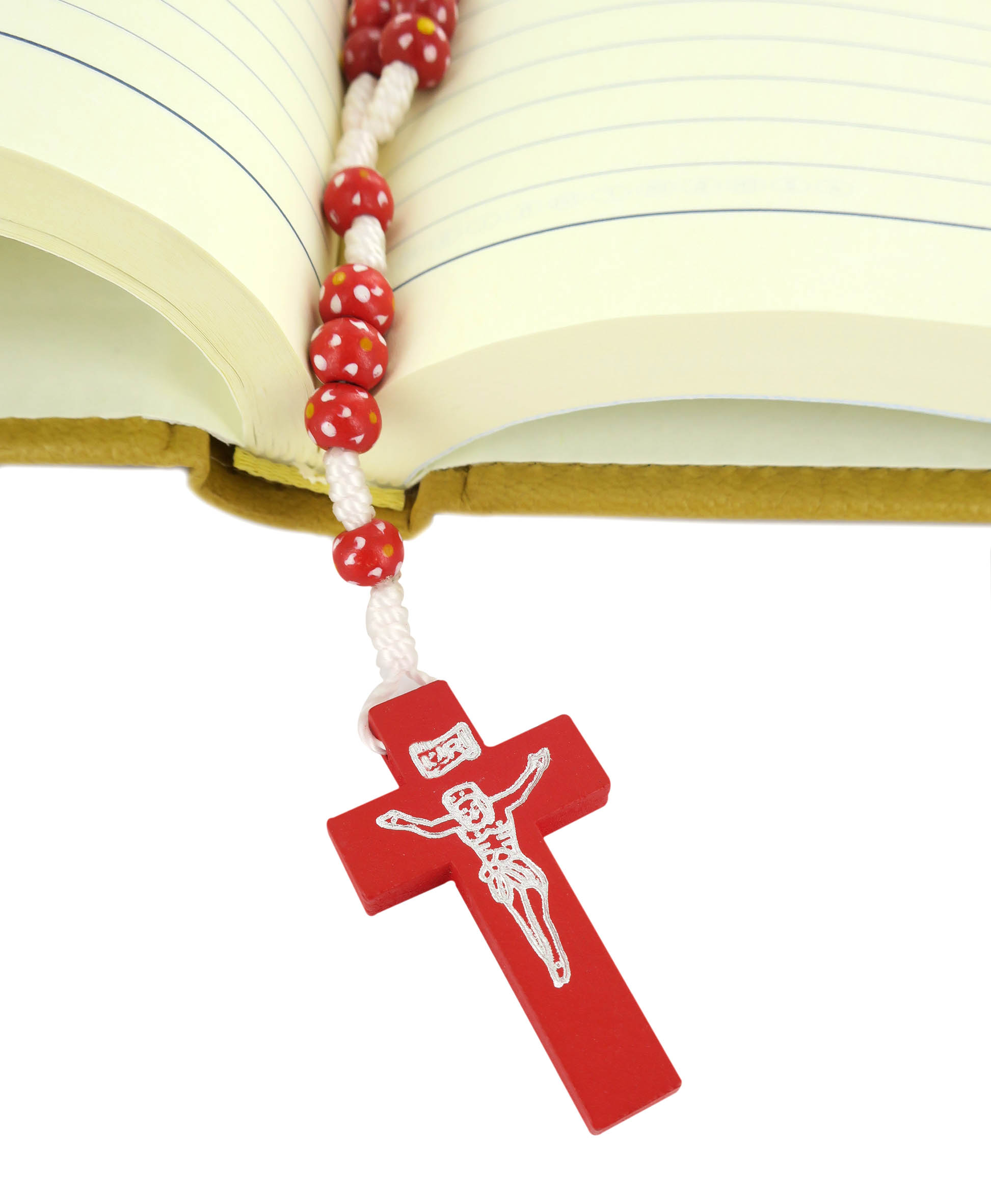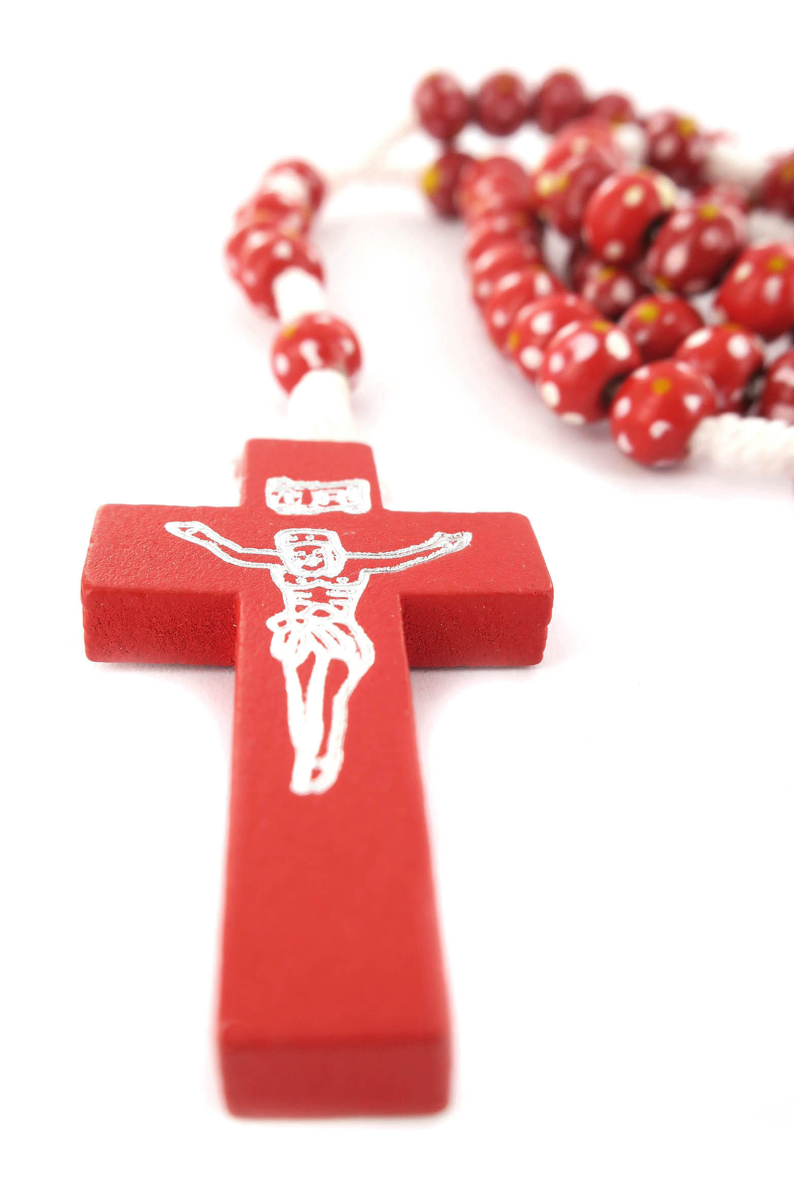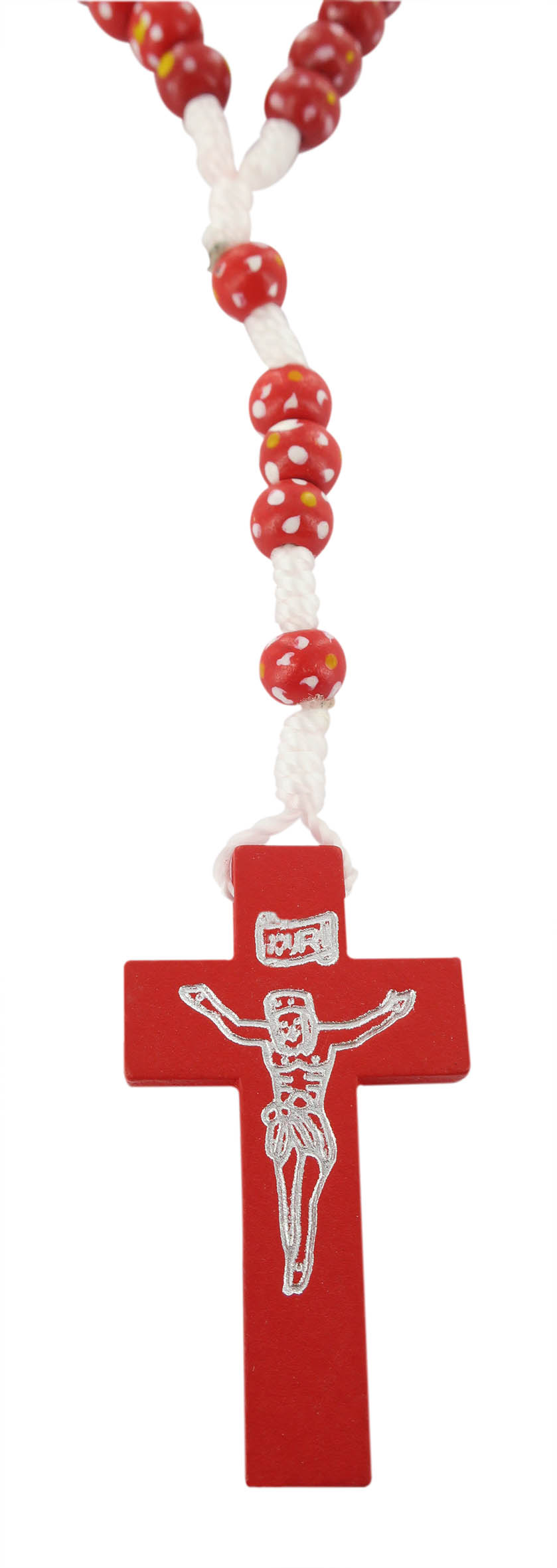 Ogni grano è di millimetri 7 e sulla croce in legno è impresso il corpo di Cristo in colore argento.