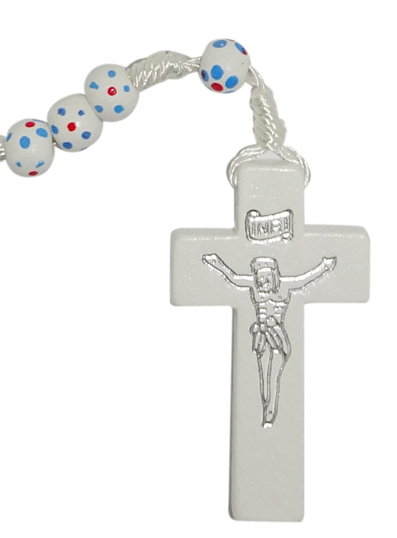 Rosario con grani tondi in legno bianco con fiore blu e rosso e legatura a mano con filo bianco.