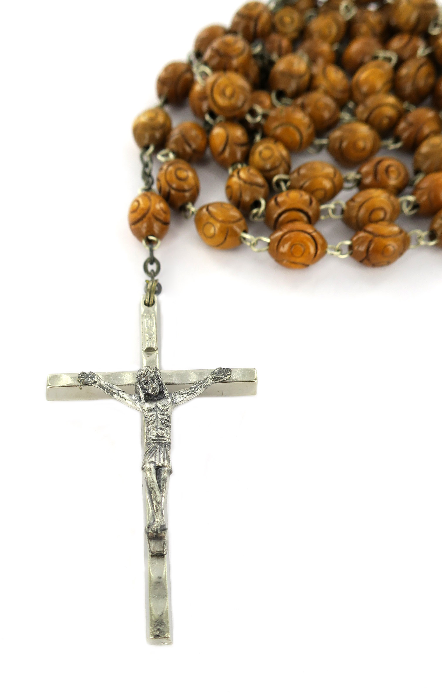 Rosario in legno lavorato diametro 6 mm con legatura in ottone argentato naturale