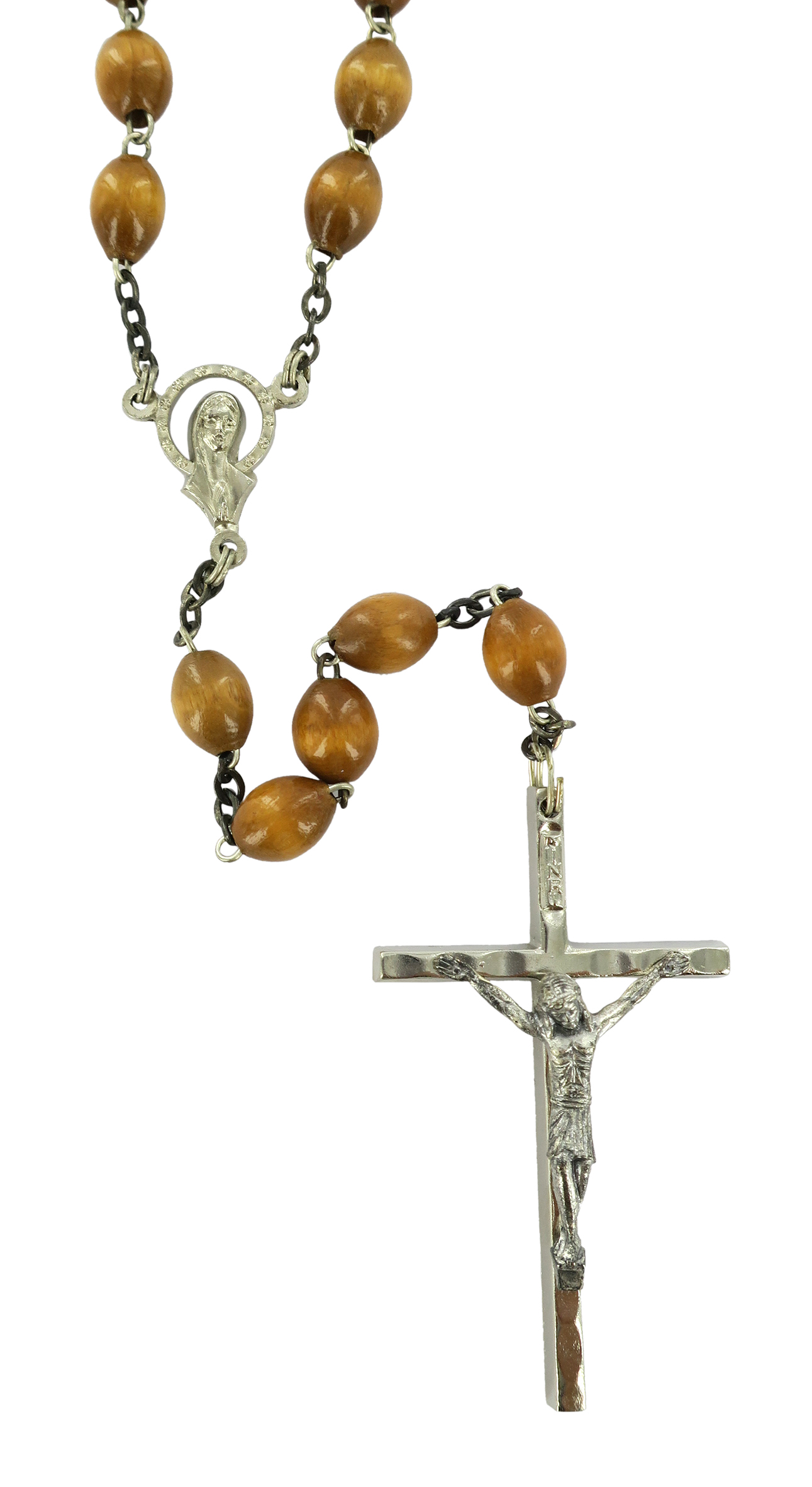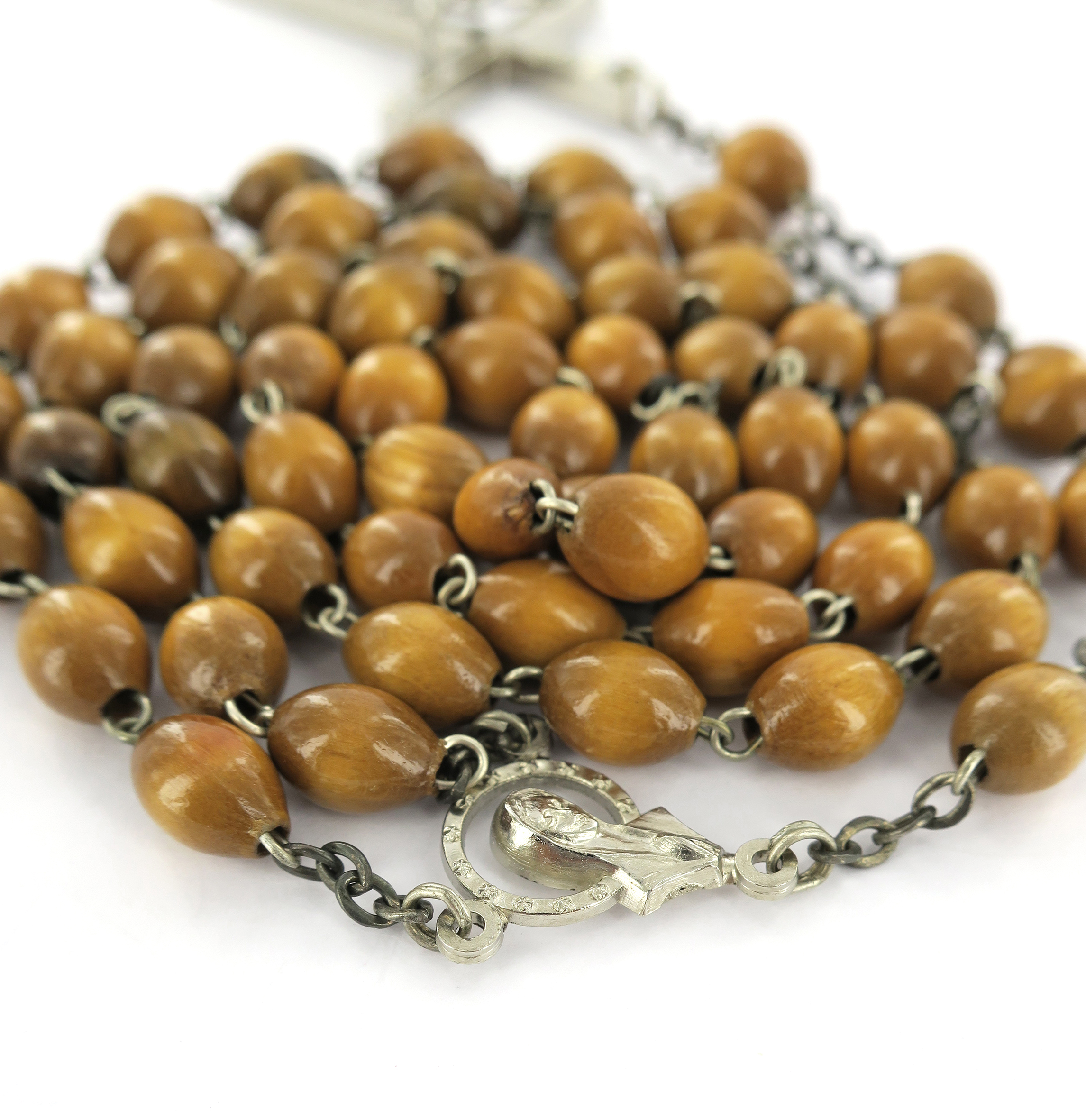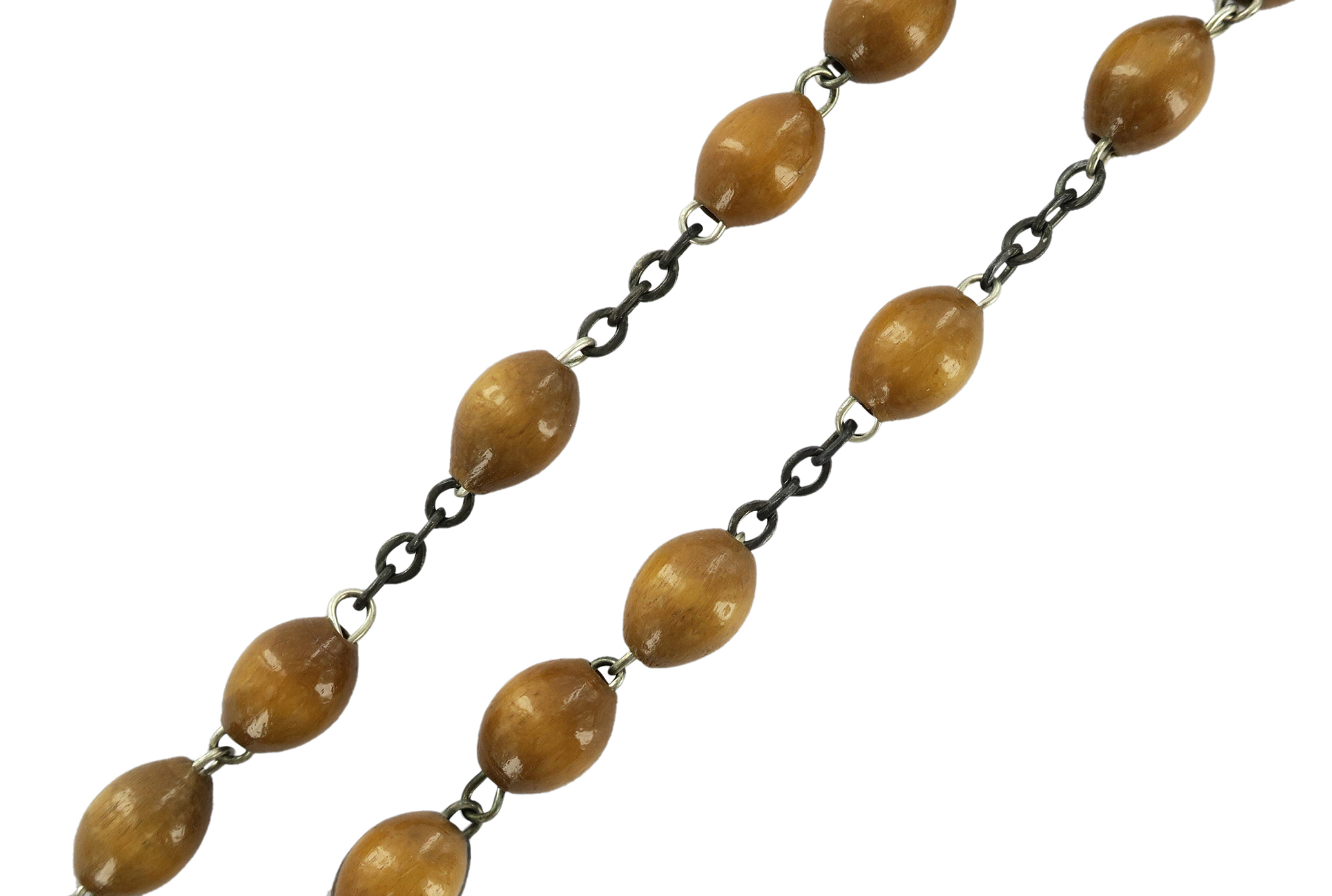 Rosario in legno naturale ovale mm 6 legatura ottone argentato