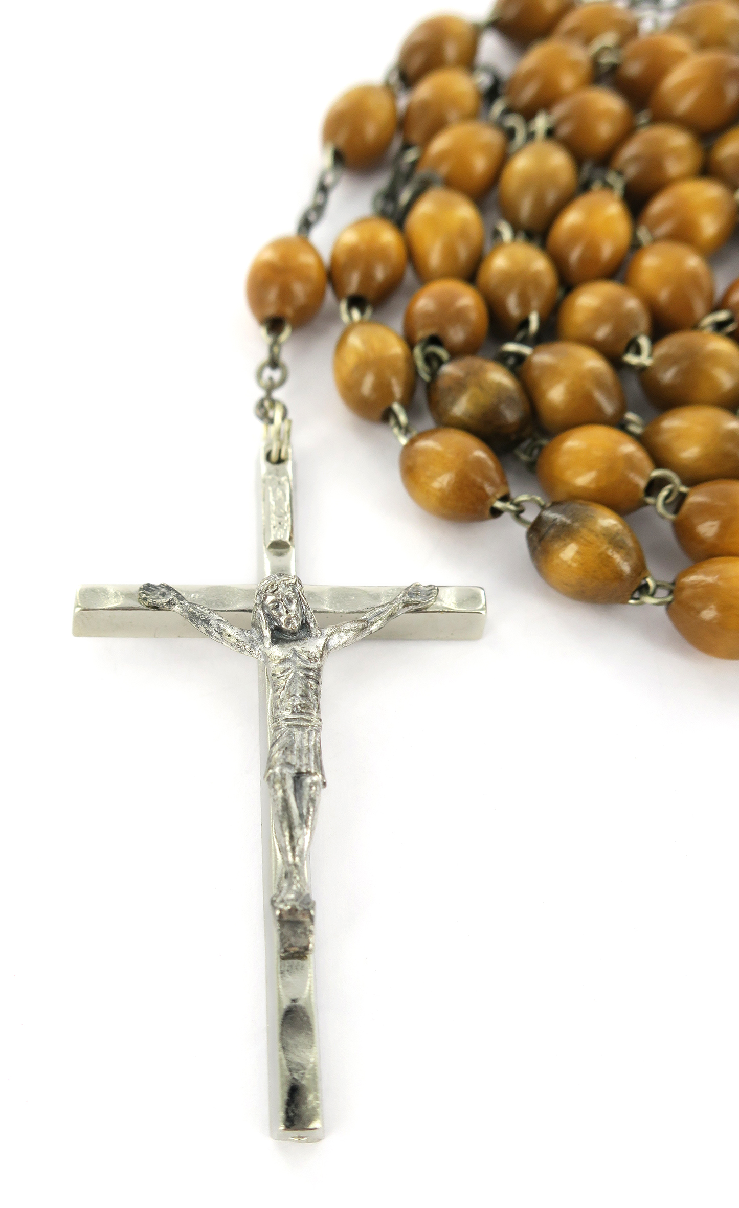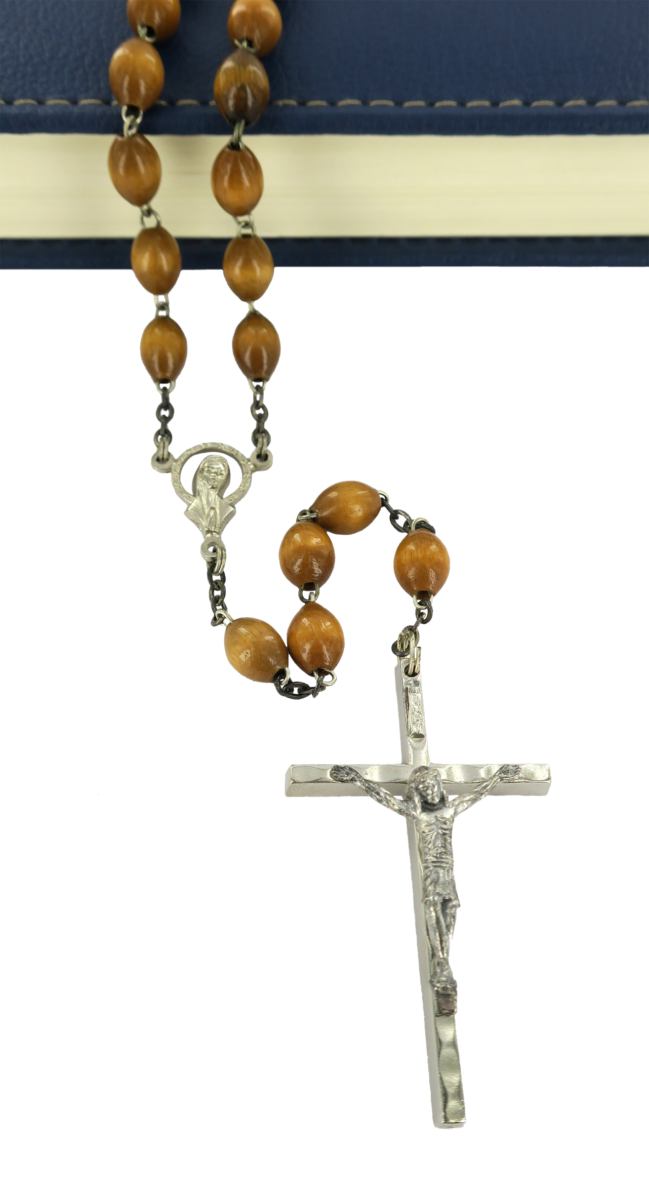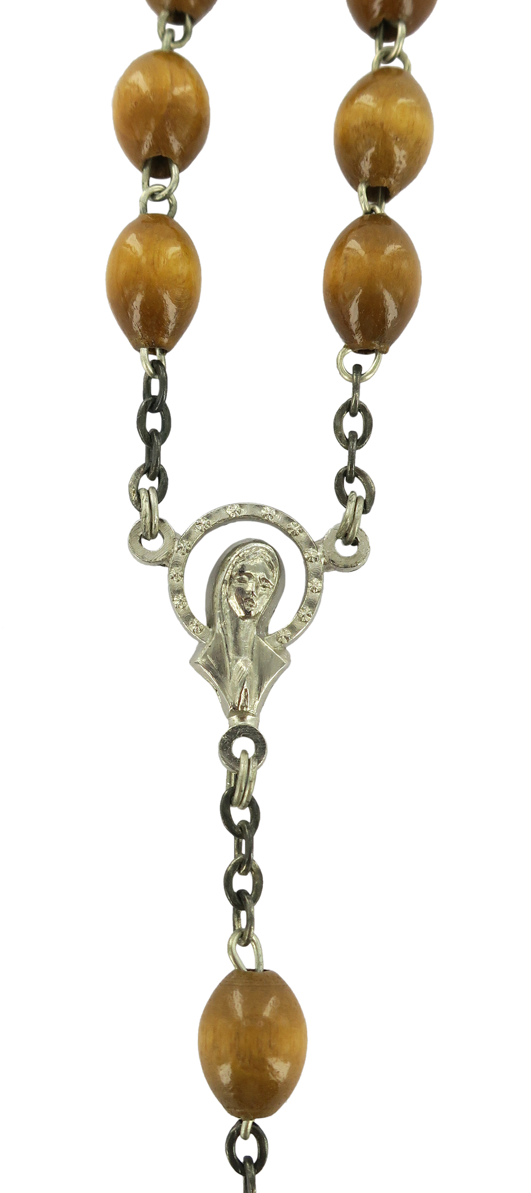 Rosario con legatura fatta a mano in ottone argentato con grani ovali in legno naturale. Sulla Crociera è visibile da un lato l'immagine della Madonna di Lourdes e dall'altro l'immagine della Madonna. Il prodotto è completamente realizzato in Italia. Il Santo Rosario è stato l'oggetto delle più vigile attenzione e premurosa sollecitudine da parte di tutti i Pontefici, che hanno visto il Rosario come una preghiera contemplativa che è insieme di lode e di supplica, efficace nel promuovere la vita cristiana e l'impegno apostolico. Anche Paolo VI e Giovanni Paolo II più volte hanno rivolto ai cristiani un appello perchè fossero innalzate supplici preghiere alla Beata Vergine del Rosario, per implorare da Dio il bene supremo della pace e il risveglio della vita cristiana.