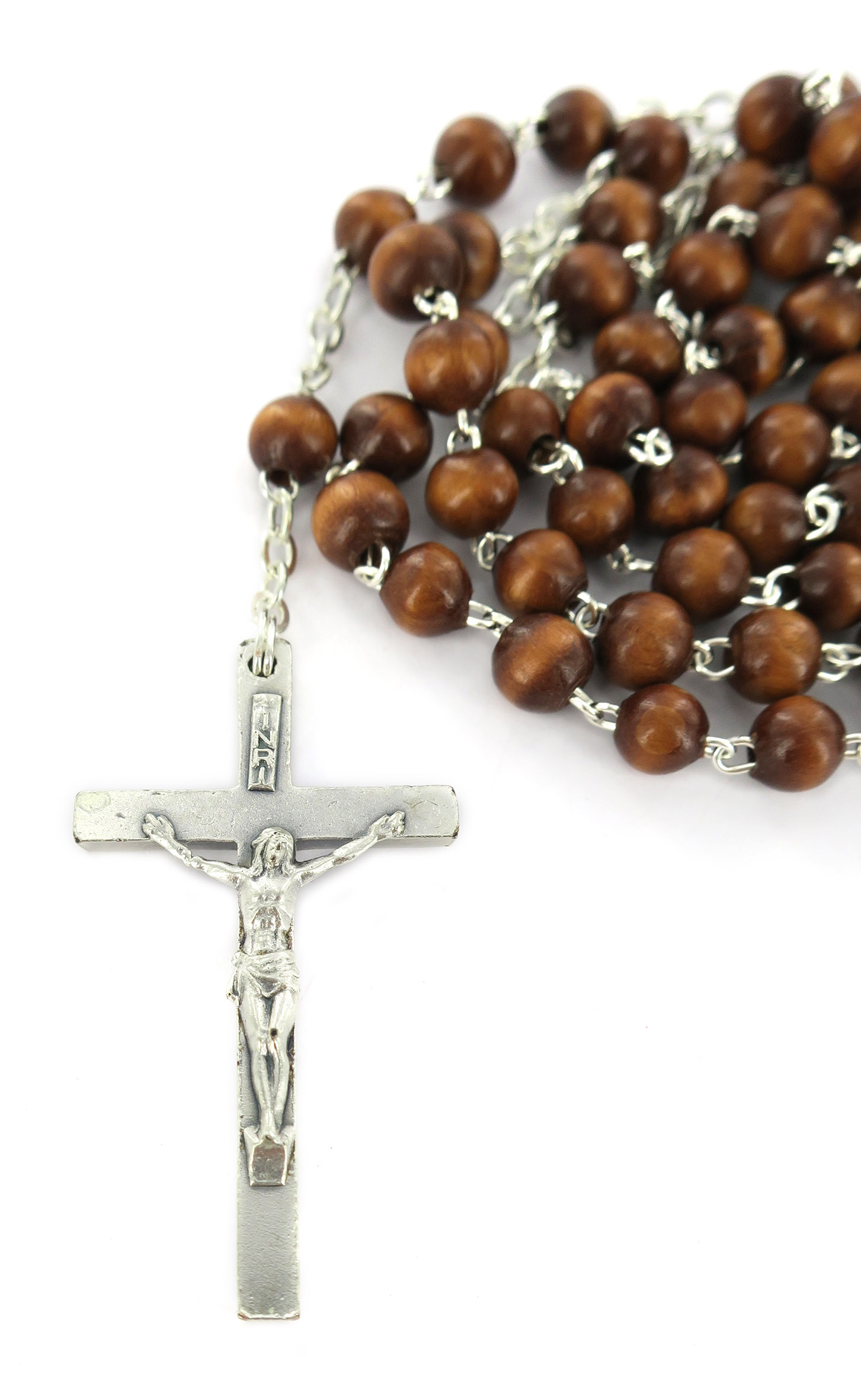 Rosario con legatura fatta a mano in ottone argentato con grani rotondi in legno naturale.