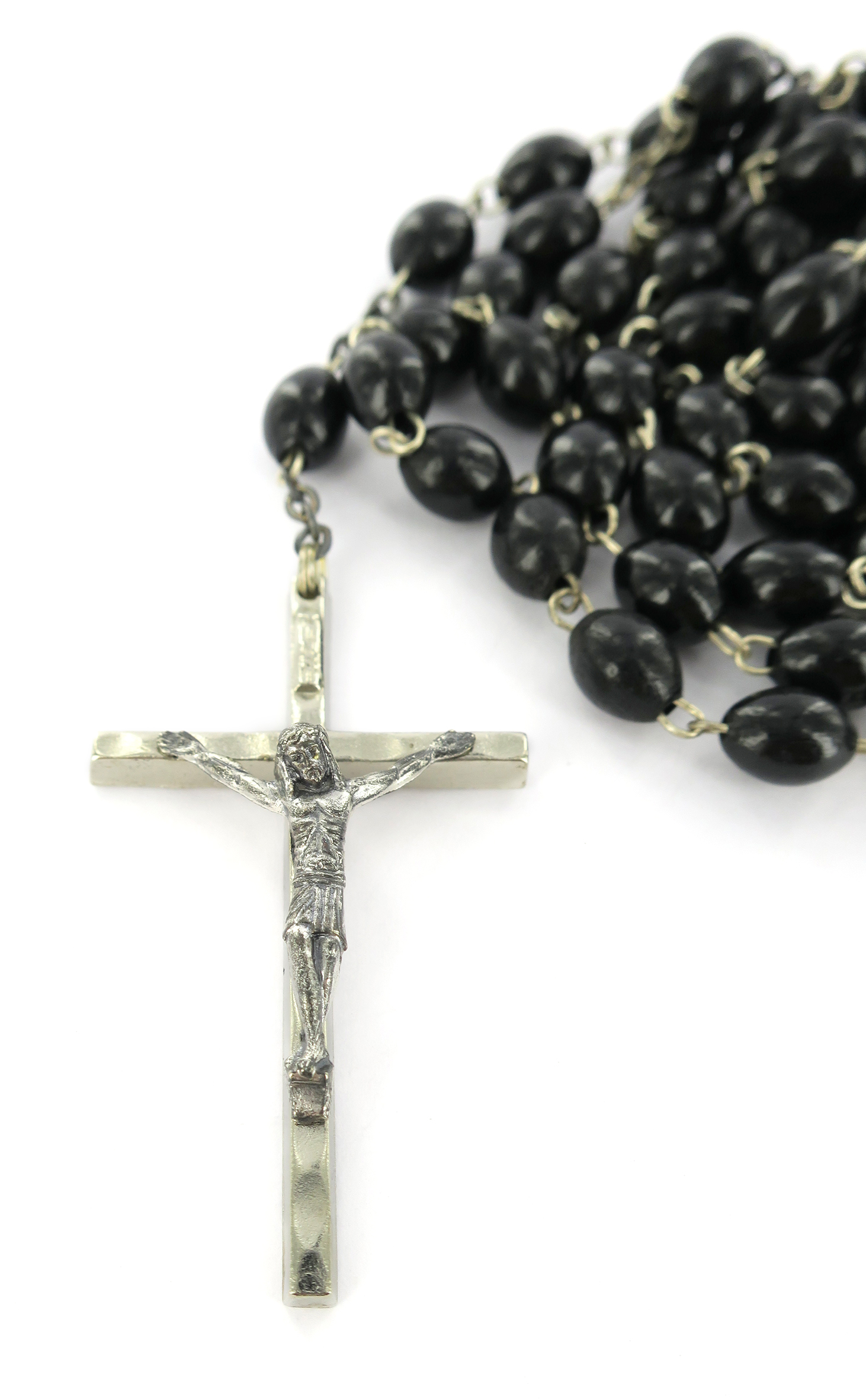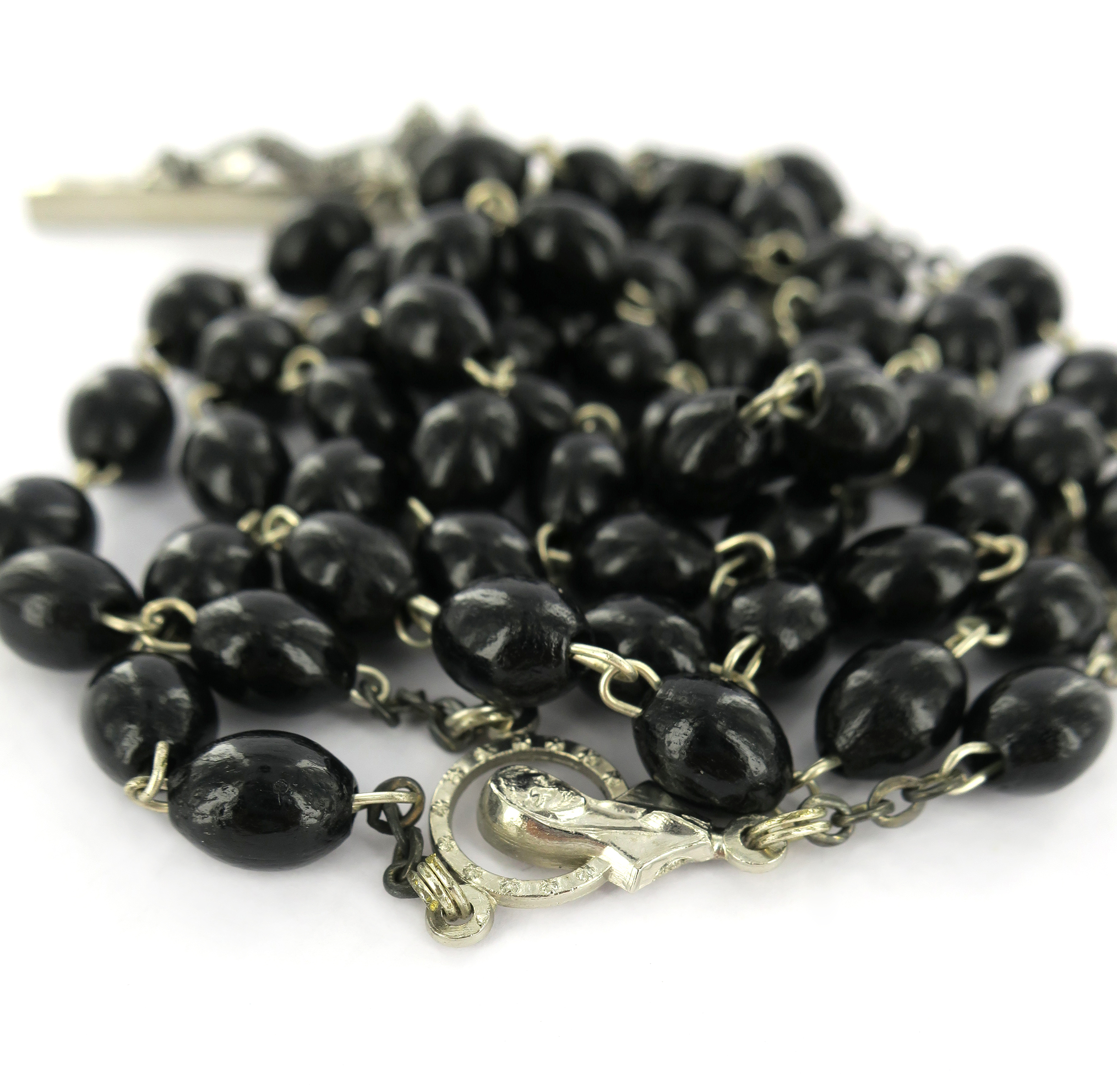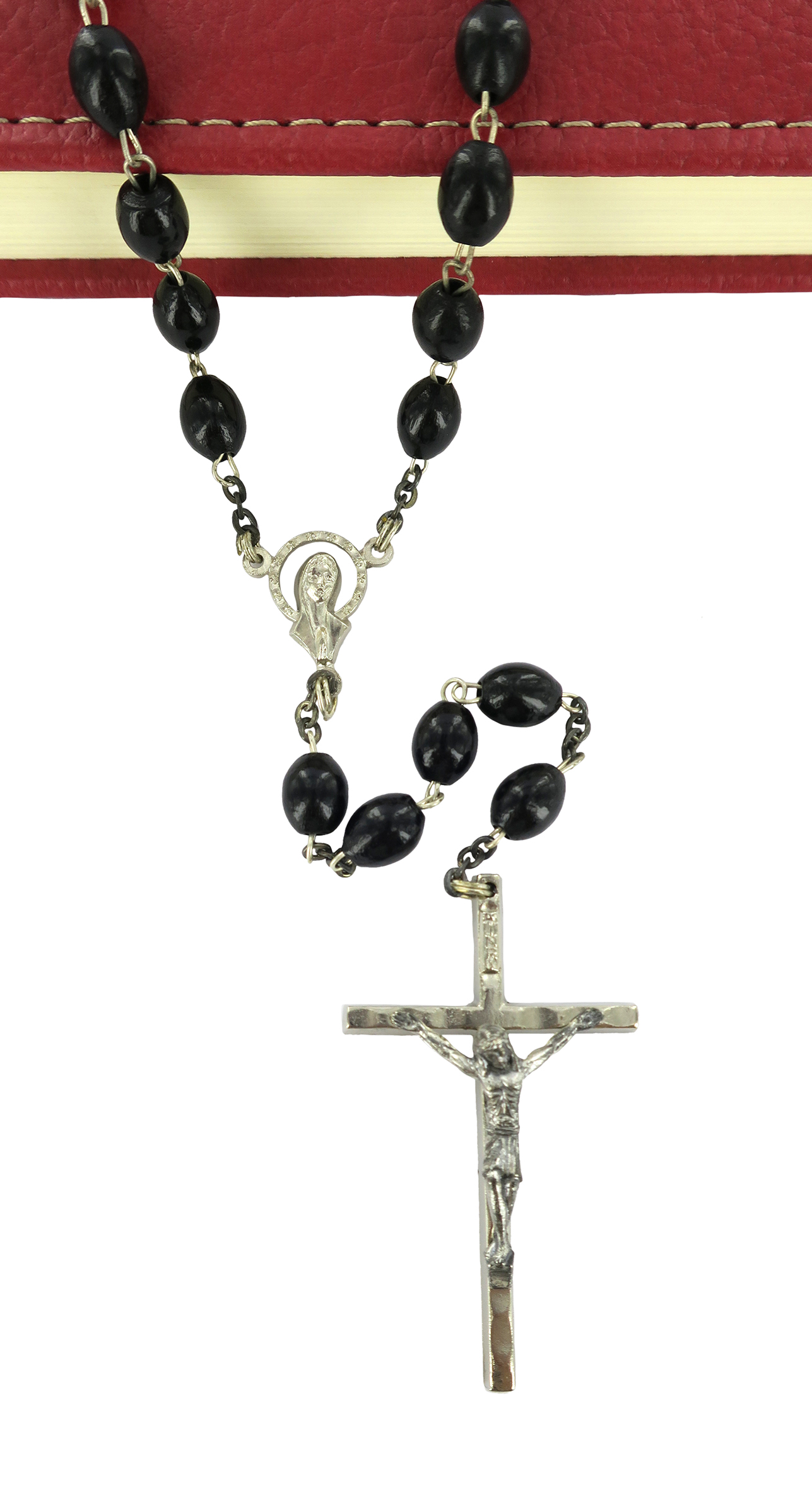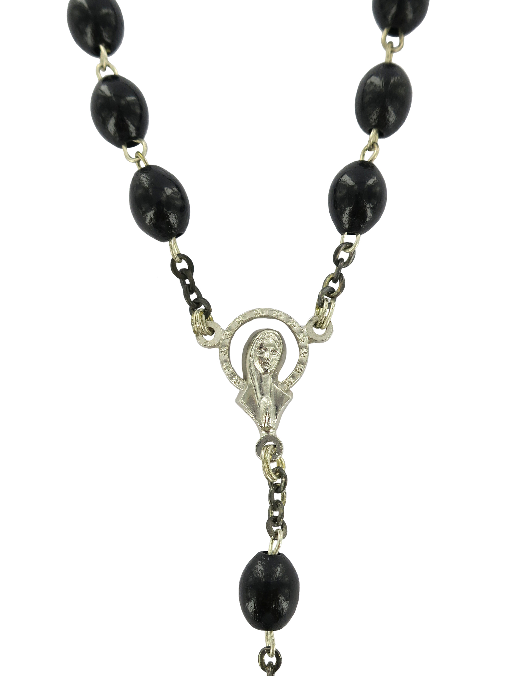 Rosario con legatura fatta a mano in ottone argentato con grani ovali in legno di colore nero. Sulla Crociera è visibile da un lato l'immagine della Madonna di Lourdes e dall'altro l'immagine della Madonna. Il prodotto è completamente realizzato in Italia. Il Santo Rosario è stato l'oggetto delle più vigile attenzione e premurosa sollecitudine da parte di tutti i Pontefici, che hanno visto il Rosario come una preghiera contemplativa che è insieme di lode e di supplica, efficace nel promuovere la vita cristiana e l'impegno apostolico. Anche Paolo VI e Giovanni Paolo II più volte hanno rivolto ai cristiani un appello perchè fossero innalzate supplici preghiere alla Beata Vergine del Rosario, per implorare da Dio il bene supremo della pace e il risveglio della vita cristiana.