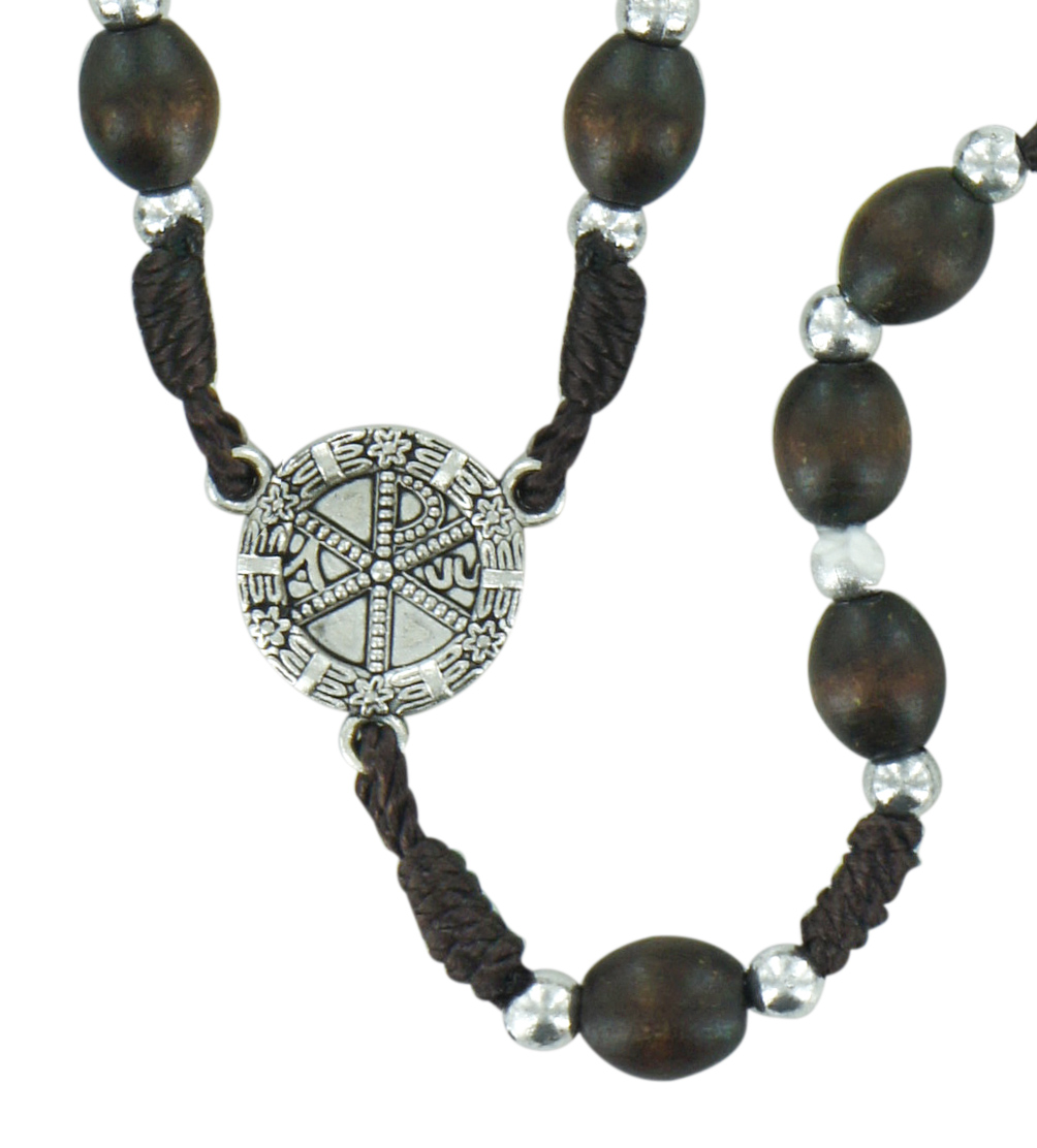 Rosario in legno ovale marrone con perline legatura seta.