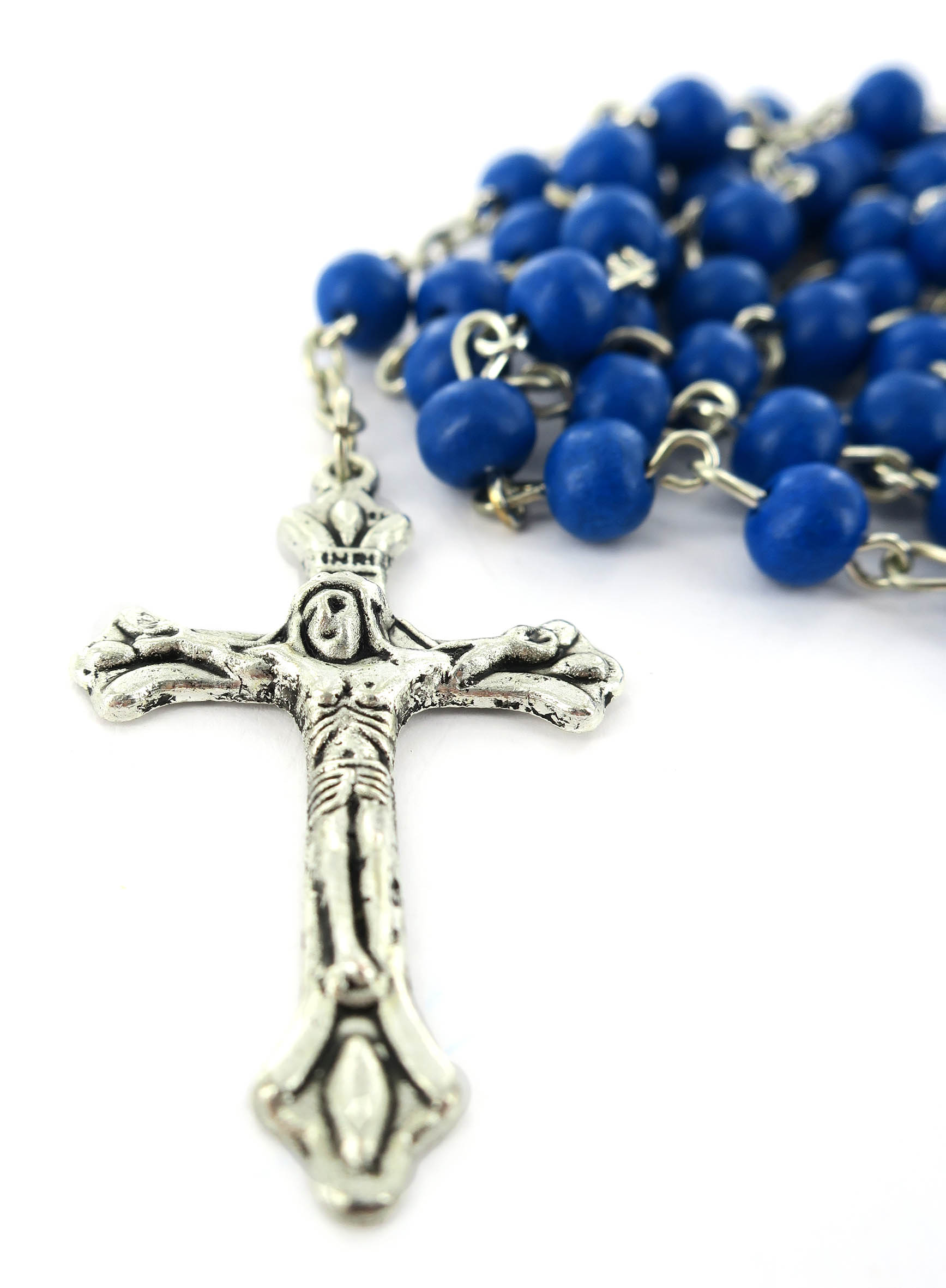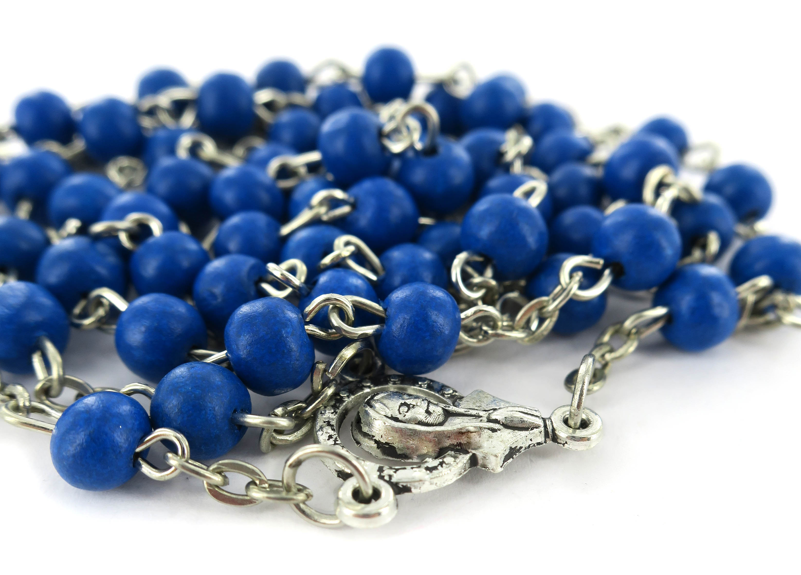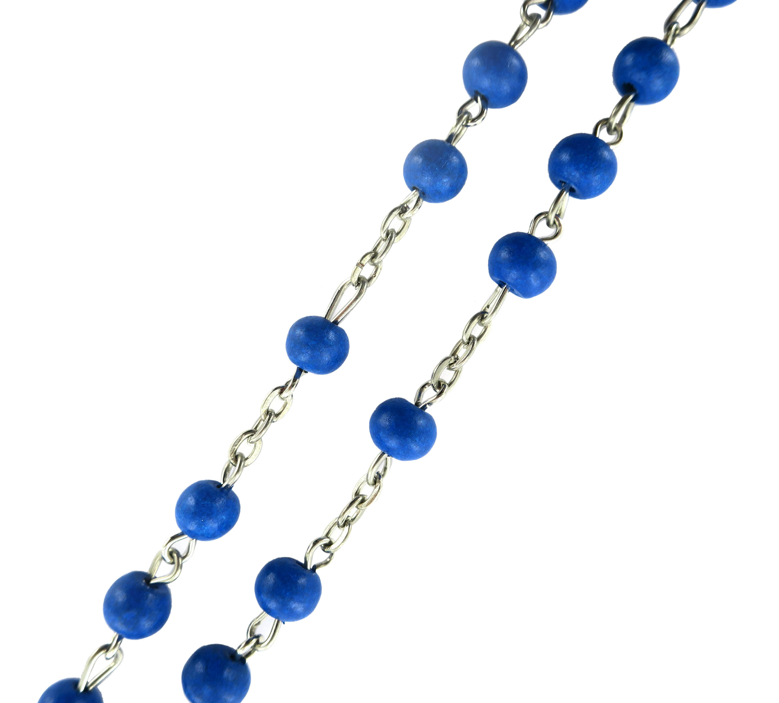 Rosario con legatura fatta a mano con grani rotondi in legno di colore blu. Sulla Crociera è visibile da un lato l'immagine della Madonna di Lourdes e dall'altro l'immagine della Madonna. Il Santo Rosario è stato l'oggetto delle più vigile attenzione e premurosa sollecitudine da parte di tutti i Pontefici, che hanno visto il Rosario come una preghiera contemplativa che è insieme di lode e di supplica, efficace nel promuovere la vita cristiana e l'impegno apostolico. Anche Paolo VI e Giovanni Paolo II più volte hanno rivolto ai cristiani un appello perchè fossero innalzate supplici preghiere alla Beata Vergine del Rosario, per implorare da Dio il bene supremo della pace e il risveglio della vita cristiana.