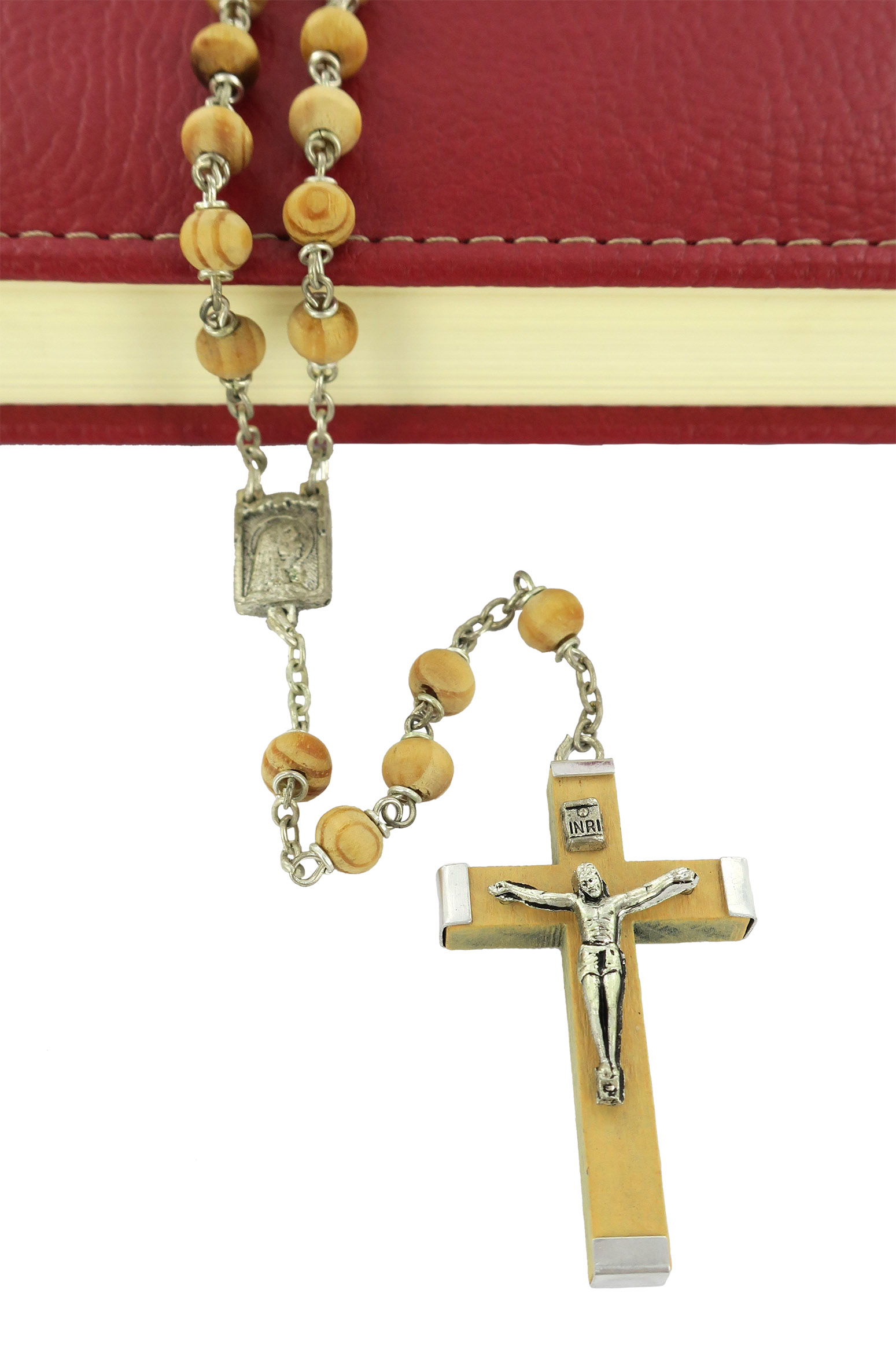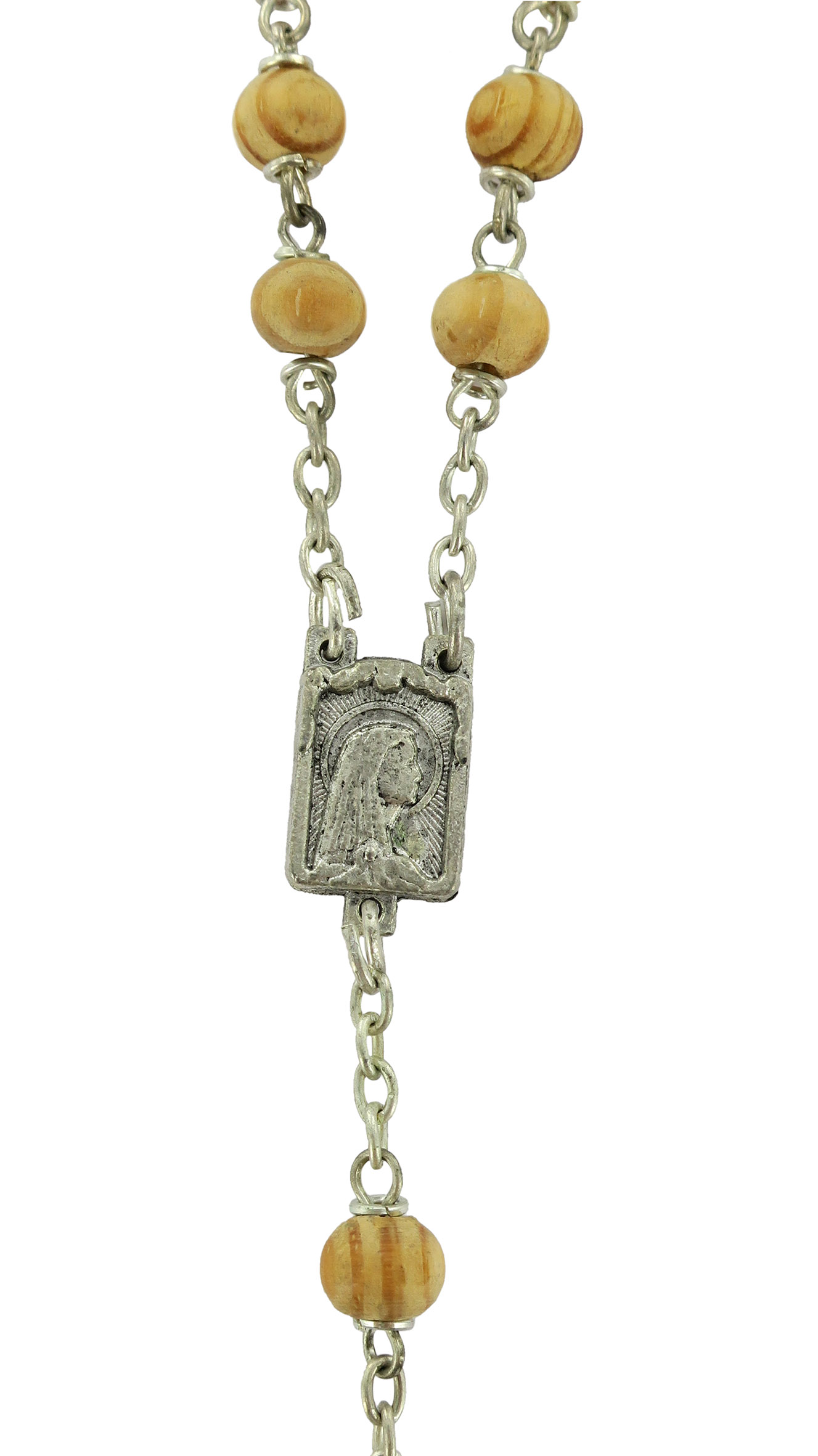 Rosario con legatura fatta a mano con grani rotondi in legno chiaro. Sulla Crociera è visibile da un lato l'immagine della Madonna di Lourdes e dall'altro l'immagine della Madonna. Il Santo Rosario è stato l'oggetto delle più vigile attenzione e premurosa sollecitudine da parte di tutti i Pontefici, che hanno visto il Rosario come una preghiera contemplativa che è insieme di lode e di supplica, efficace nel promuovere la vita cristiana e l'impegno apostolico. Anche Paolo VI e Giovanni Paolo II più volte hanno rivolto ai cristiani un appello perchè fossero innalzate supplici preghiere alla Beata Vergine del Rosario, per implorare da Dio il bene supremo della pace e il risveglio della vita cristiana.