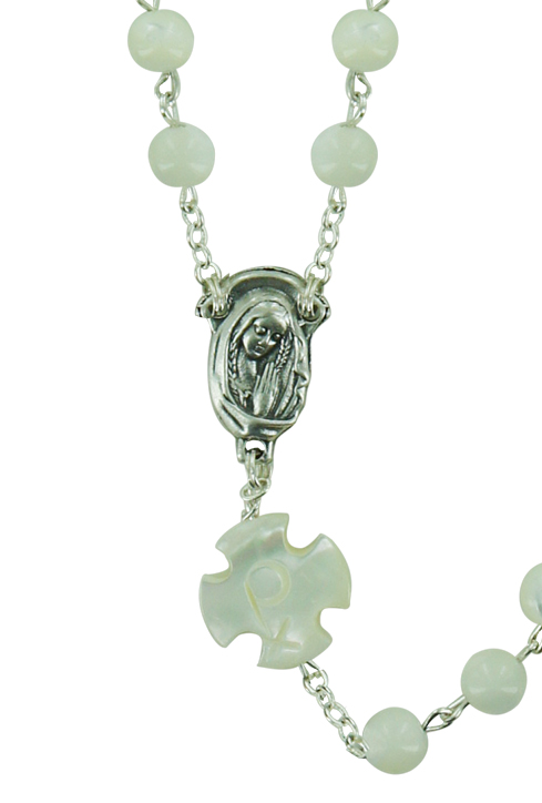 Il rosario si presenta con i grani di madreperla tondi del diametro 6 e il pater a forma di croce. Il tutto rilegato a mano con filo di metallo argentato. Croce con Cristo riportato, crociera ovale con Madonnina pregante.