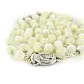 Il rosario si presenta con i grani di madreperla tondi del diametro 6. Il tutto rilegato a mano con filo di metallo argentato. Croce con Cristo riportato, crociera ovale con Madonnina pregante.
