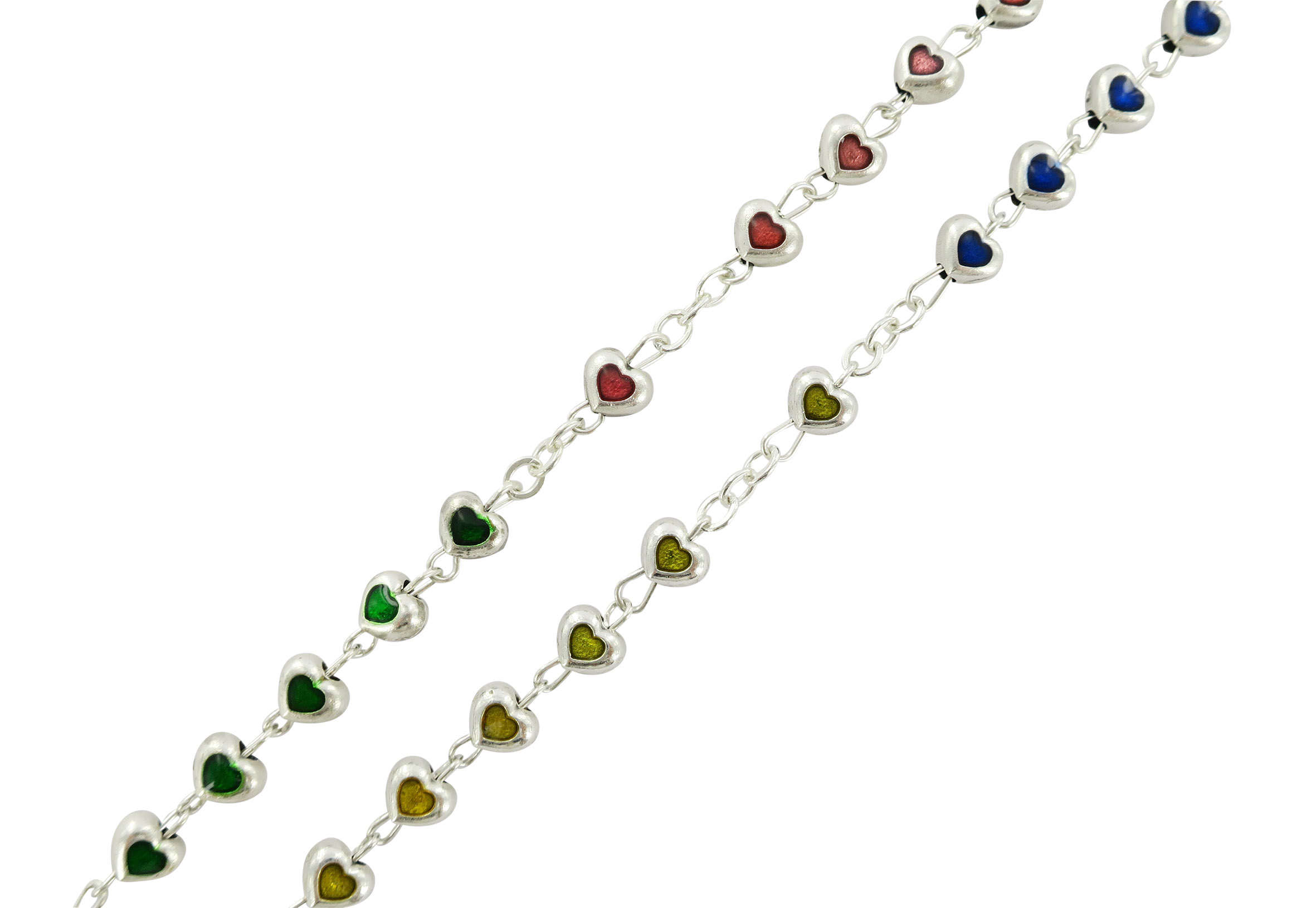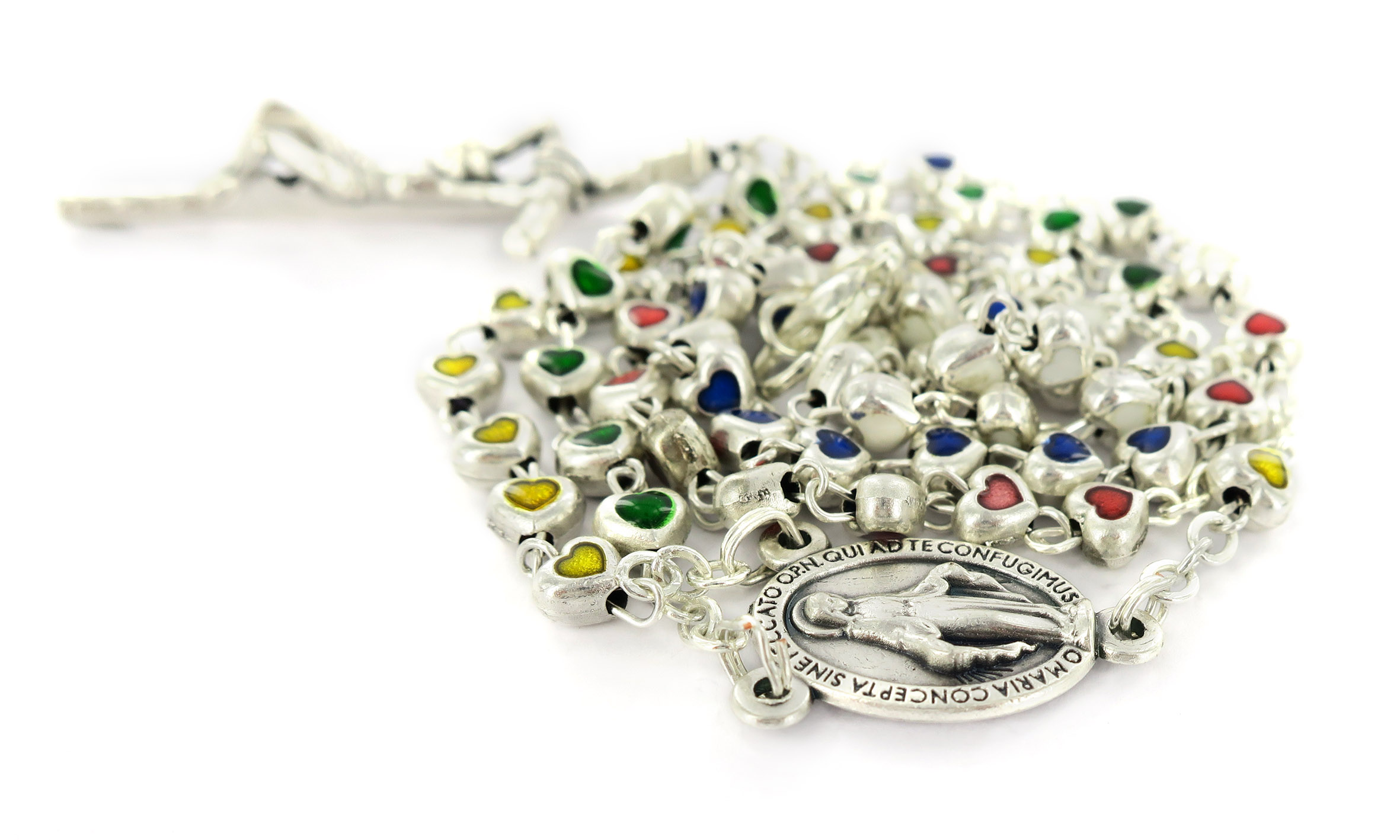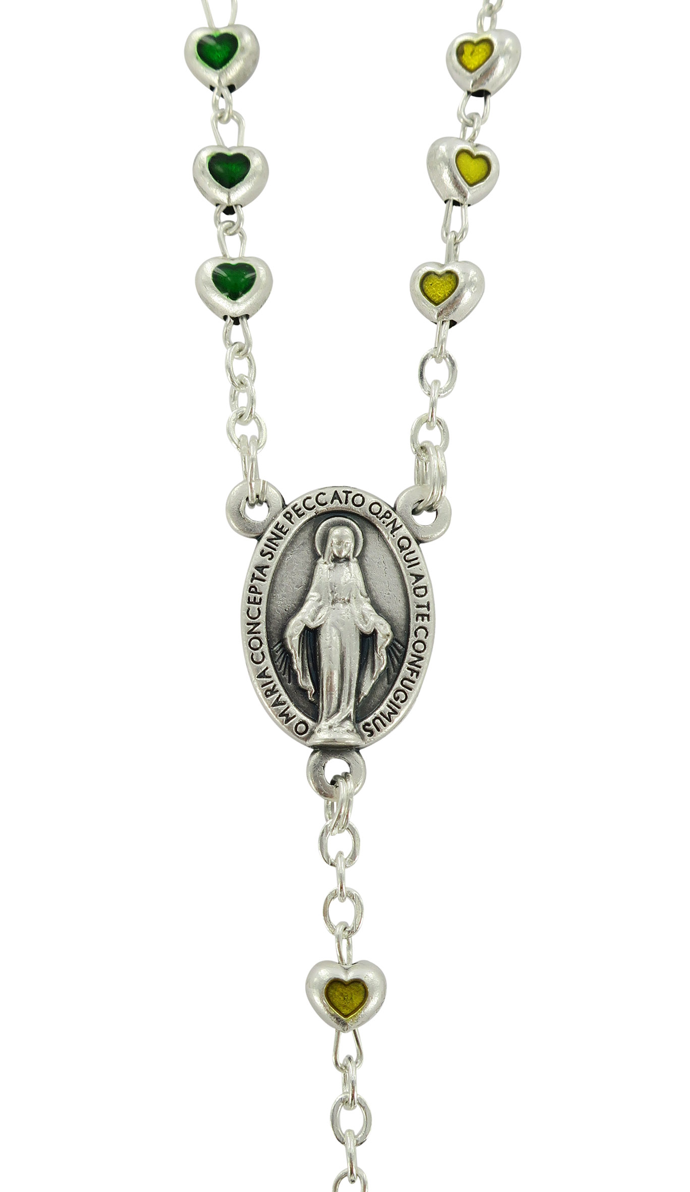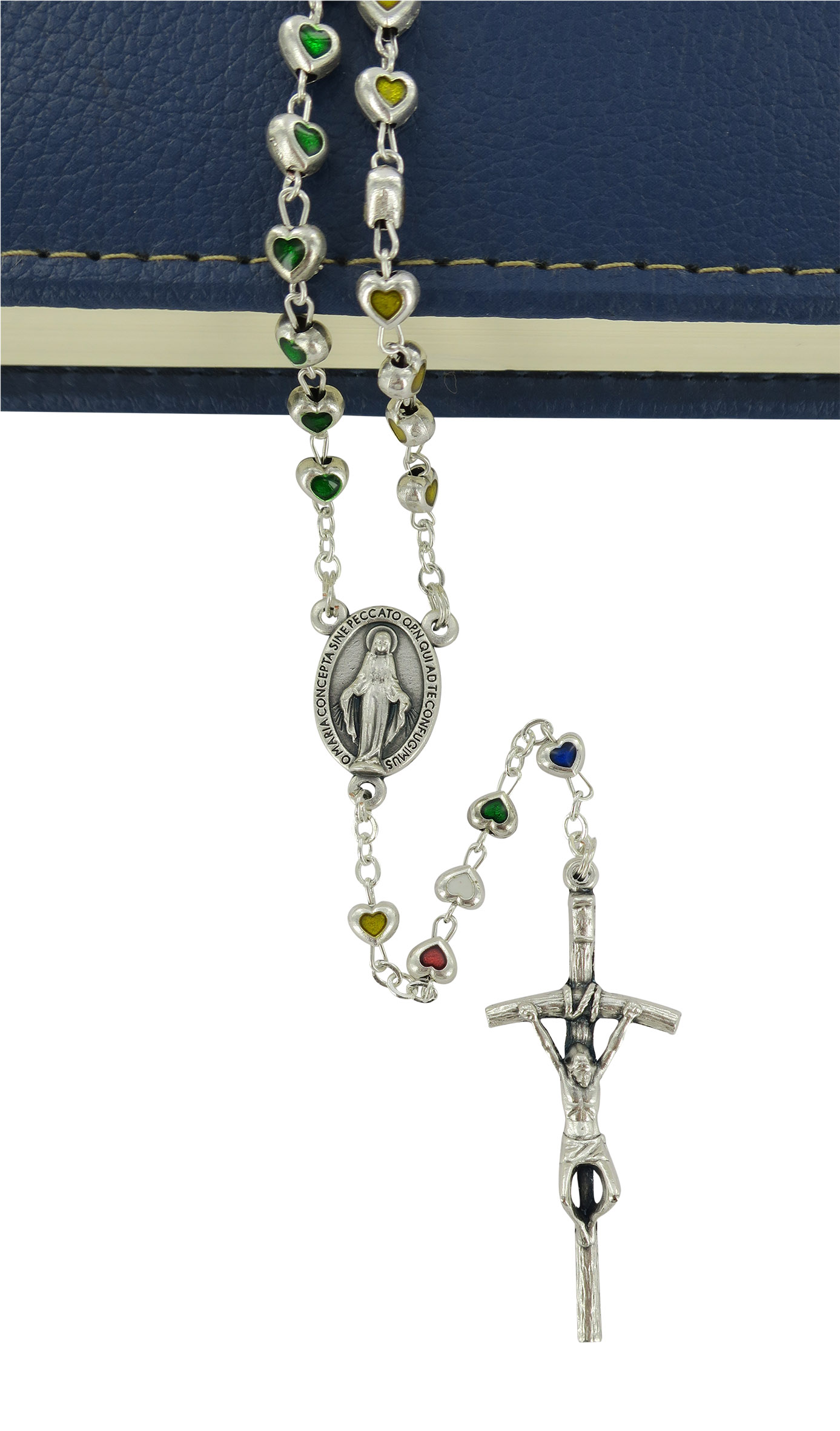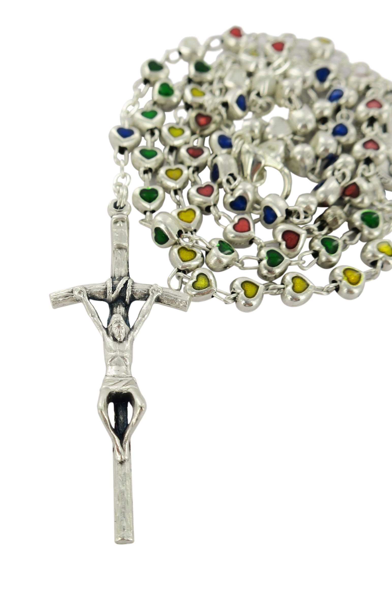 Rosario cuoricino missionario in metallo argentato con moschettone