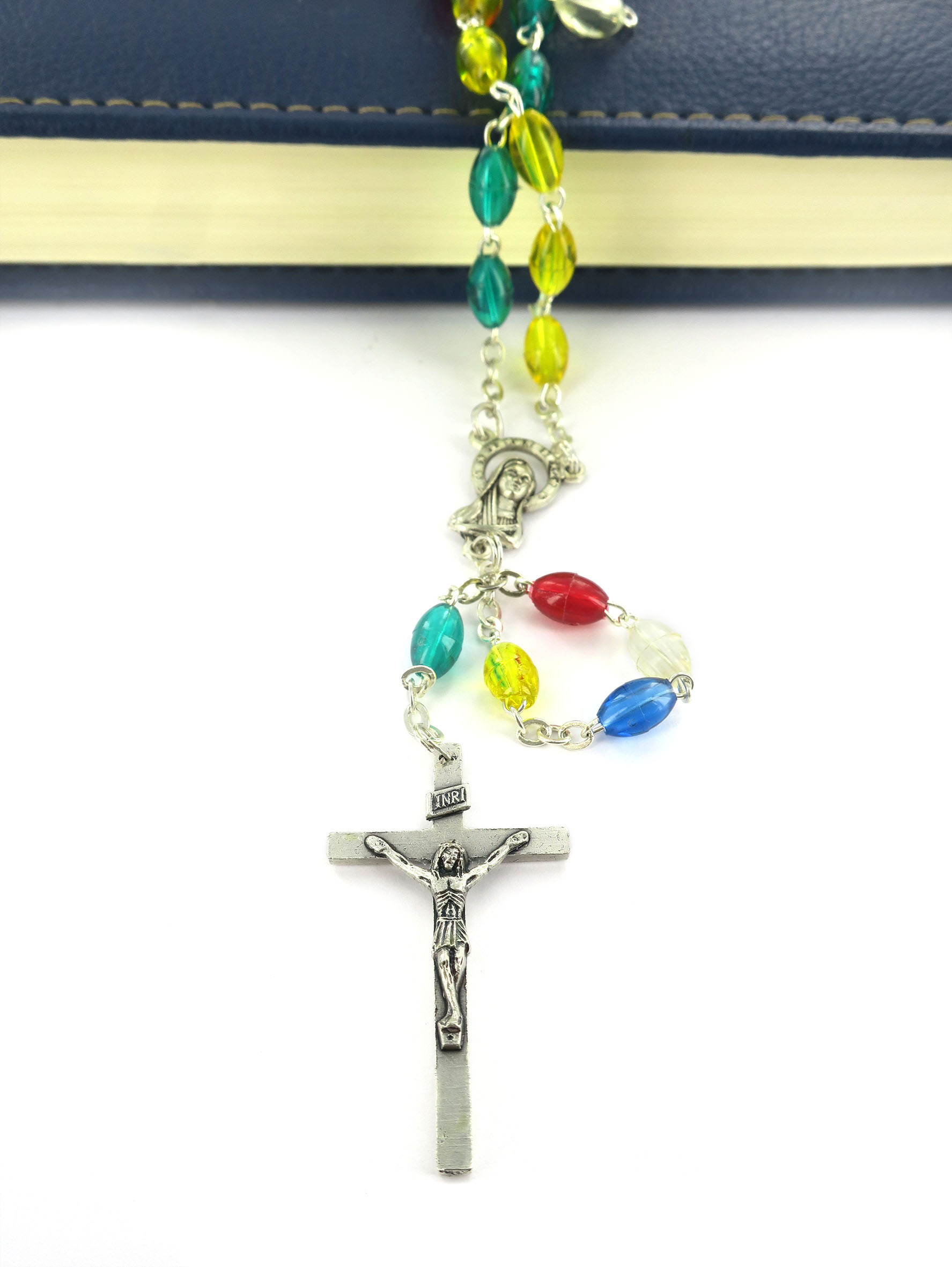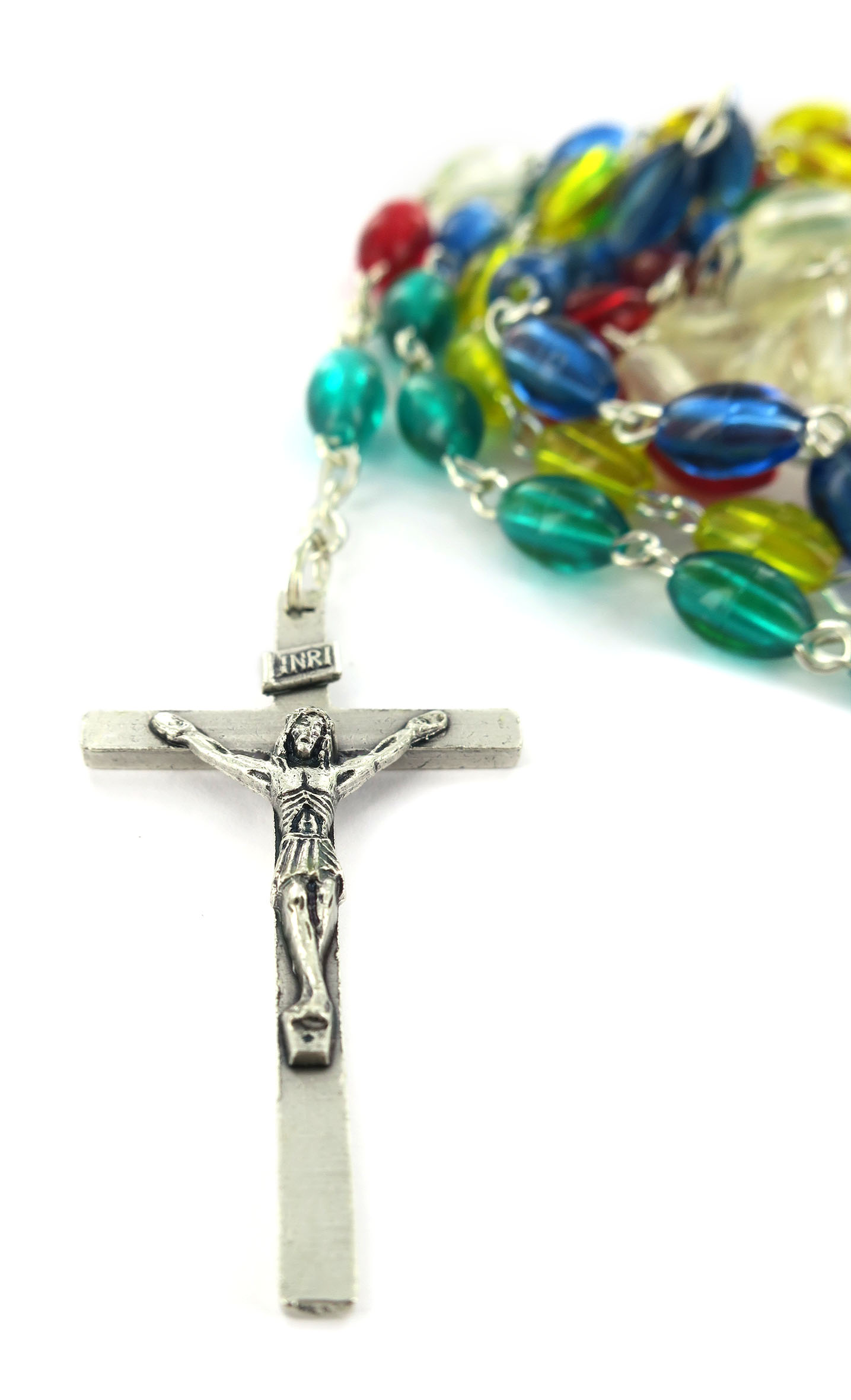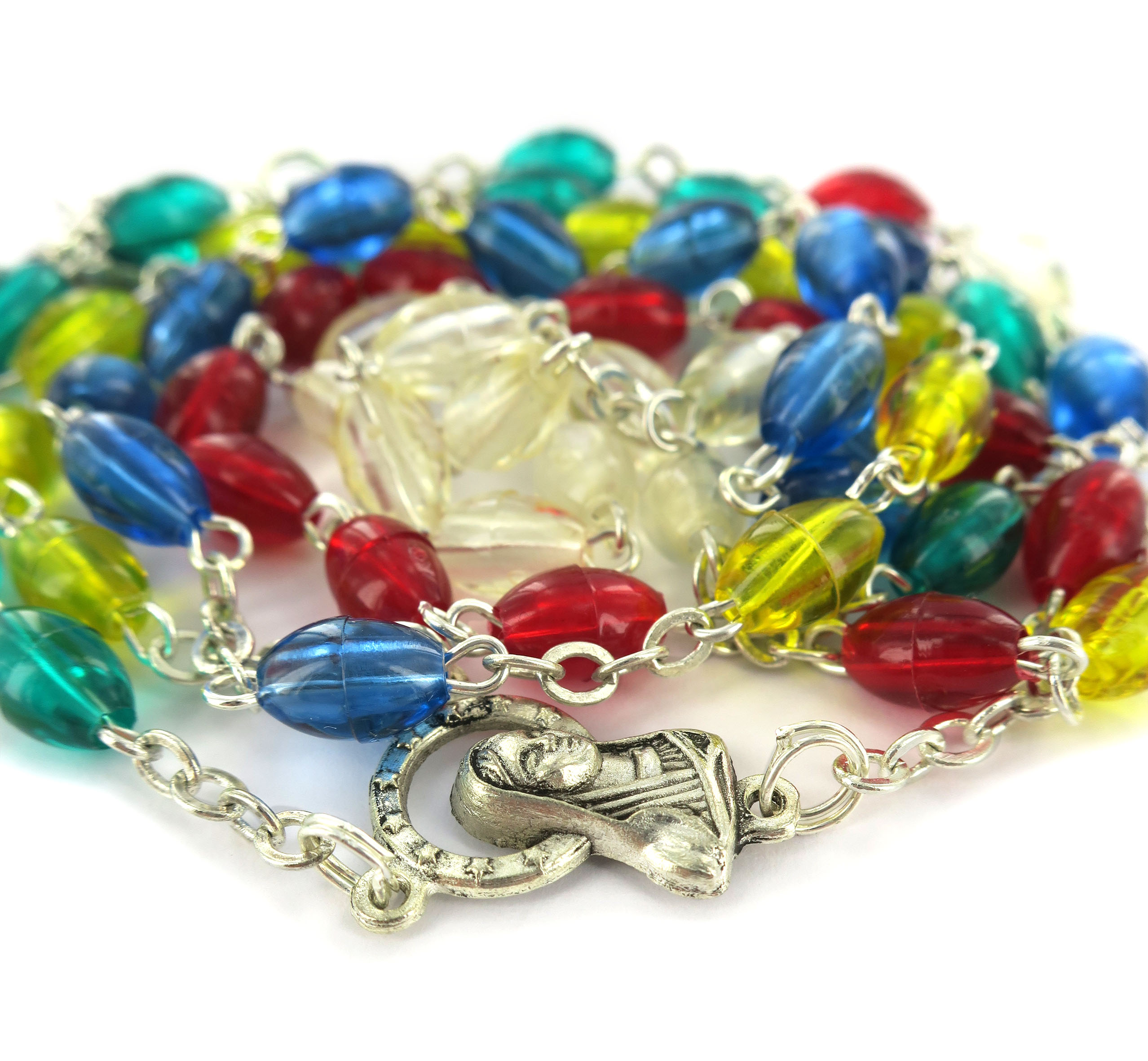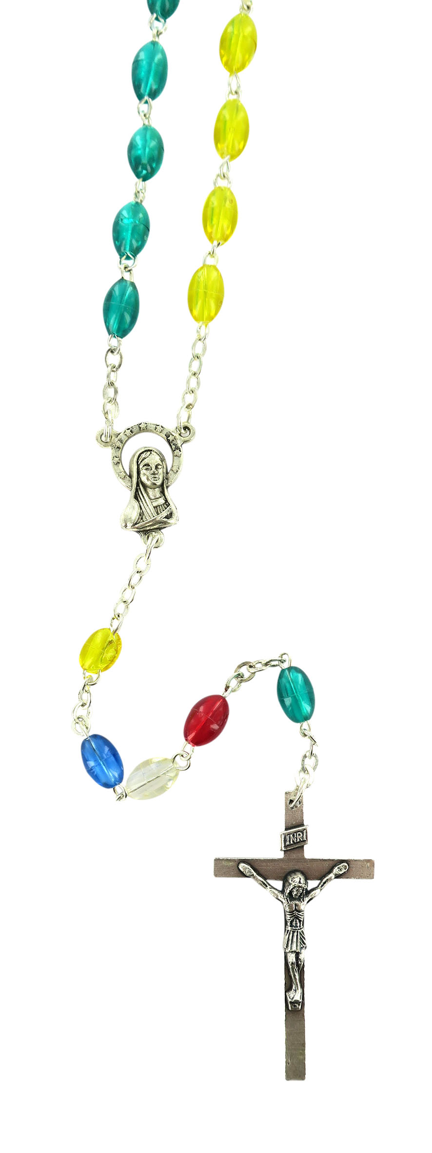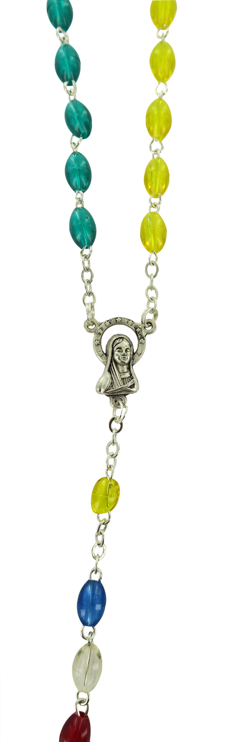 Rosario missionario plastica ovale legatura a macchina in metallo nichelato Il Rosario missionario ha lo scopo di far pregare per la pace nel mondo e per la conversione di tutti gli uomini. I cinque colori diversi rappresentano i cinque continenti e richiamano l'intenzione secondo la quale si deve pregare. La decina del Rosario, quella bianca è per la vecchia EUROPA, perche' sia capace di riappropriarsi della forza evangelizzatrice che ha generato tante Chiese; la decina gialla è per l'ASIA, che esplode di vita e di giovinezza; la decina verde è per l'AFRICA, provata dalla sofferenza, ma disponibile all'annuncio; la decina rossa è per l'AMERICA, vivaio di nuove forze missionarie; la decina azzurra è per il continente dell'OCEANIA e dell'Australia che attende una più capillare diffusione del Vangelo.