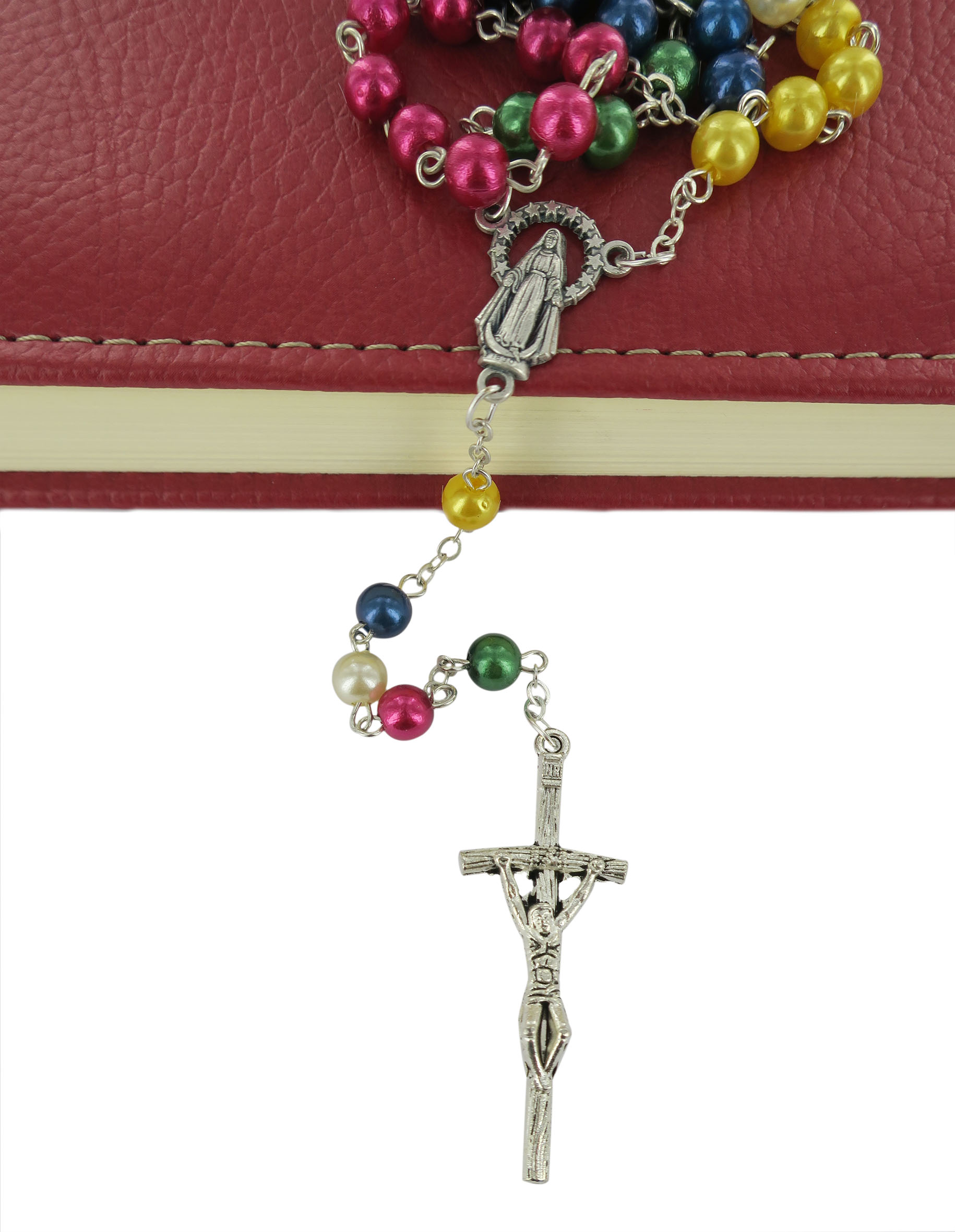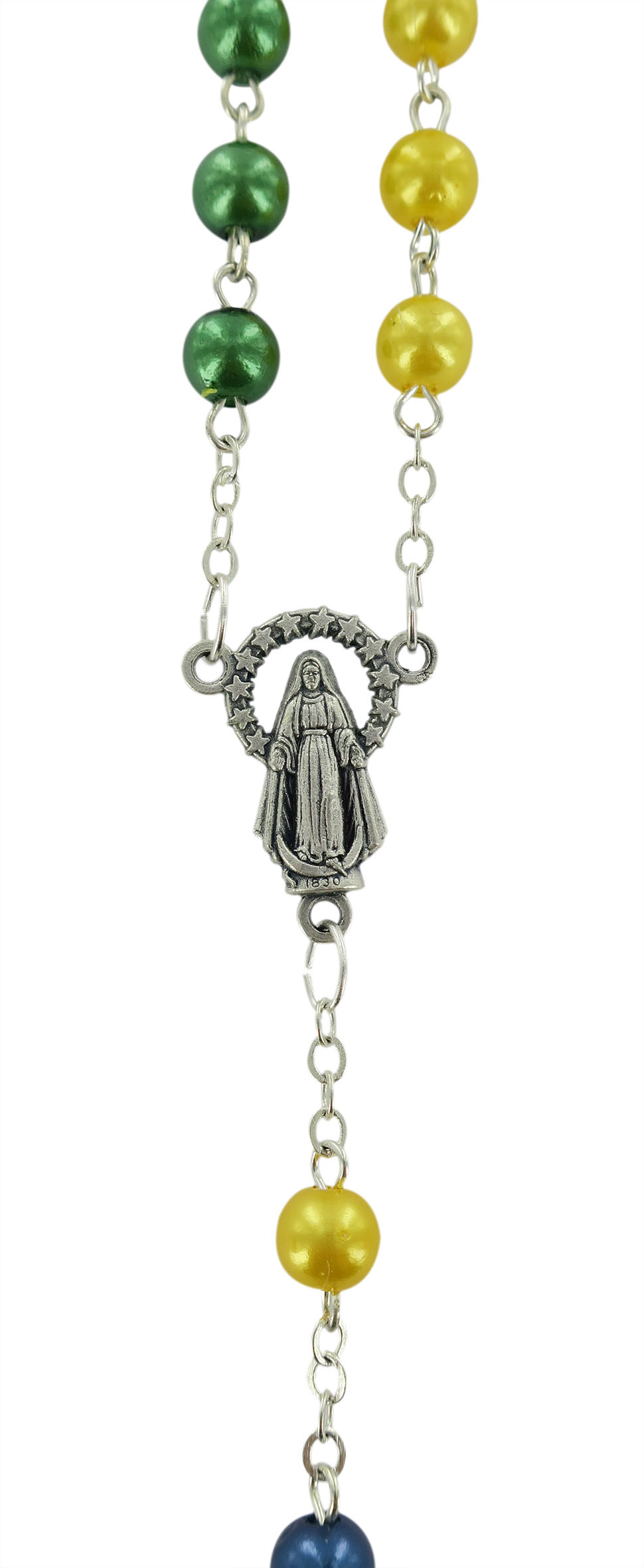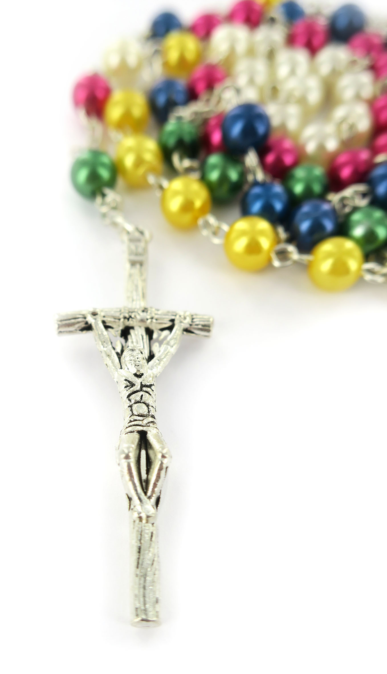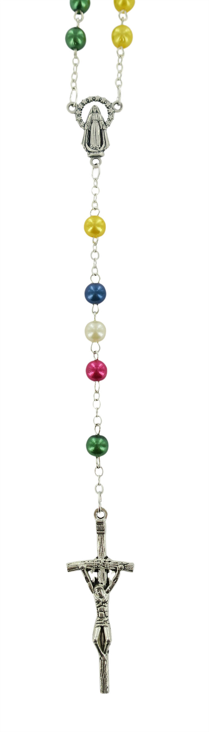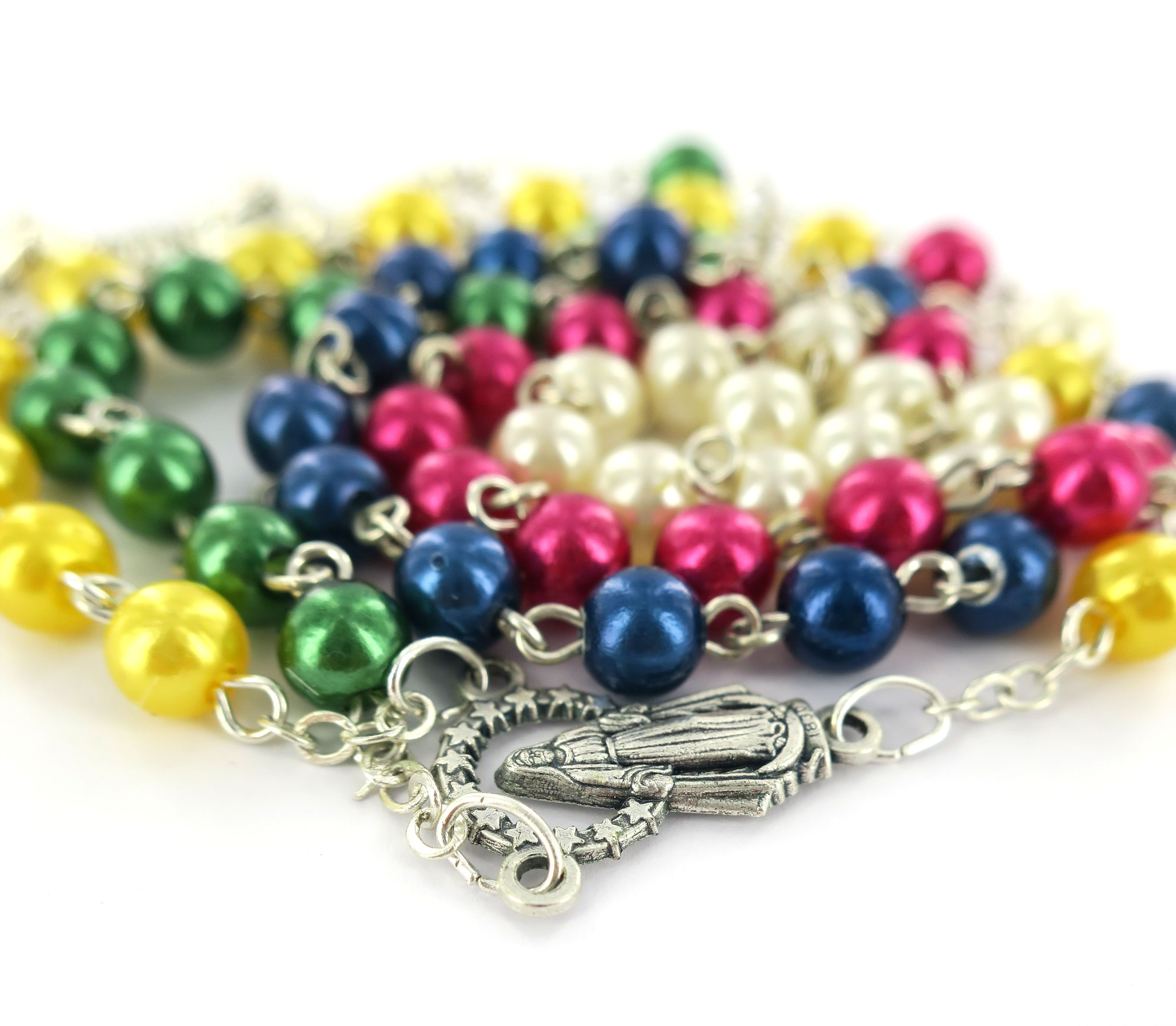 I cinque colori diversi rappresentano i cinque continenti e richiamano l'intenzione secondo la quale si deve pregare. La decina del Rosario, quella bianca è per la vecchia EUROPA, perche' sia capace di riappropriarsi della forza evangelizzatrice che ha generato tante Chiese; la decina gialla è per l'ASIA, che esplode di vita e di giovinezza; la decina verde è per l'AFRICA, provata dalla sofferenza, ma disponibile all'annuncio; la decina rossa è per l'AMERICA, vivaio di nuove forze missionarie; la decina azzurra è per il continente dell'OCEANIA e dell'Australia che attende una più capillare diffusione del Vangelo