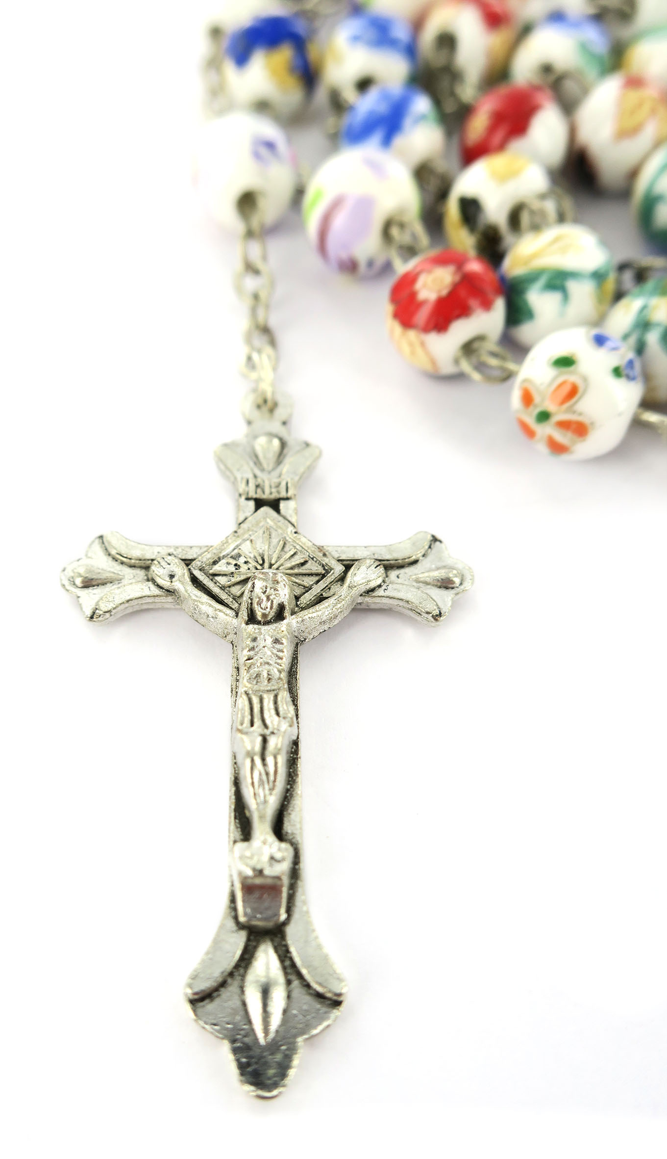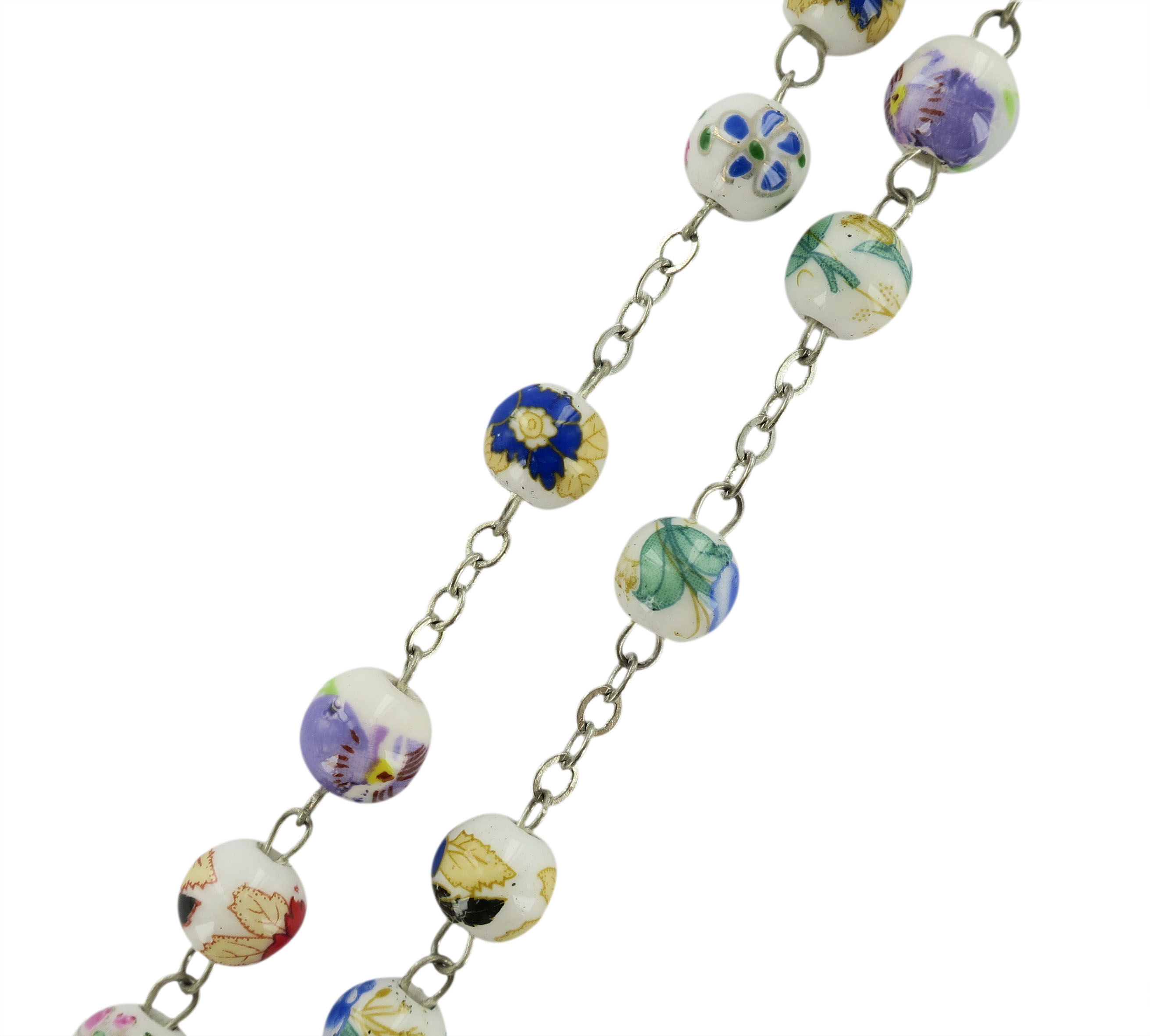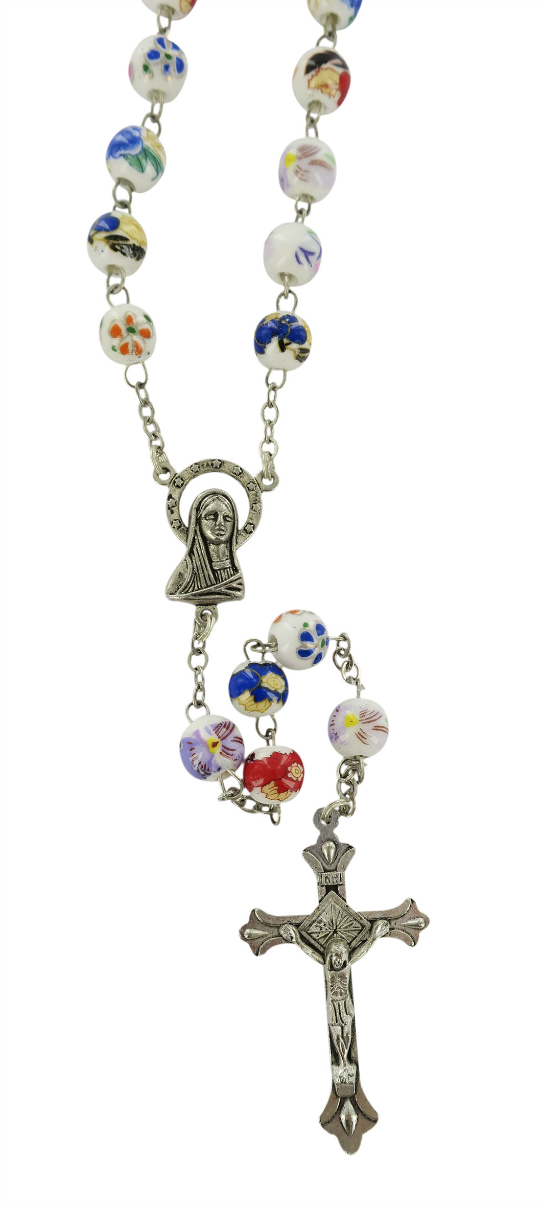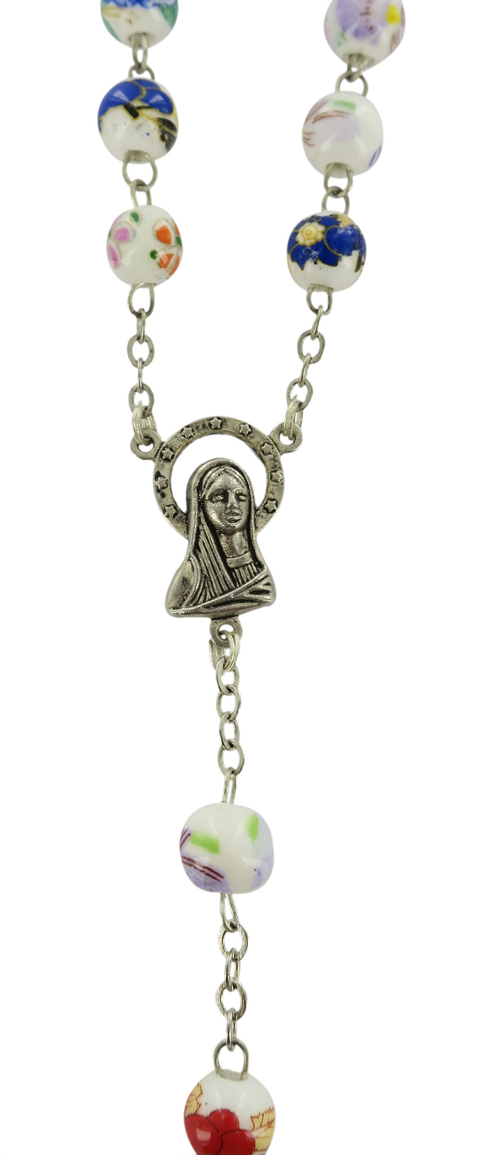 Rosario con grani tondi in ceramica bianca e decorazioni assortite mm 8.