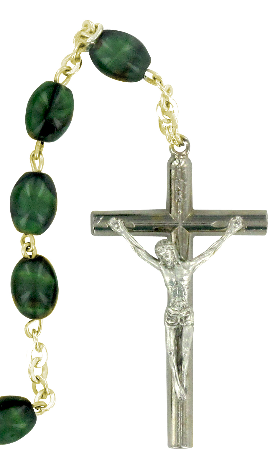 Rosario con legatura dorata fatta a mano con grani rotondi in vetro di colore verde, simil malachite.