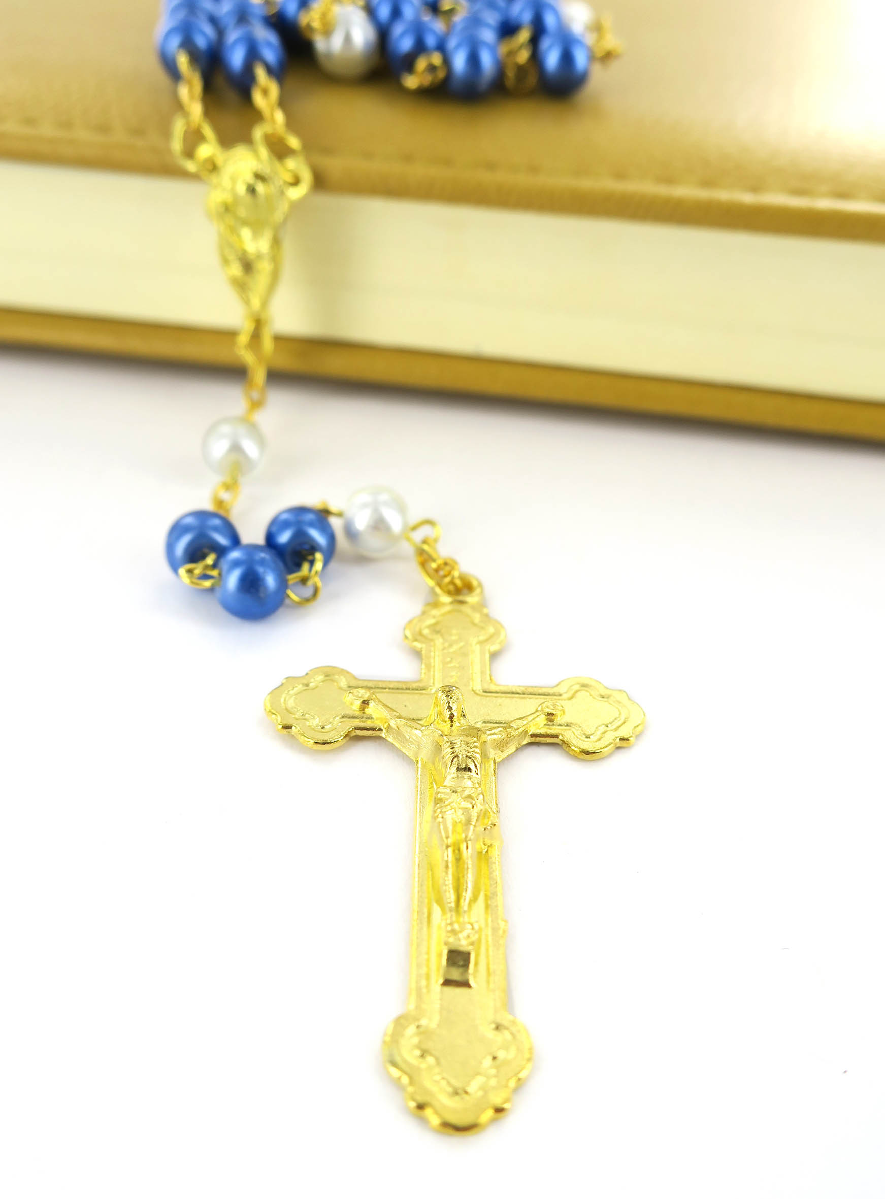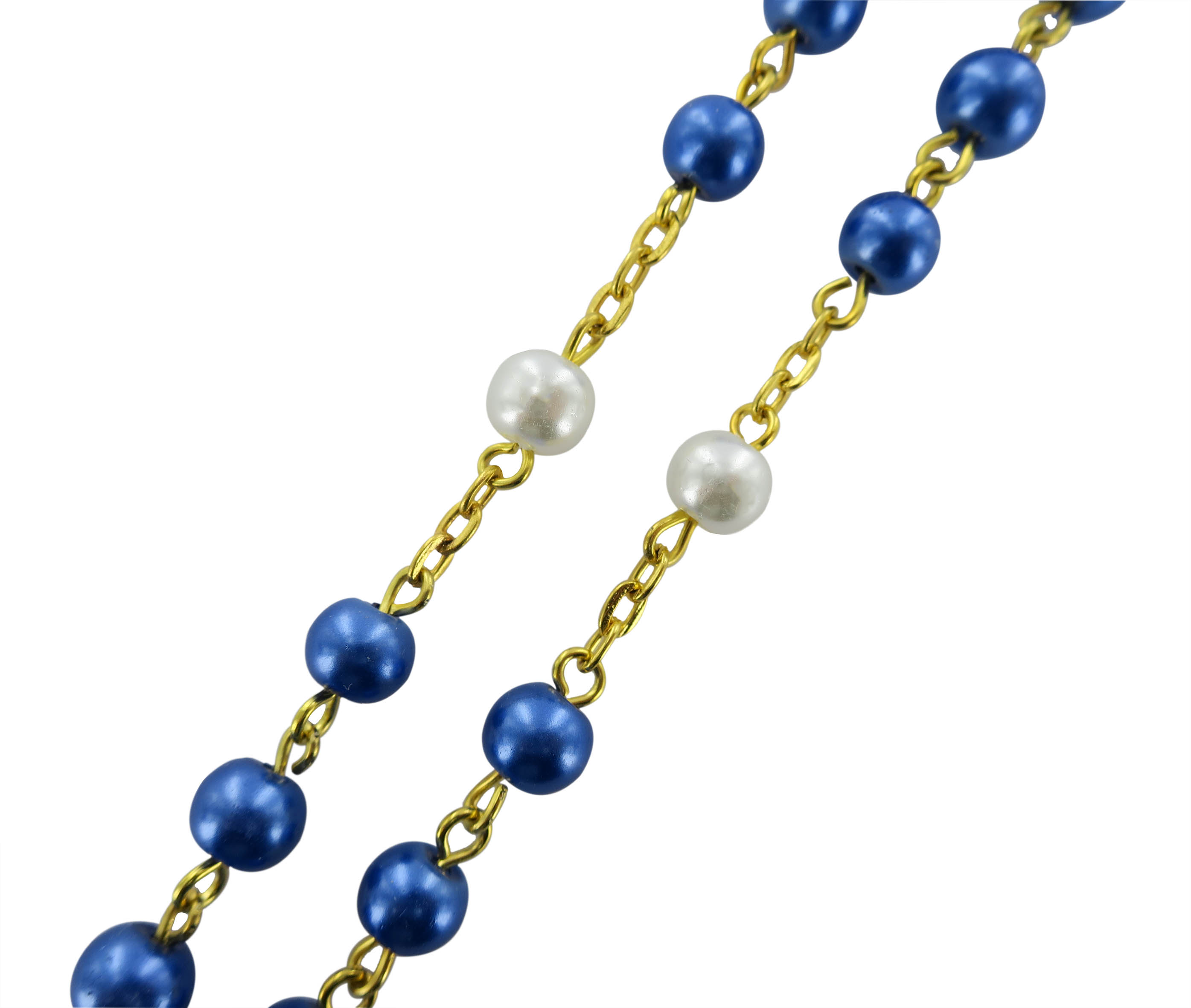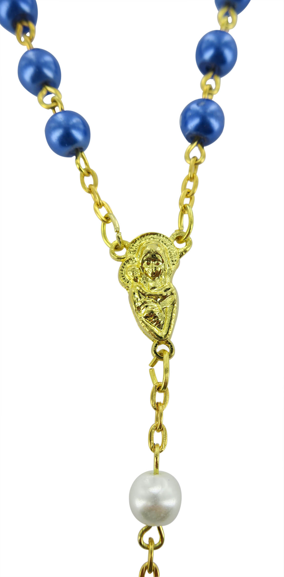 Rosario con grani tondi imitazione perla blu e pater bianchi di mm 6.