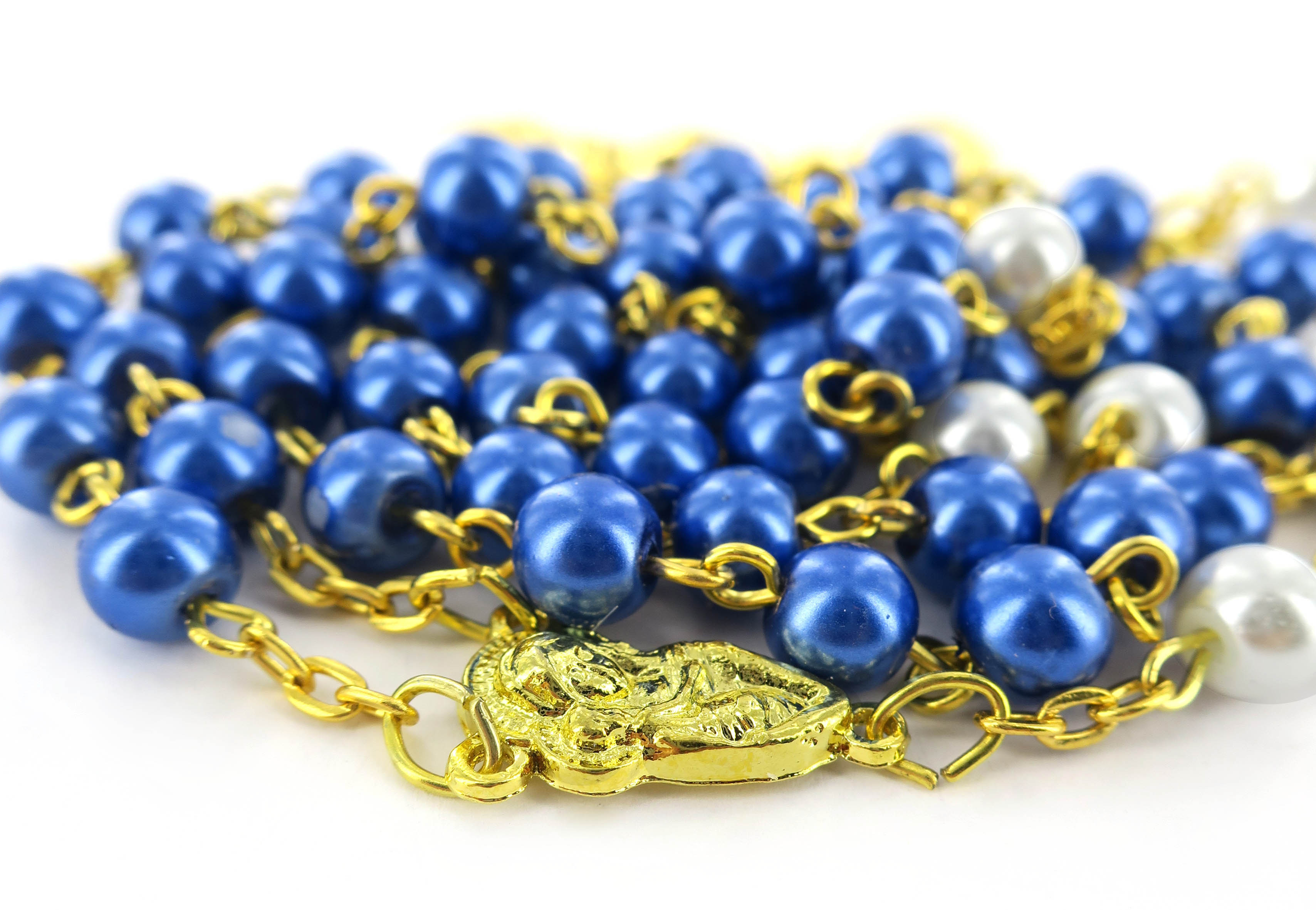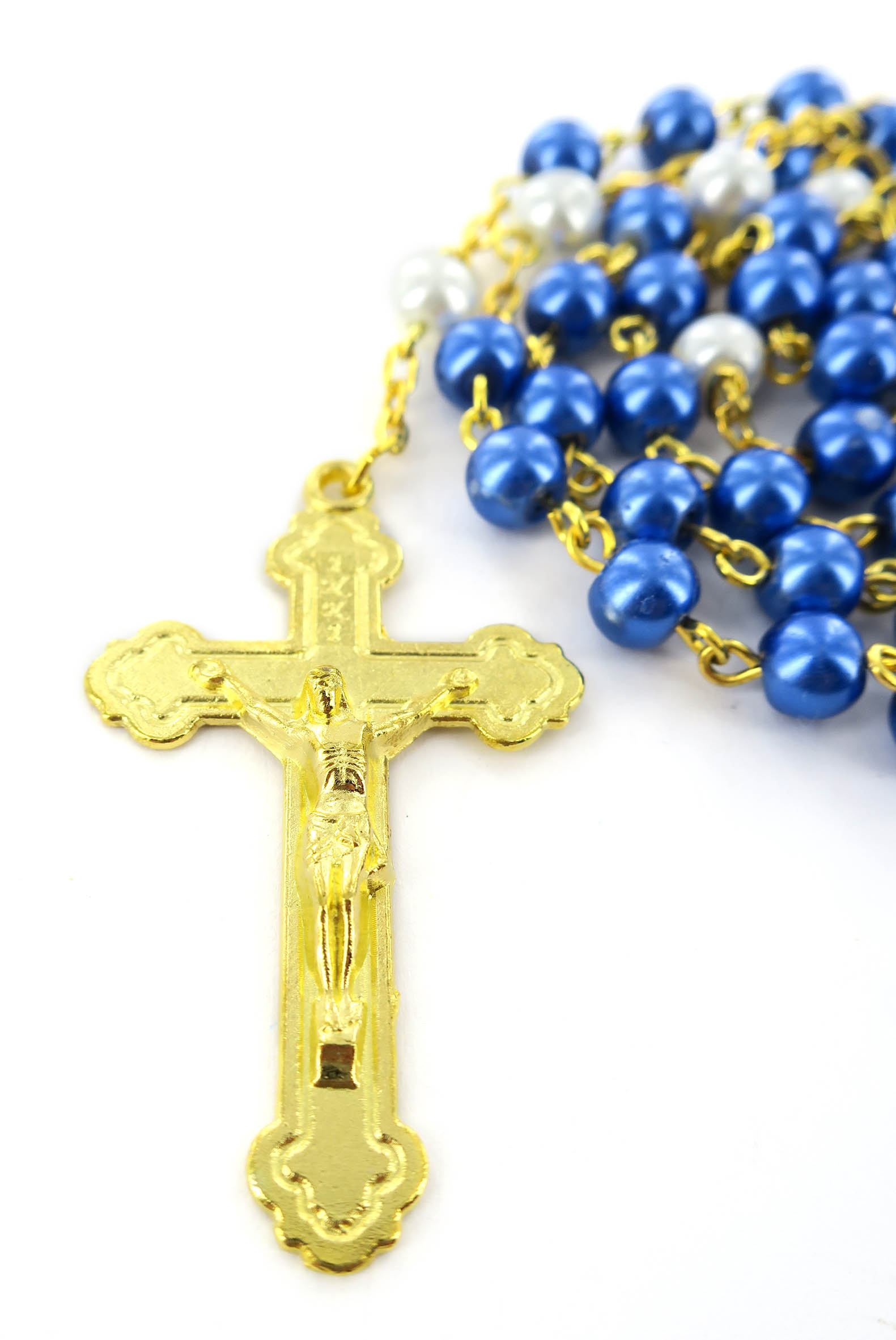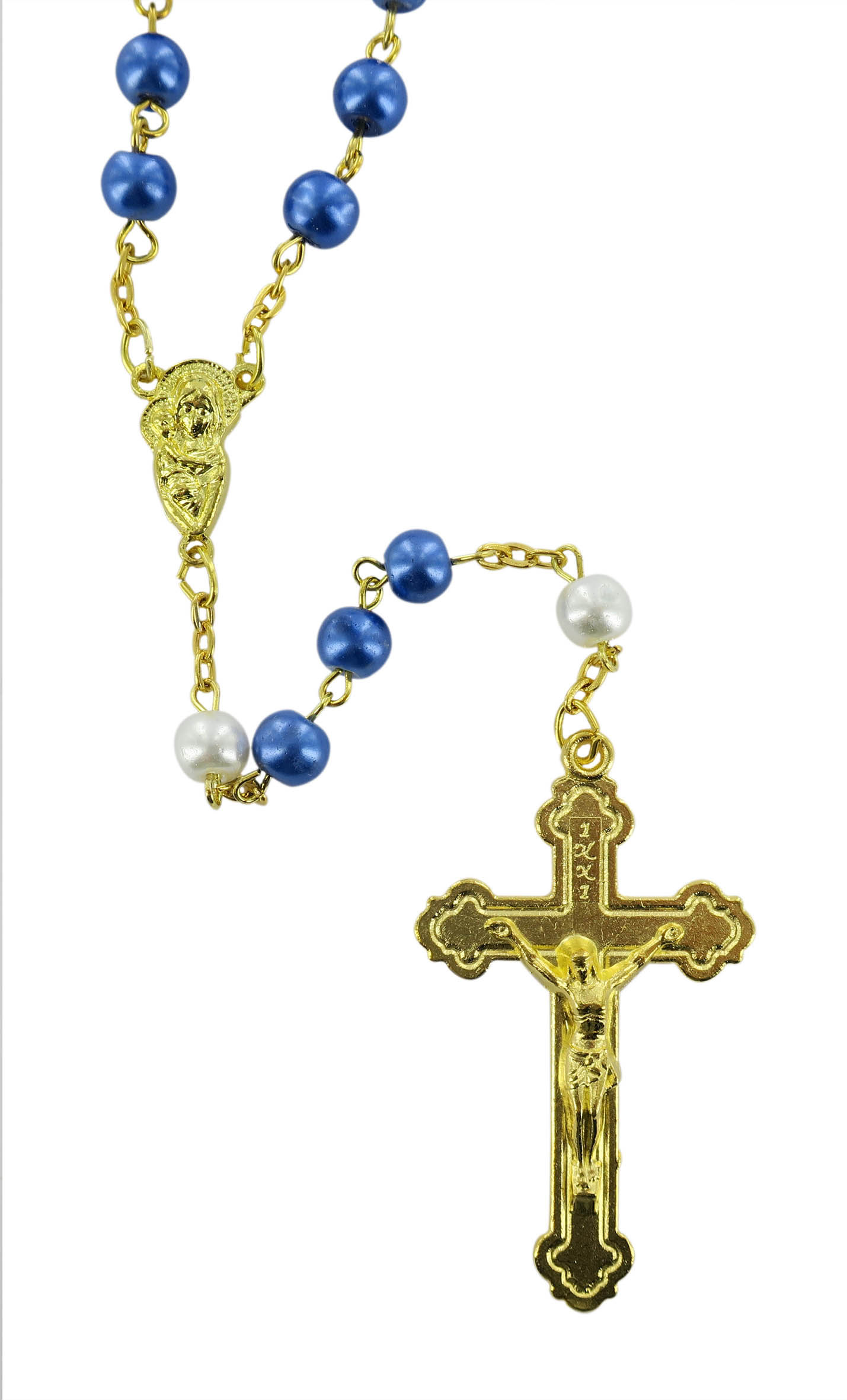 Rosario con grani tondi imitazione perla blu e pater bianchi di mm 6.
