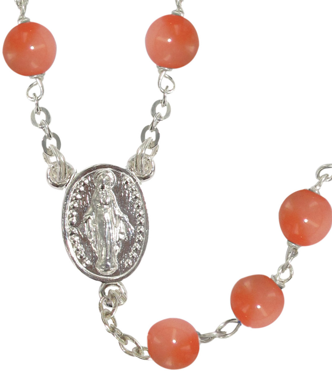 Rosario in vero corallo rosa mm 5 con legatura a mano in argento