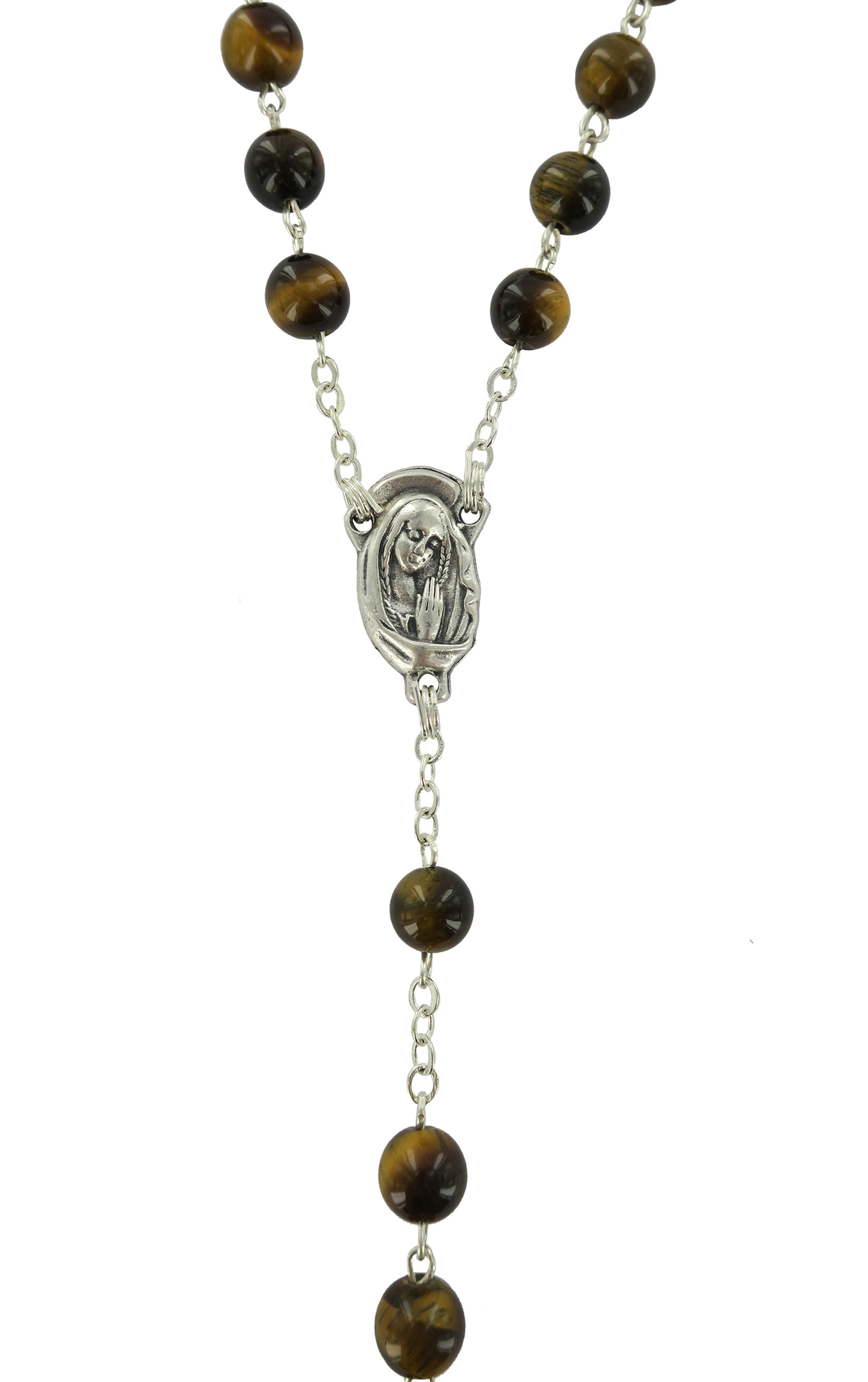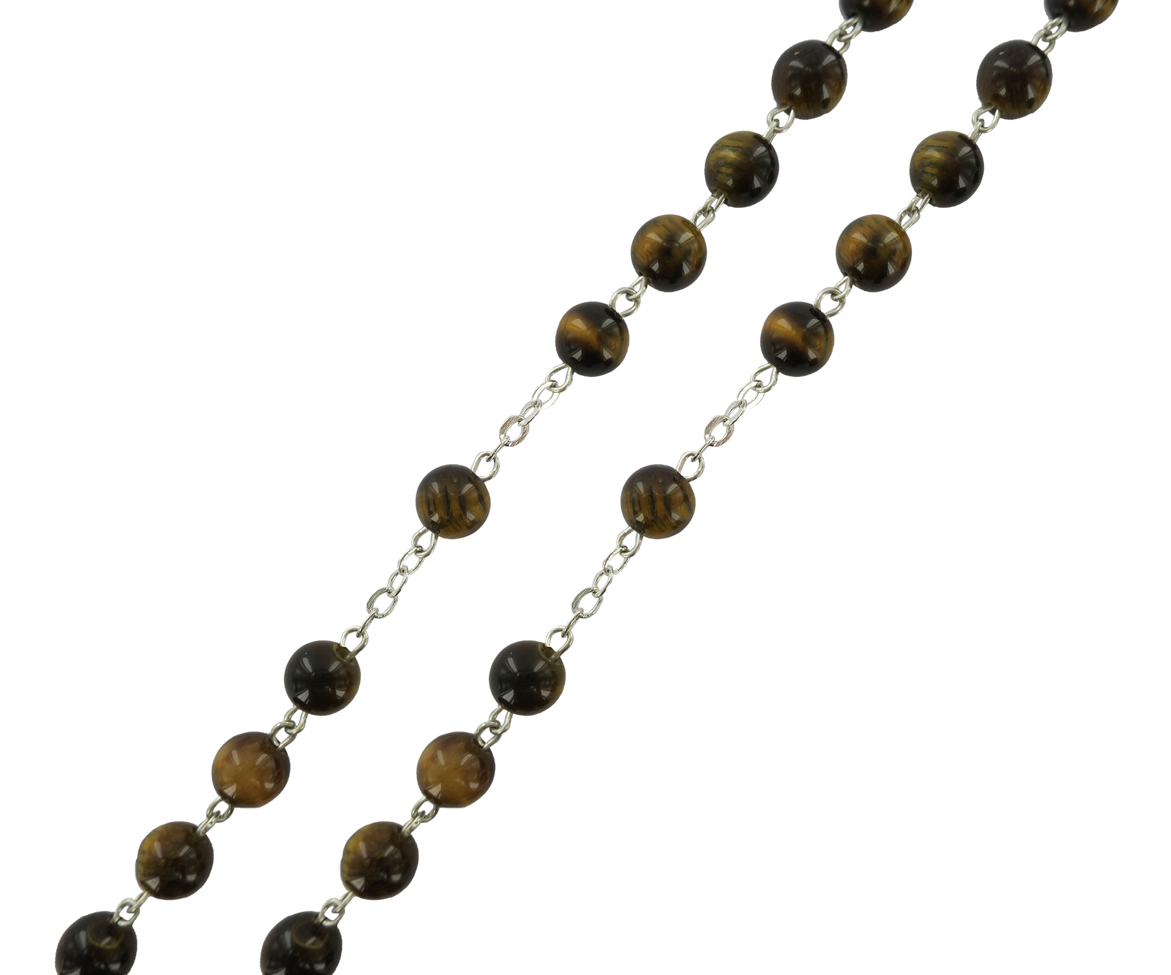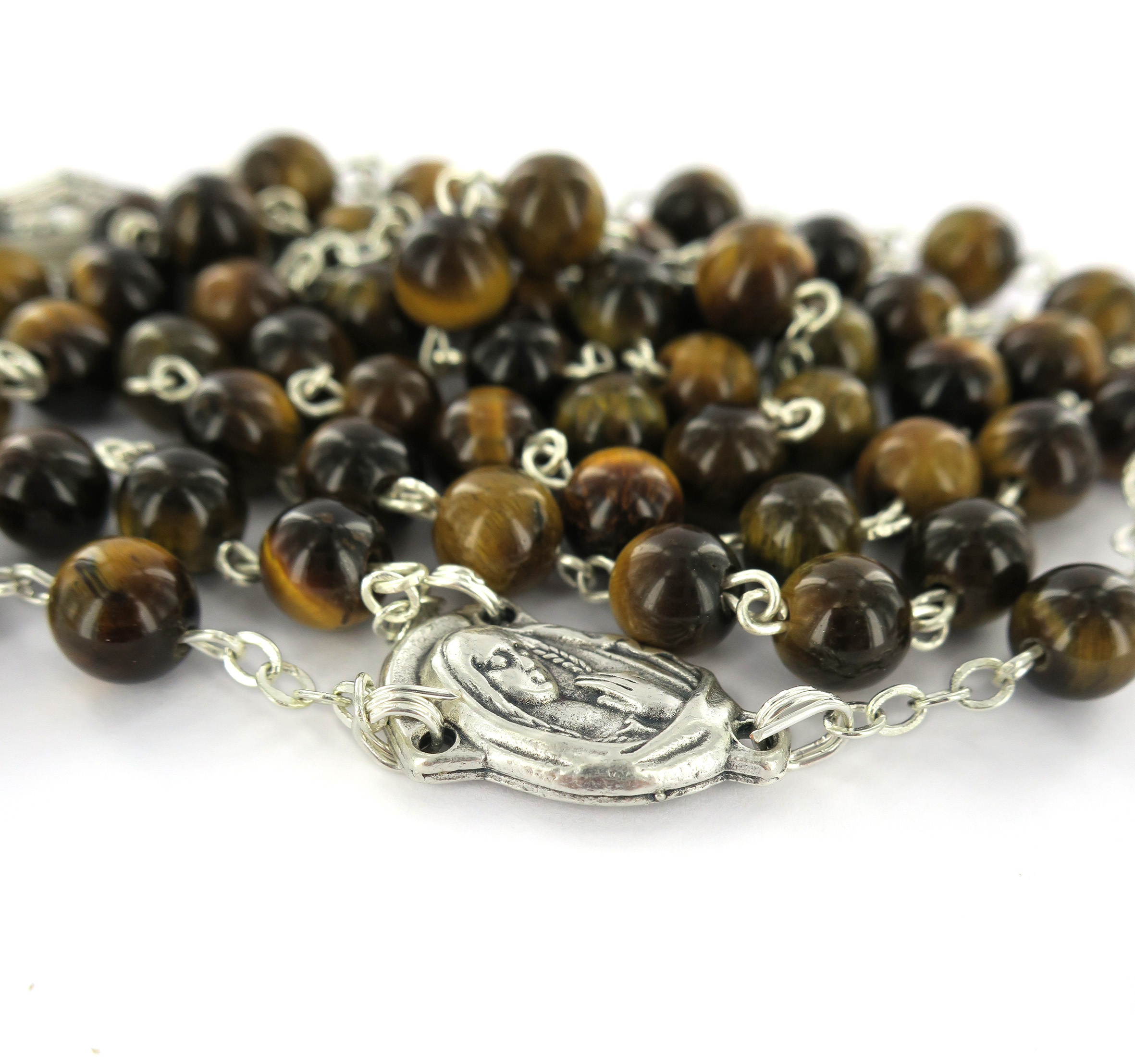 Il rosario è in legatura a mano con filo di metallo argentato, e i grani di mm 6 sono in vero occhio di tigre. Croce con Cristo riportato e crociera ovale con Madonnina pregante e su retro di essa vi è il Sacro Cuore di Gesù.